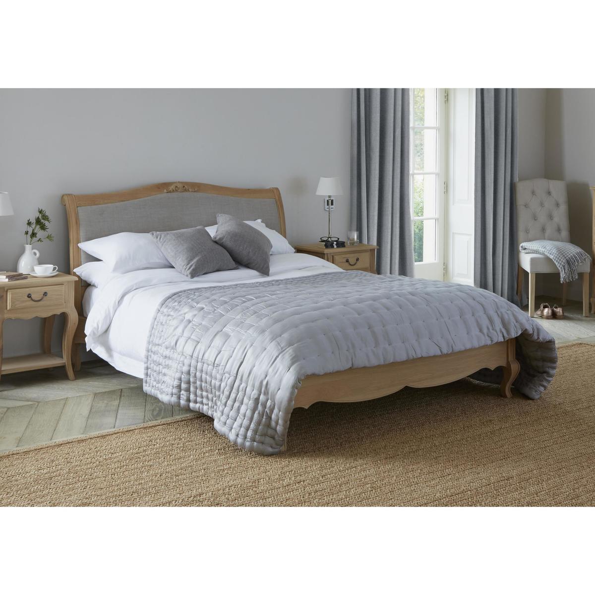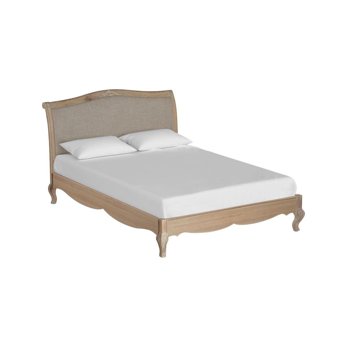 Headboard comes as one single piece. Transform your bedroom with the classic French style of the affordable Daphne bedframe. With scalloped edges and tapered legs, this great value bedframe features ornate details crafted from solid oak and oak veneers. The white oil finish reveals the true beauty of the wood’s natural grain while providing a protective layer. The curved and arched headboard features a simple yet elegant wooden frame and is padded and upholstered in a soft-textured sand coloured fabric. The sprung slatted base provides superb support for any type of mattress, not included. Finished by hand in the Cotswolds, the Daphne bedframe is part of the Daphne range of bedroom furniture and is available in Double, King and Super King sizes. Pair it with the Daphne 1 drawer bedside chest or, if you need more storage space, the Daphne 3 drawer bedside chest. Did you know? A natural wash paint finish allows the natural beauty of the wood grain to show through. Mattress available separately