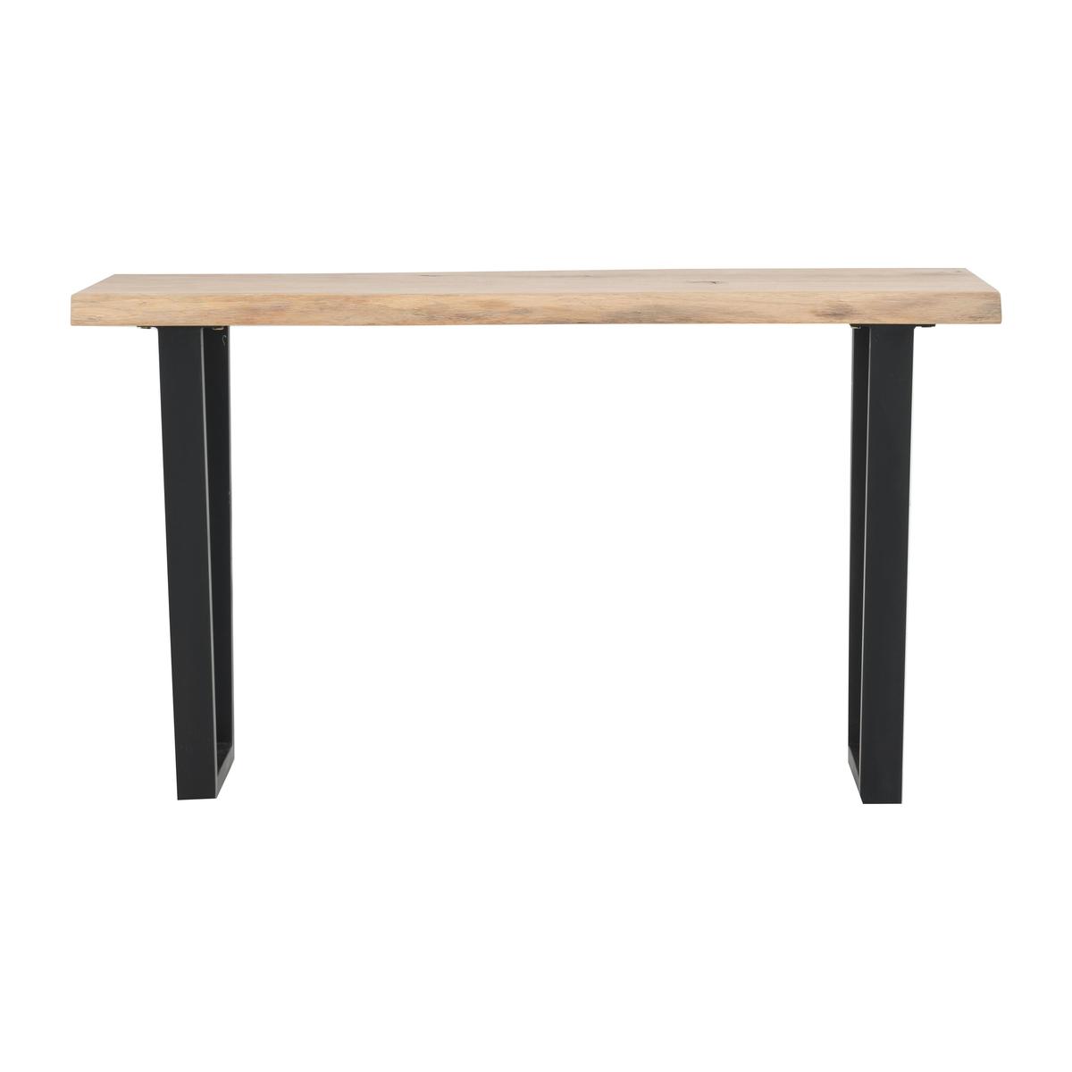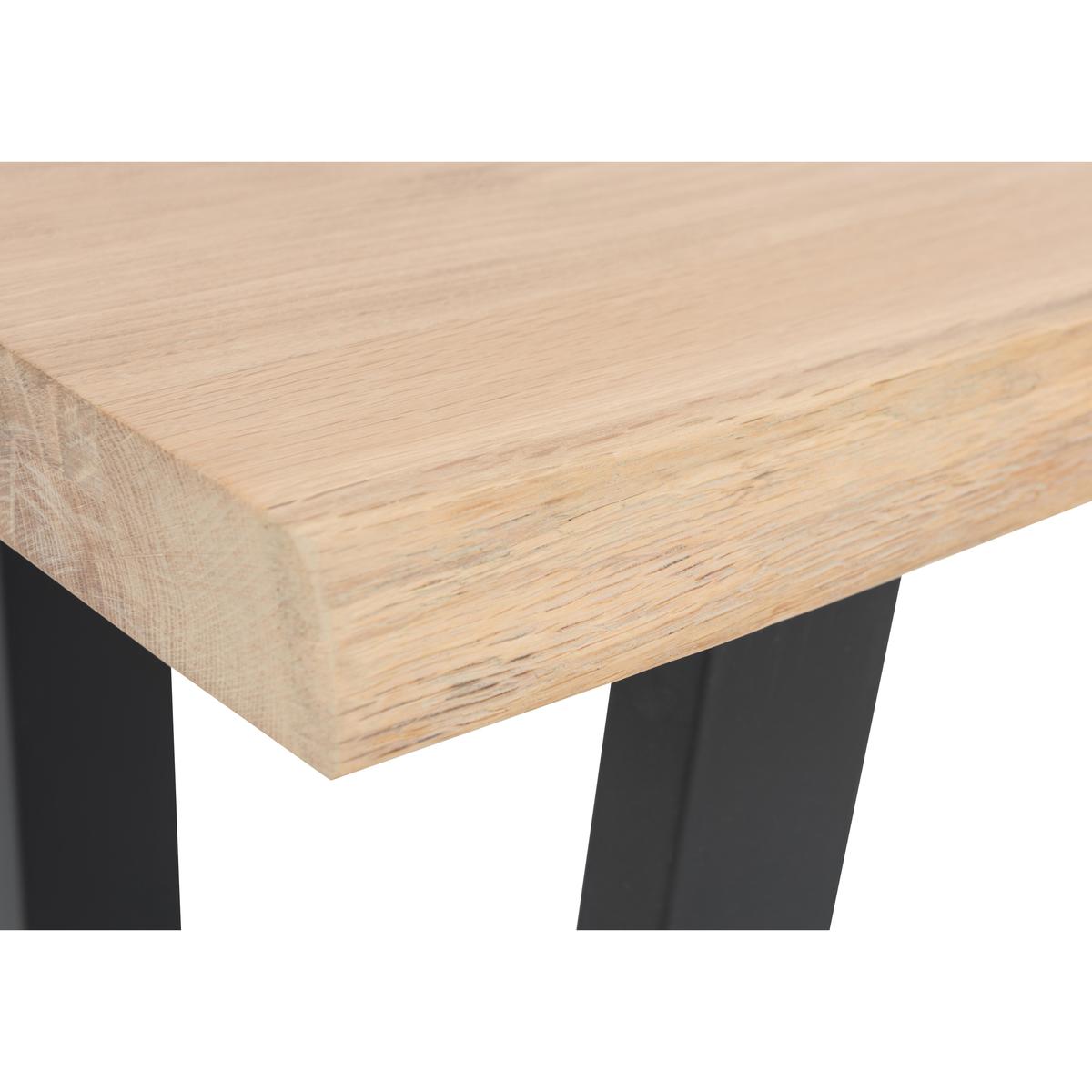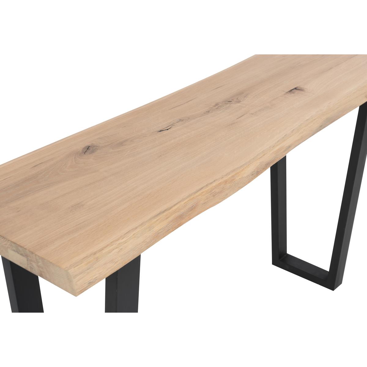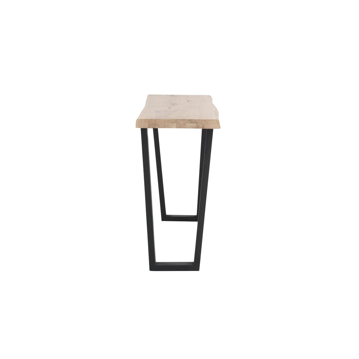 The modern industrial Jagger console table with metal legs celebrates the natural beauty of wood – the top of this hand-finished piece features the real live edge of the piece of oak from which it was constructed. Showcasing strong and sturdy lines, this console table has oak veneers with your choice of white oiled or waxed finish. Legs are U-shaped and made of black powder-coated steel. Perfect for living room, dining room or hallway, the Jagger console table with metal legs is part of the Jagger range. Please note: Each one-of-a-kind Jagger piece features a sustainably harvested solid live edge. A live edge shows the original lines of the wood’s trunk in a very raw state with characterful colour variations, knots and silvery markings known as medullary rays. As these aesthetic features are not always practical, we fill them to create a smooth waxed surface that’s also easier to care for.