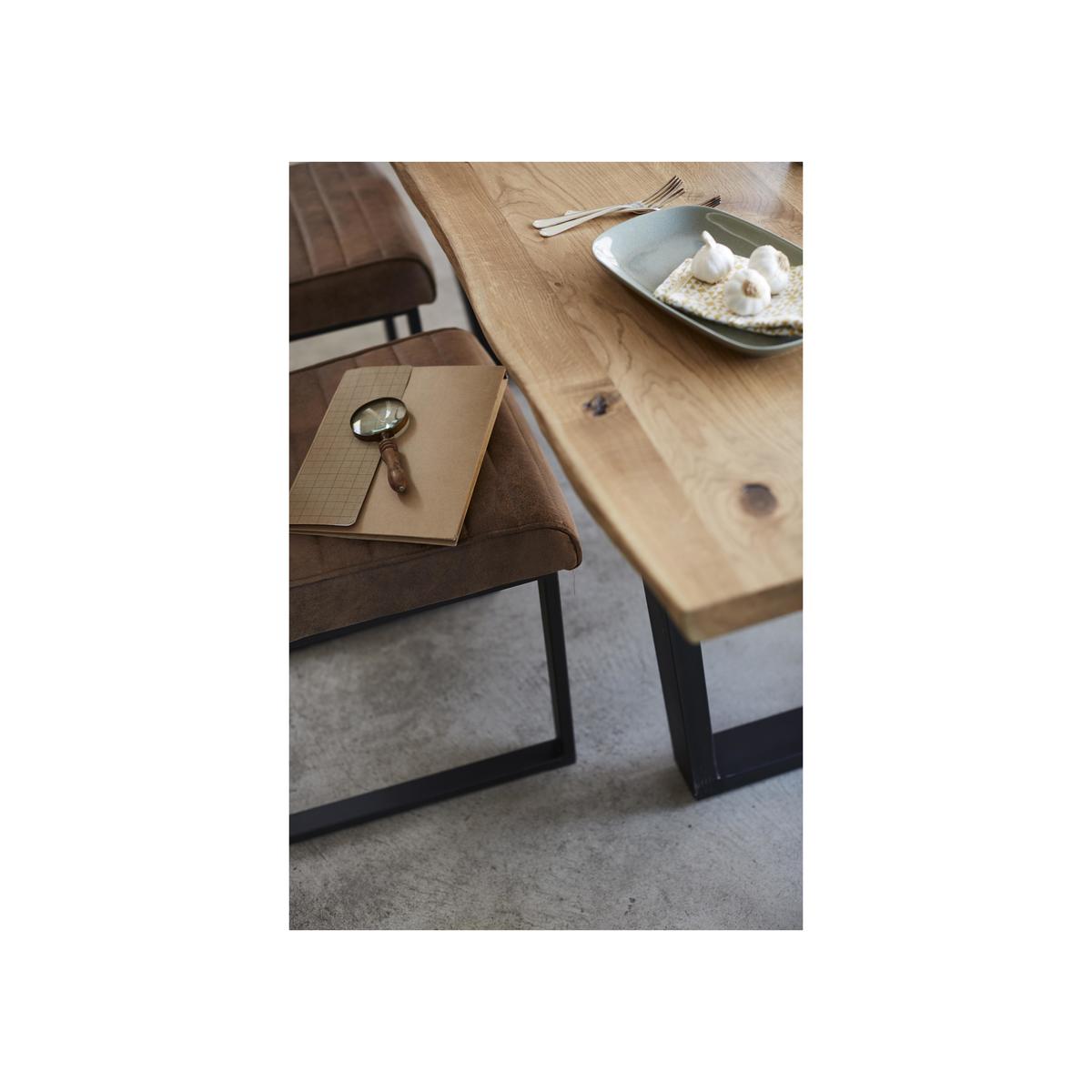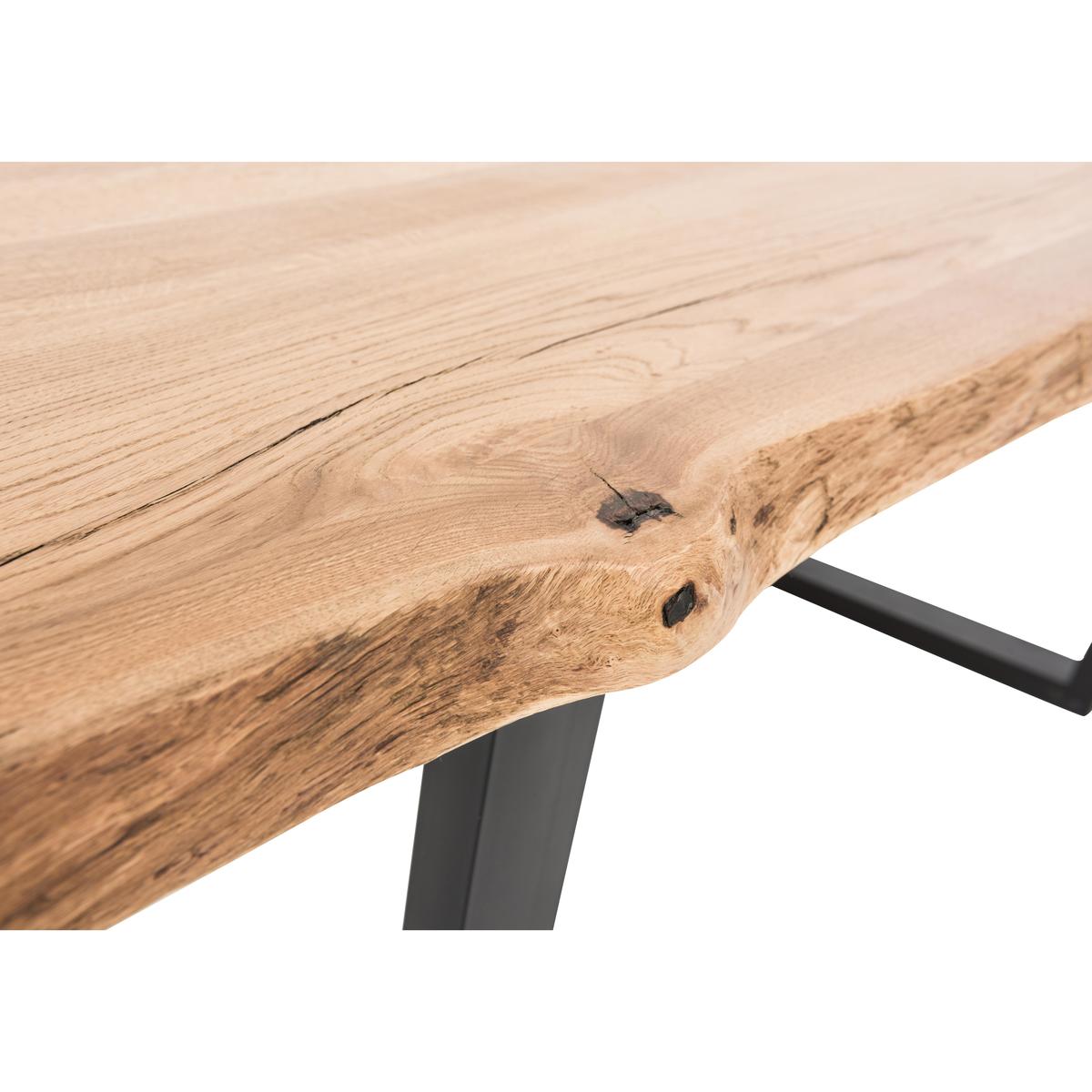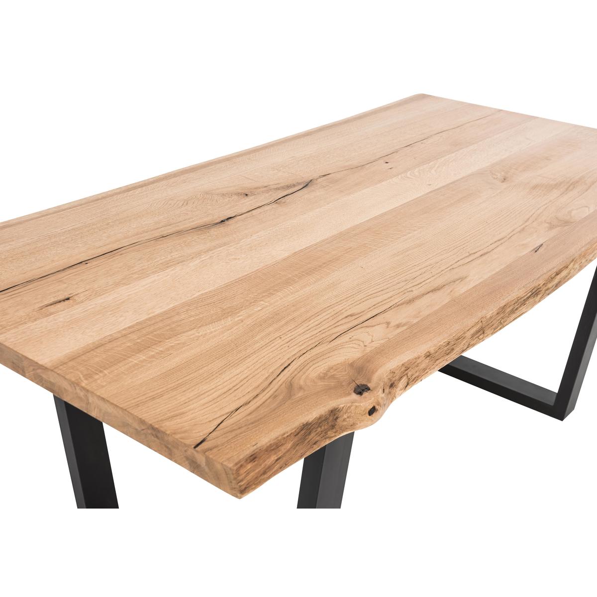 Showcasing the popular industrial trend, the Jagger dining table with metal legs is contemporary and stylish. Available in three sizes, seating 6, 8 or 10, this solid wood, hand-finished table has a stunning live edge and your choice of white oiled or waxed oak veneer top. The U-shaped base is made of powder-coated steel painted black. The Jagger dining table with metal legs is part of the Jagger range and is also available with solid oak block-style legs. Call 0800 804 8879 to learn more. Please note: Each one-of-a-kind Jagger piece features a sustainably harvested solid live edge. A live edge shows the original lines of the wood’s trunk in a very raw state with characterful colour variations, knots and silvery markings known as medullary rays. As these aesthetic features are not always practical for dining, we fill them to create a smooth waxed surface that’s also easier to care for.
