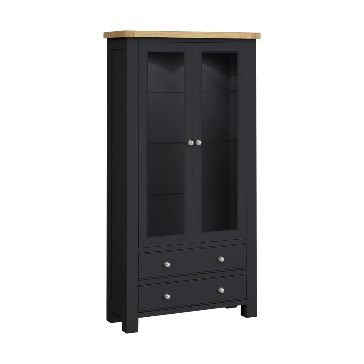 The Somerset display cabinet is a beautiful way to show off your favourite things. Finished in the UK and made from solid oak, this display cabinet has an abundance of storage. The main compartment has interior lighting and three adjustable glass shelves behind two soft-close glass doors. Two deep lower drawers provide handy closed storage. Solid square-edged legs create a paneled effect on the sides, and it’s neatly finished with an overhanging top. This cabinet successfully combines the gently rustic feel of solid oak, with a sleeker, more modern finish. Choose oak with a natural oil or satin lacquer testament or a painted finish in one of six natural, neutral colours with oak top. The Somerset display cabinet is part of the extensive Somerset range of display, storage and dining room pieces. If you’re short on storage, consider the Somerset large hutch dresser.