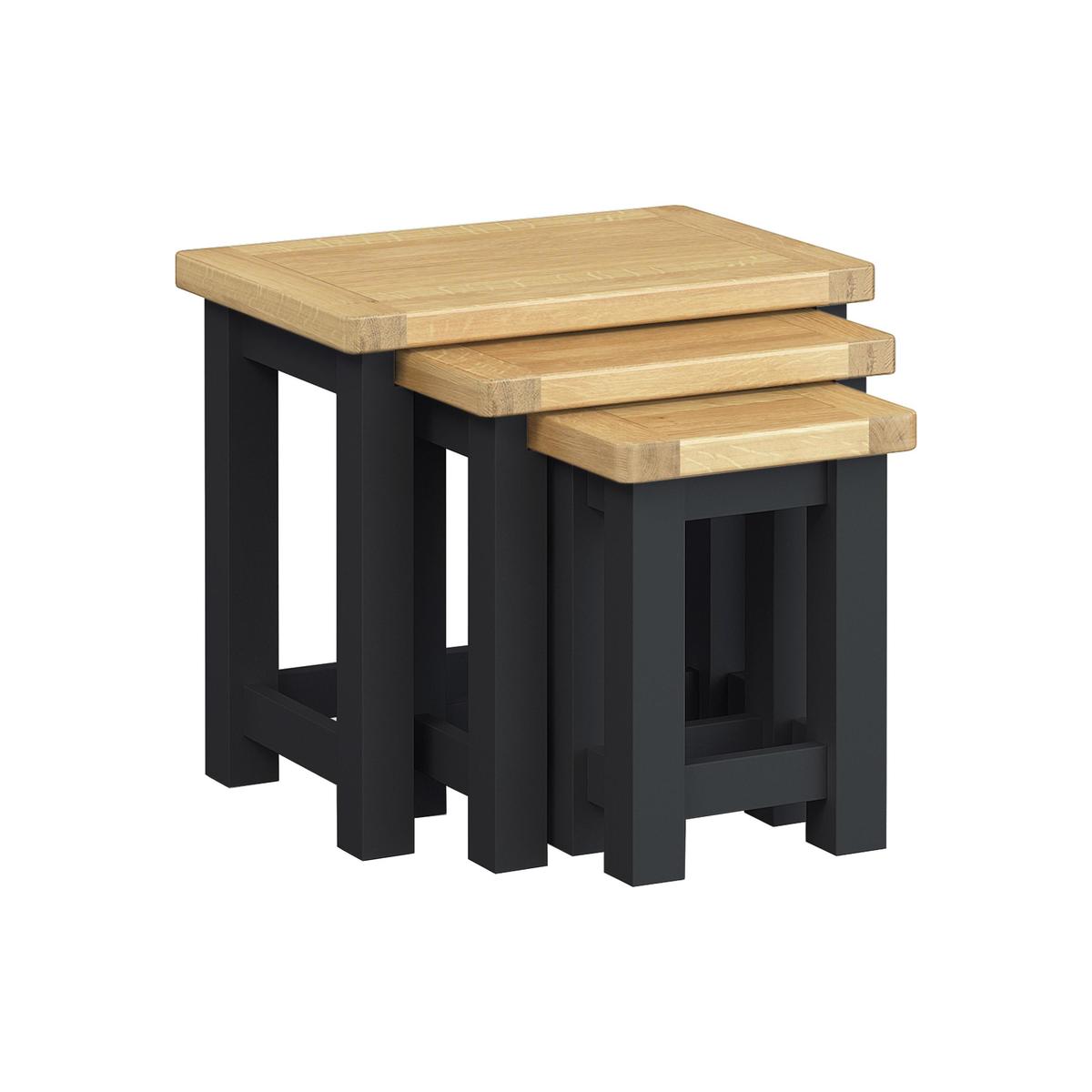 Space-saving and stylish, the Somerset nest of tables is the perfect solution for a smaller living room. Keep them neatly nested until you need an extra end table or lamp table. Crafted from solid oak and beautifully finished in the UK, this charming set of three tables has strong clean lines, sturdy square legs and neat oak veneer overhanging tops. Although gently rustic in style, the finish is smooth and modern. Choose from oak with a natural oil or satin lacquer, or painted with oak tops. The painted finish is available in six sophisticated neutral shades. The Somerset nest of tables is part of the Somerset collection of occasional and dining furniture that includes more space-saving pieces like the Somerset console table and the Somerset mini sideboard.