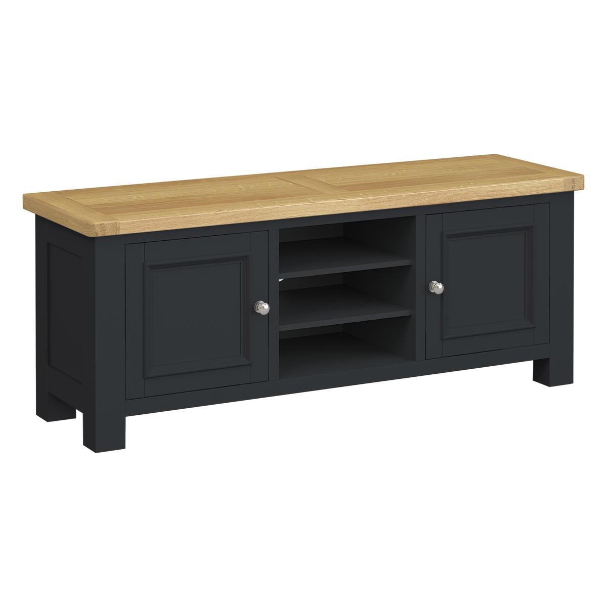 Offering spacious media storage, the Somerset TV unit has a gently rustic feel with a smooth modern finish. Crafted from solid oak and oak veneers and finished in the UK, it has clean lines and square edges along with stylish details like an overhanging top and panelled-effect soft-close cupboard doors. Choose between an all oak look – with either a natural oil or a satin lacquer finish – and a painted finish offered in a choice of six sophisticated colours and with an oak top. There’s plenty of storage capacity for all your media components inside the two cupboards, each with a shelf, and on the three open shelves. The Somerset TV unit is one of many stylish storage pieces in the Somerset range. It works beautifully with any one of the three Somerset sideboards or the Somerset coffee table.