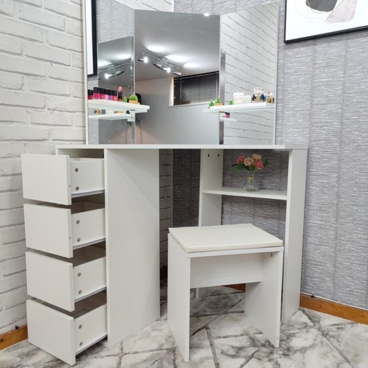 Corner 4 Drawers White Make Up Dressing Table Set with 3 Mirror and Stool - White