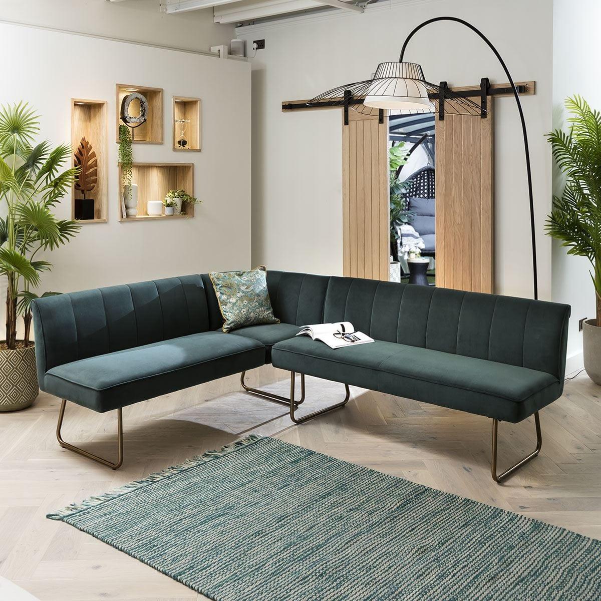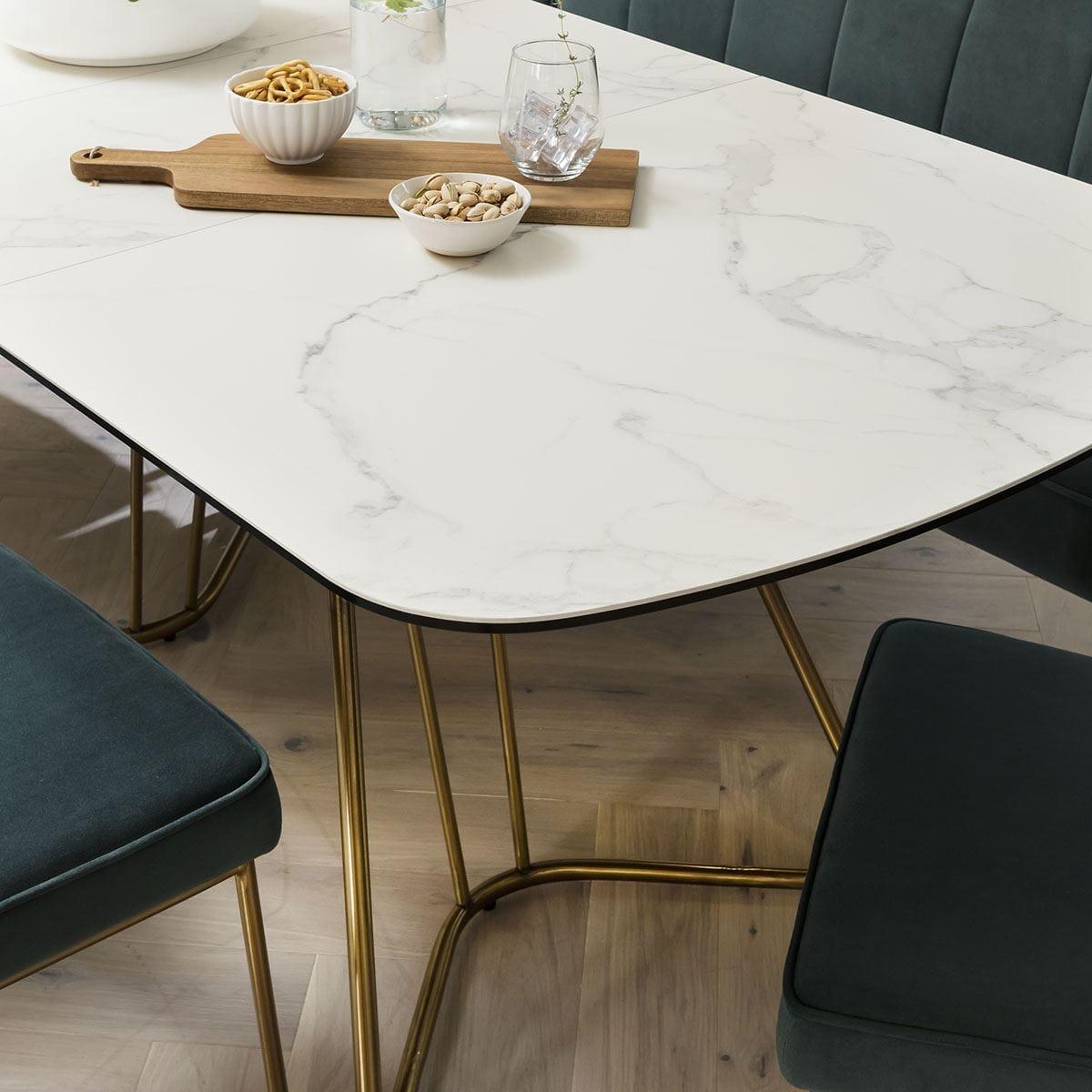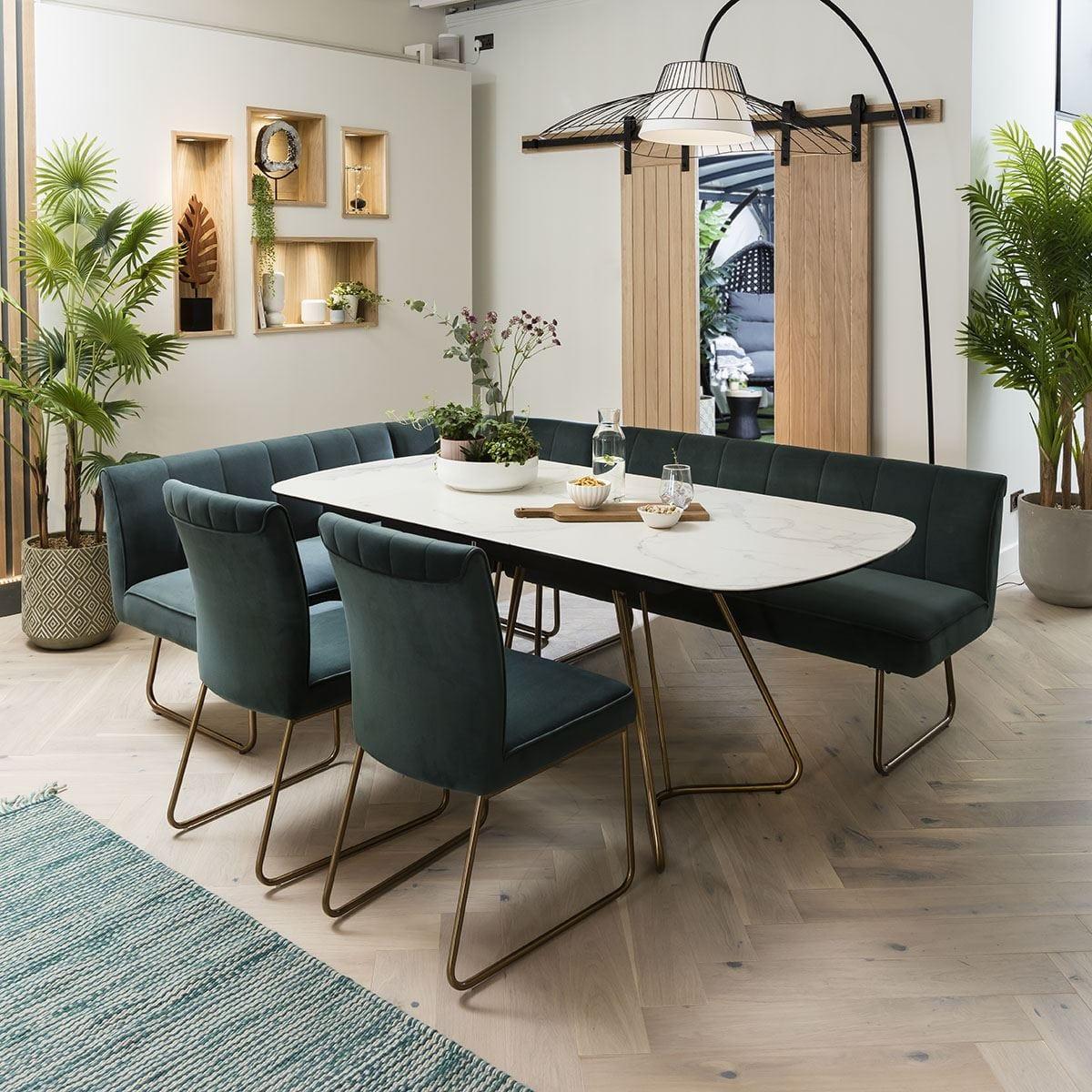 The Deco Corner Dining Bench Set is a versatile and stylish seating solution for any dining space. This corner bench set can comfortably seat up to 7-8 people. Bench dining sets offer a perfect gathering spot for friends and family. The premium teal velvet upholstery is luxurious in its richness and vibrancy. Crafted with attention to detail, our Corner Dining Bench Set features a sleek brass coloured metal tubular frame. You can easily configure it to fit your space by choosing between left or right-hand placement. This adaptability allows you to optimise your dining area, no matter the size or layout of your room. The soft cushioning enhances the overall comfort, allowing you to enjoy a relaxed and enjoyable dining experience every time. The Deco dining table is a perfect blend of functionality and style. With its auto-lift feature, extending the table has never been easier. Simply pull one side, and watch as the extension effortlessly pops up into place, giving you extra space in a matter of seconds. Crafted with utmost precision, this table boasts a premium white ceramic top with a captivating textured matte marble-effect finish. Not only does it exude elegance, but it also offers remarkable durability. The scratch, heat, and stain-resistant ceramic ensures that your table remains in pristine condition for years to come, even with everyday use. This corner dining set includes 2 dining chairs, a perfect addition to elevate your dining experience. With elegant line tufting detail on the backrest, these chairs exude sophistication and style. Inspired by the timeless beauty of the deco era, they effortlessly blend vintage charm with modern aesthetics. W174cm D212cm H82cm Seat Height 49cm Seat Depth 46cm Corner Bench Dining Set with Ceramic Marble Table including 2 chairs