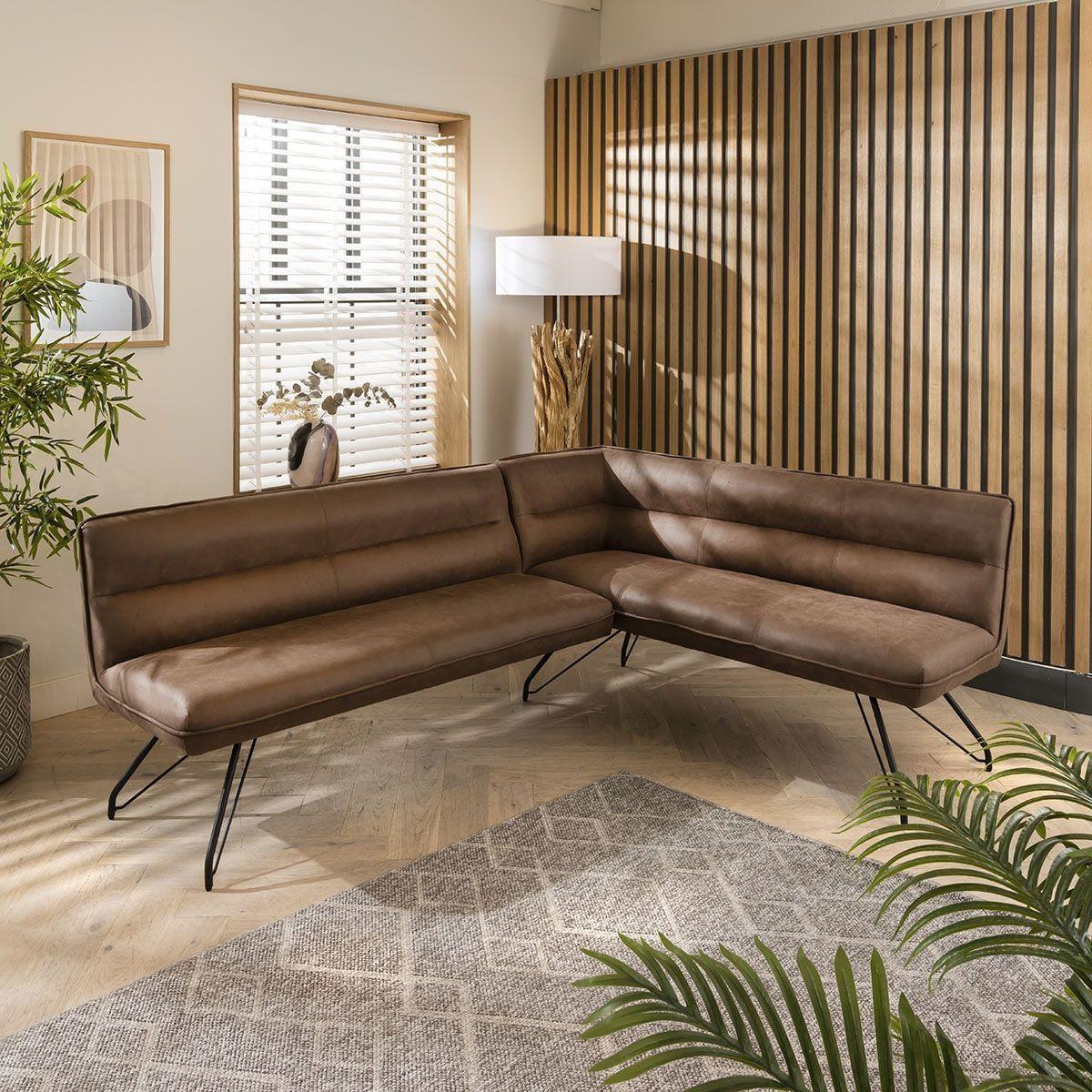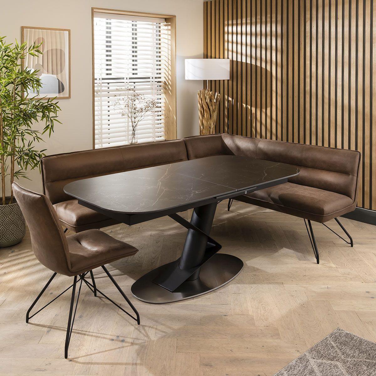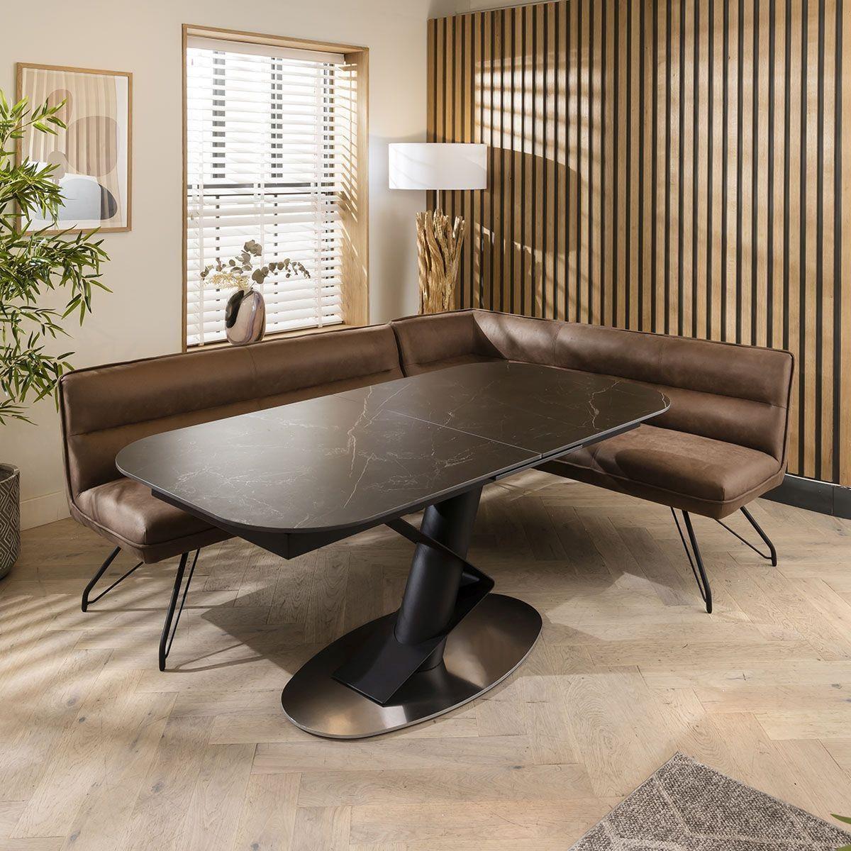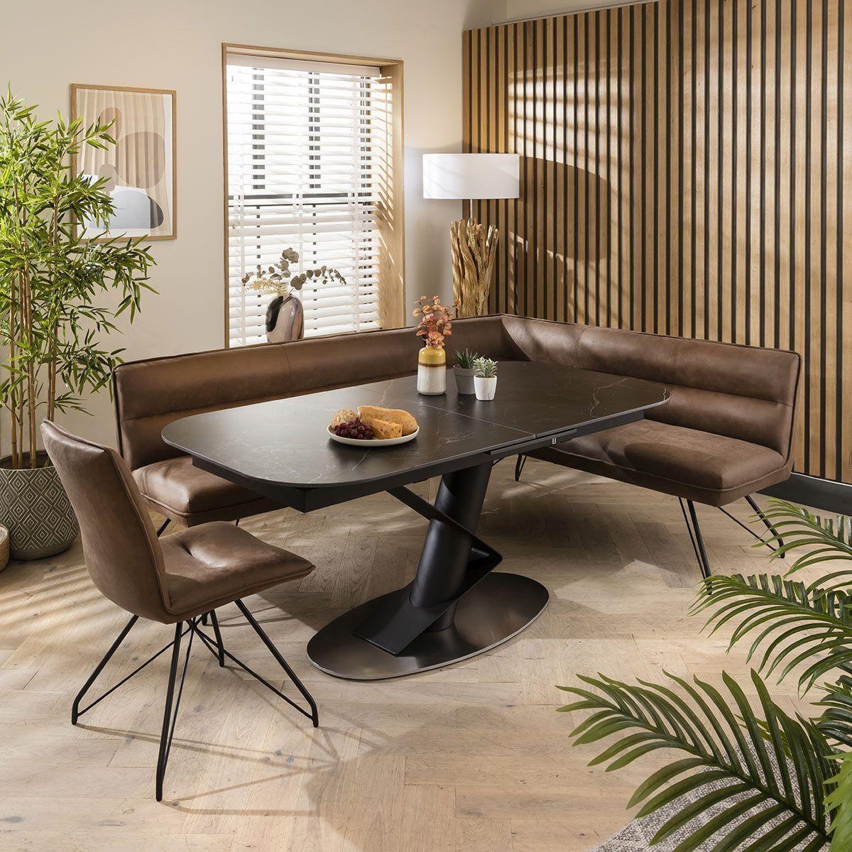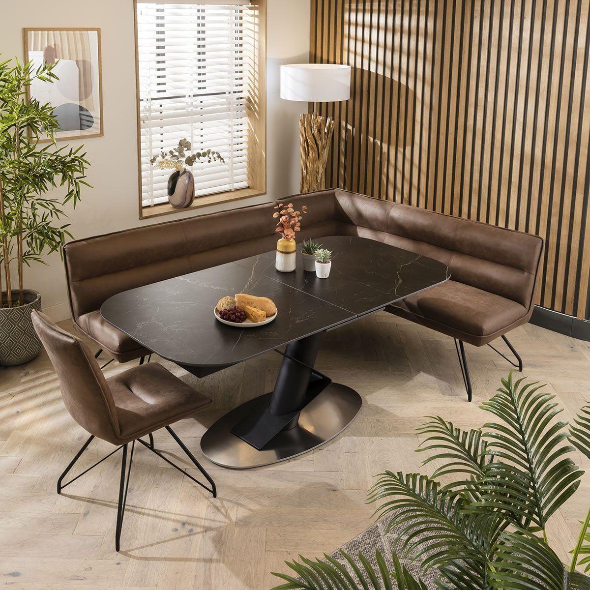 The Detroit Left-Hand Corner Dining Set is the perfect addition to your dining area for a comfortable and stylish seating experience. This spacious corner dining set seats up to 6 people for sociable dining eperience with loved ones. The corner dining bench set is covered in a hardwearing brown leather-look fabric. Designed with your comfort in mind, our Corner Dining Bench is upholstered in a luxurious premium bronze brown leather-look fabric. Not only does it add a touch of industrial-chic to your space, but it also provides a cosy seating surface that invites you to relax and enjoy your meals. The soft cushioning ensures a comfortable dining experience, allowing you to linger at the table long after the last bite. The dining table is the perfect centerpiece for any stylish home. With its auto-lift feature, extending the table is a breeze - simply pull one side and watch as the extension effortlessly pops into place. Crafted with a premium black ceramic, the matte marble-effect top exudes sophistication while providing scratch, heat, and stain resistance. Supported by a sleek black powder-coated pedestal base, this table extends from 180cm to 220cm, ensuring ample space for all your dining needs. This set includes 1 dining chair, a perfect blend of elegance and comfort. Crafted with hardwearing brown leather-look upholstery, the chair exudes luxury and sophistication. The clean design, accentuated by simple tufting details, adds a touch of refined style to any dining space. W166cm D212cm H85cm Seat Height 49cm, Seat Depth 47cm Corner Bench Dining Set with Ceramic Marble Table including 1 chair