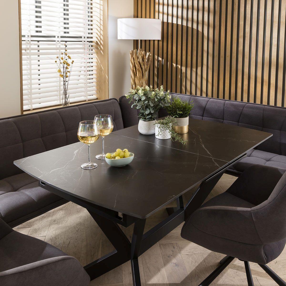 The exquisite Davina left-hand corner dining bench set, a perfect blend of style and functionality. Designed to comfortably seat up to 7-8 people, this versatile corner dining set creates a cosy gathering spot for family and friends. For added comfort, this corner dining bench set is covered in a premium grey velvet. The dining bench is upholstered in a premium dark grey fabric, offering a touch of sophistication to any dining space. The luxurious material not only adds elegance but also ensures durability, allowing for long-lasting enjoyment. The 150-200cm extending dining table with its auto-lift feature, extending this table has never been easier. Just pull one side, and watch as the extension effortlessly pops into place, providing you with additional space for those special gatherings. Crafted with a premium black ceramic top featuring a sophisticated matte marble-effect finish, this table not only exudes elegance but also boasts exceptional durability. The scratch, heat, and stain-resistant ceramic surface ensures long-lasting beauty, while the black powder coated metal legs add a touch of modern edginess This corner dining bench set includes 2 carver dining chairs. Crafted with meticulous attention to detail, these chairs are designed to elevate your dining experience. With their luxurious cushioning and rich dark grey velvet upholstery, these chairs offer a touch of opulence to any space. W226cm D169cm H84cm Seat Height 49cm, Seat Depth 45cm Corner Bench Dining Set with Ceramic Marble Table including 2 chairs