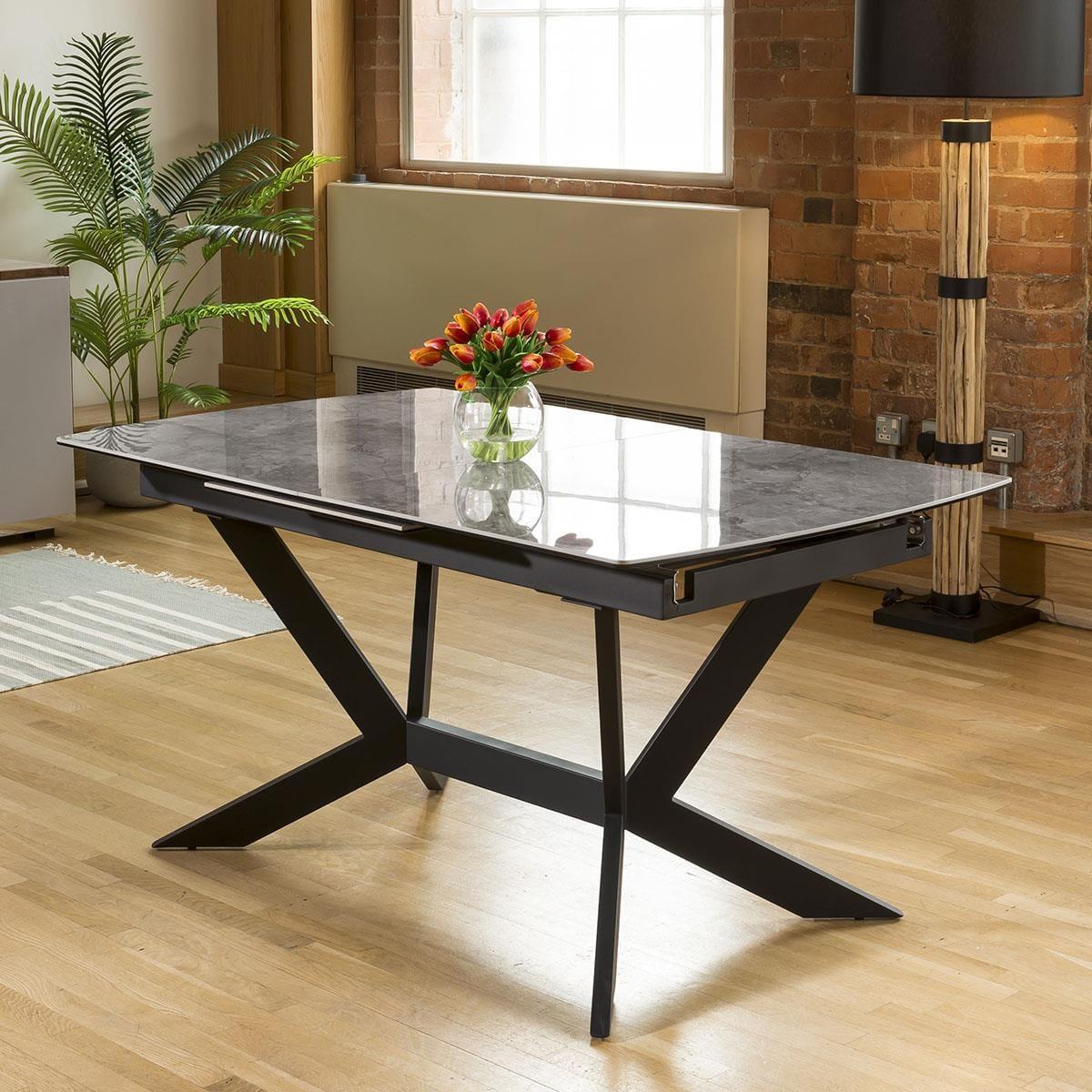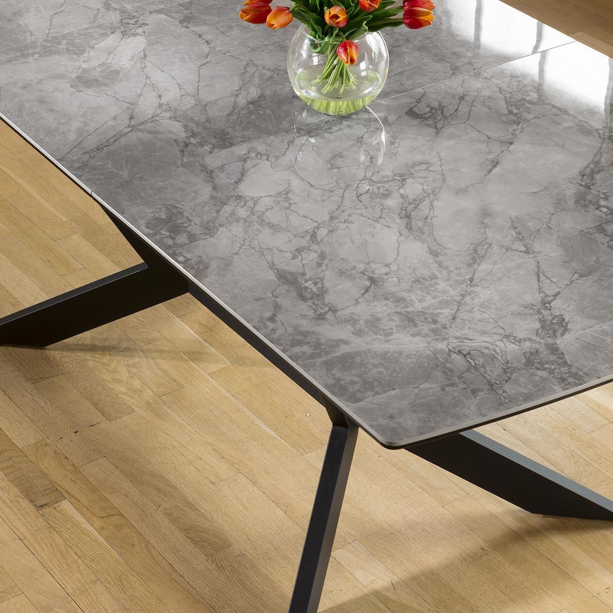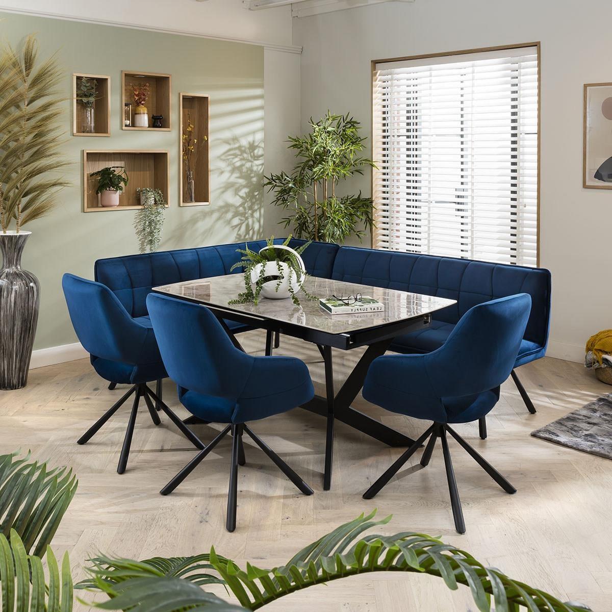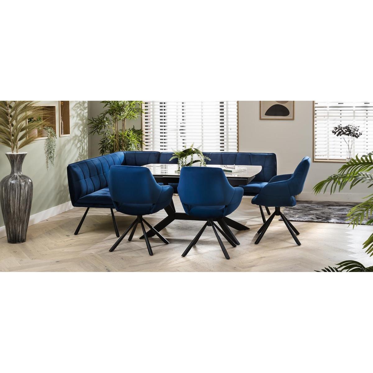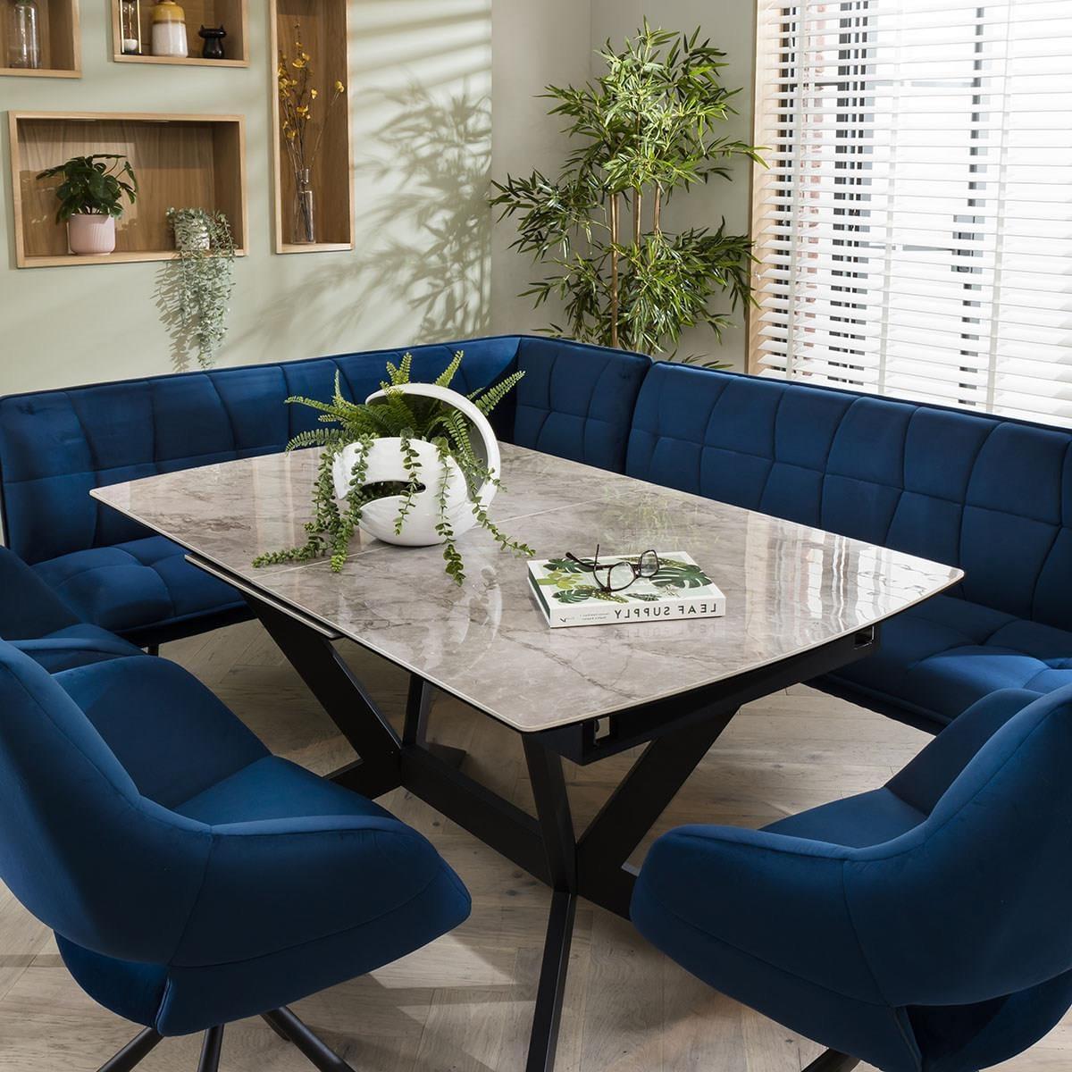 The exquisite Davina right-hand corner dining bench set, a perfect blend of style and functionality. Designed to comfortably seat up to 8 people, this versatile corner dining set creates a cosy gathering spot for family and friends. For added comfort, the corner dining bench set is covered in a premium blue velvet. The dining bench is upholstered in a premium rich blue fabric, offering a touch of sophistication to any dining space. The luxurious material not only adds elegance but also ensures durability, allowing for long-lasting enjoyment. The 150-200cm extending dining table with its auto-lift feature, extending this table has never been easier. Just pull one side, and watch as the extension effortlessly pops into place, providing you with additional space for those special gatherings. Crafted with a premium grey ceramic top featuring a sophisticated glossy marble-effect finish, this table not only exudes elegance but also boasts exceptional durability. The scratch, heat, and stain-resistant ceramic surface ensures long-lasting beauty, while the black powder coated metal legs add a touch of modern edginess This corner dining bench set includes 3 carver dining chairs. Crafted with meticulous attention to detail, these chairs are designed to elevate your dining experience. With their luxurious cushioning and captivating blue velvet upholstery, these chairs offer a touch of opulence to any space. W226cm D169cm H84cm Seat Height 49cm, Seat Depth 45cm Grey Ceramic Extendable Dining Tabl