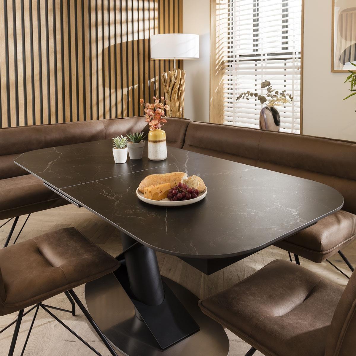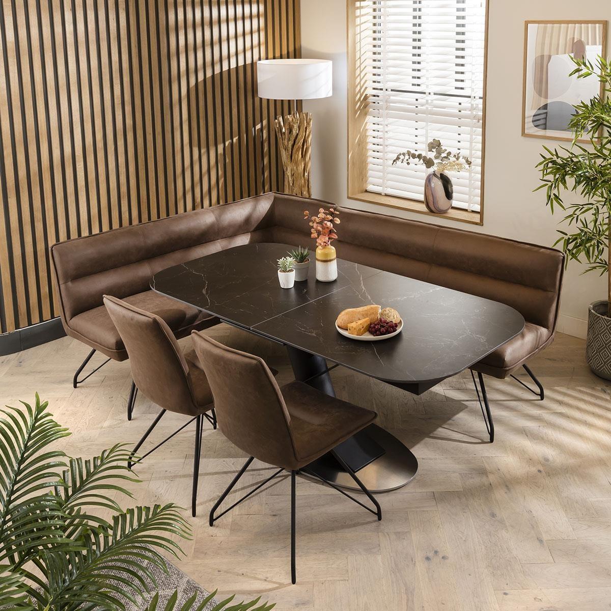 The Detroit Right-Hand Corner Dining Set is the perfect addition to your dining area for a comfortable and stylish seating experience. This spacious corner dining set seats 7-8 people for sociable dining eperience with loved ones. The modern corner dining bench set is covered in a hardwearing brown leather-look fabric. Designed with your comfort in mind, our Corner Dining Bench is upholstered in a luxurious premium bronze brown leather-look fabric. Not only does it add a touch of industrial-chic to your space, but it also provides a cosy seating surface that invites you to relax and enjoy your meals. The soft cushioning ensures a comfortable dining experience, allowing you to linger at the table long after the last bite. The dining table is the perfect centerpiece for any stylish home. With its auto-lift feature, extending the table is a breeze - simply pull one side and watch as the extension effortlessly pops into place. Crafted with a premium black ceramic, the matte marble-effect top exudes sophistication while providing scratch, heat, and stain resistance. Supported by a sleek black powder-coated pedestal base, this table extends from 180cm to 220cm, ensuring ample space for all your dining needs. This set includes 2 dining chairs, a perfect blend of elegance and comfort. Crafted with hardwearing brown leather-look upholstery, the chair exudes luxury and sophistication. The clean design, accentuated by simple tufting details, adds a touch of refined style to any dining space. W166cm D212cm H85cm Seat Height 49cm, Seat Depth 47cm Corner Bench Dining Set with Ceramic Marble Table including 2 chairs