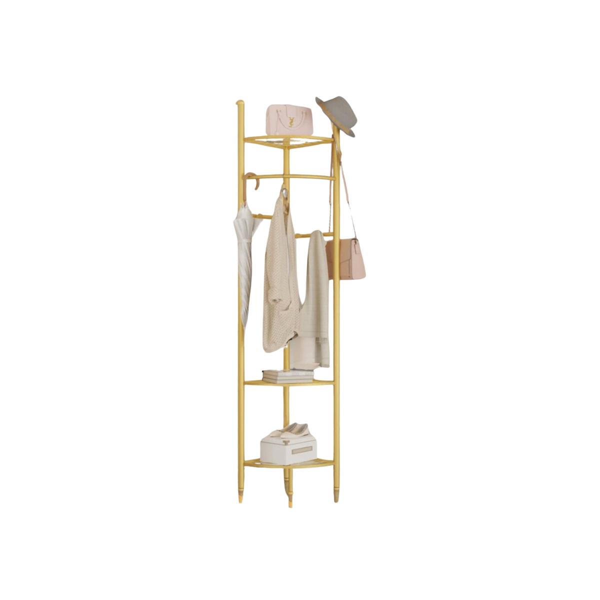 This clothes stand keeps garments neatly arranged, enhancing both functionality and style in entryways or high-traffic areas, ensuring easy access to your wardrobe essentials upon arrival. Featuring a hanging rod for heavier garments and three-tier shelves for various items like shoes, baskets, or plants, along with four hooks for accessories, this stand promotes organization and tidiness in any space. Measuring just 17.51 in length and 68.5 in height, this stand efficiently utilizes corner spaces, making it ideal for compact apartments or rooms where space is limited. Crafted from metal with a durable gold-painted finish, this hall tree coat stand resists rust and deformation, ensuring longevity and protection for your clothing. Its modern-inspired design adds a timeless chic aesthetic to any setting. With no need for wall drilling, this stand offers hassle-free setup and versatility, making it suitable for those who prefer not to damage walls. The included hardware and adjustable foot pads ensure easy assembly and strong support, while protecting floors from scratches.