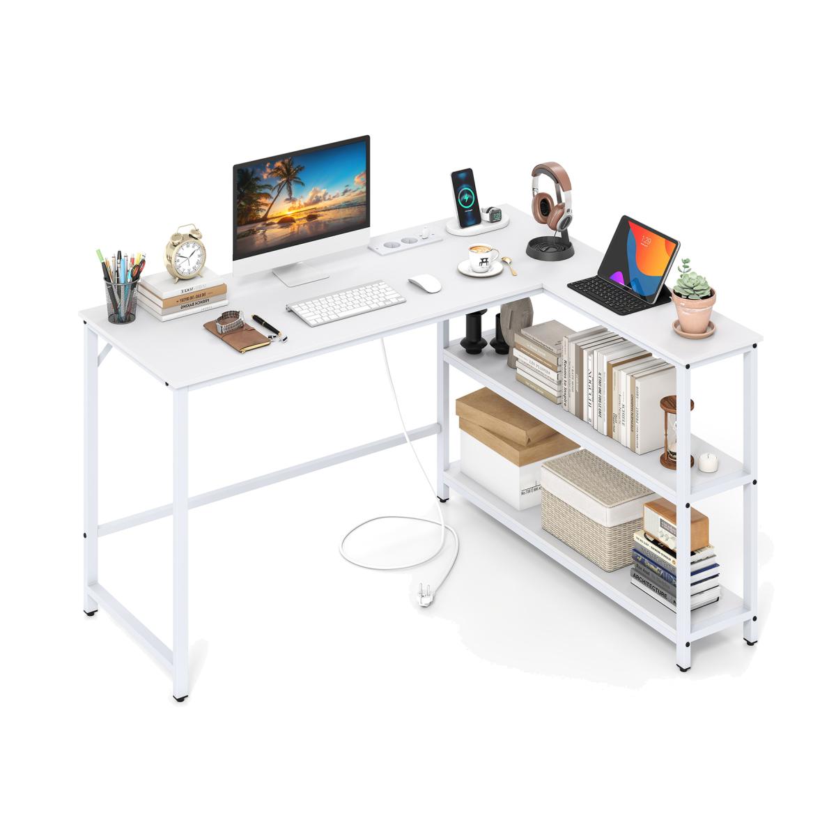 Elevate your workspace with this modern L-shaped desk! With a built-in charging station offering multiple outlets, you can effortlessly power your devices right where you work. Not only does it provide ample workspace for computer and other office essentials, but the open storage shelves keep a variety of supplies within reach. Crafted with a sturdy metal frame and triangular structure, this gaming desk offers stability and durability for long-term use. Whether you need a spot to work, study, or game, this modern computer desk is versatile addition to your home and office.
