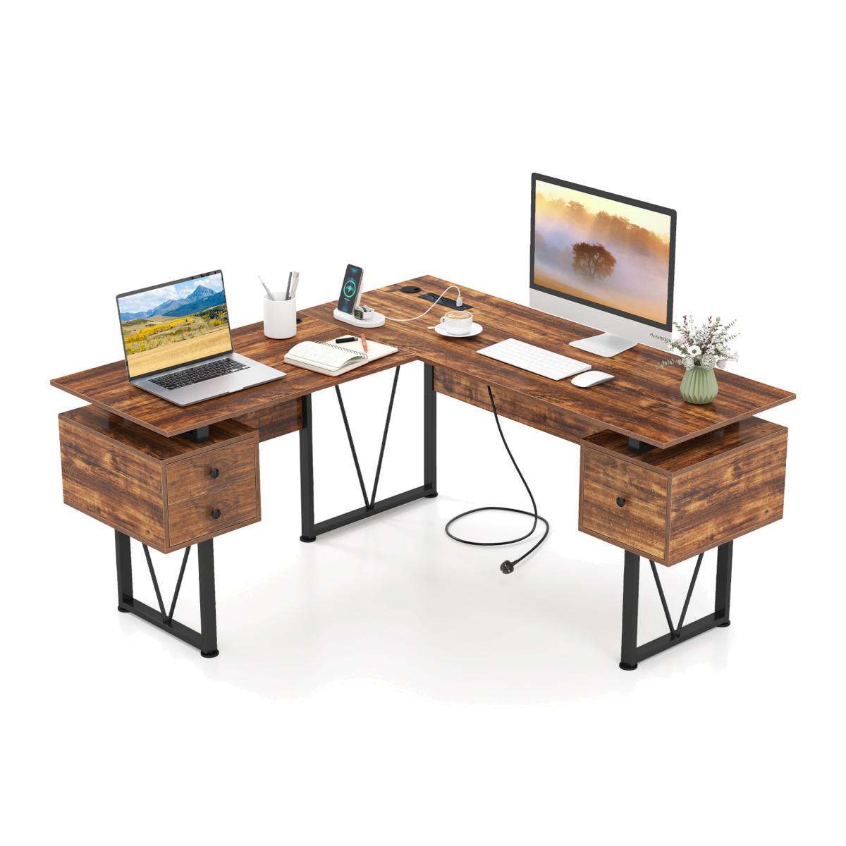 Corner Computer Desk with Power Outlets - Brown