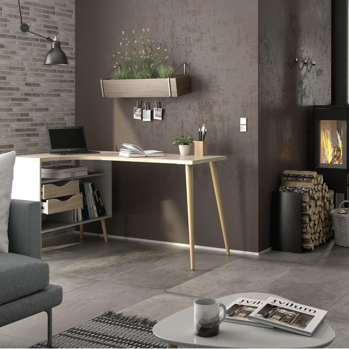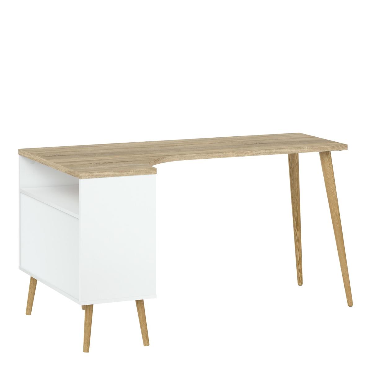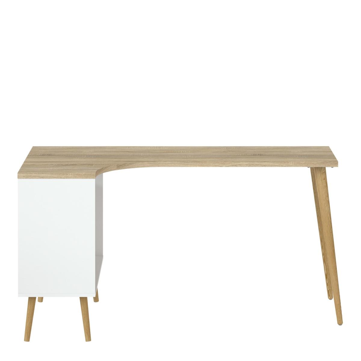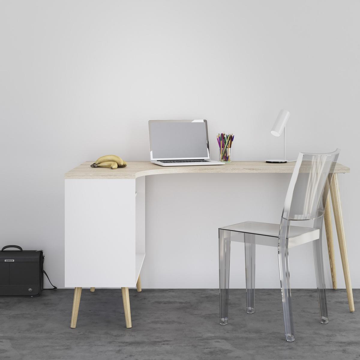 Dimensions H75.8 x W145.1 x D81 cm. The Oslo desk has authentic Scandinavian styling and is practical in even the smallest of spaces by tucking neatly into the corner of the room. Features. The Oslo features easy gliding drawer runners. High quality fixings and hinges used throughout. Made from high quality laminated board which is resistant to damage and scratches moisture and high temperature. Keep your office essentials neatly tucked away in the drawers and shelves. Finished in white and oak to ensure it will suit most interiors. Assembly required..
