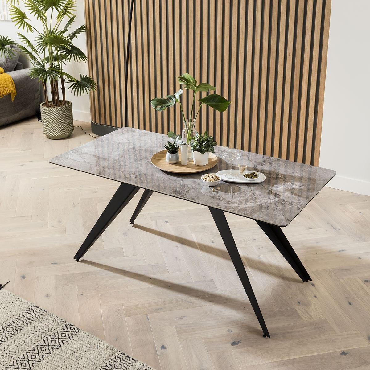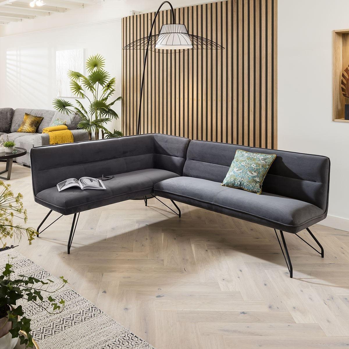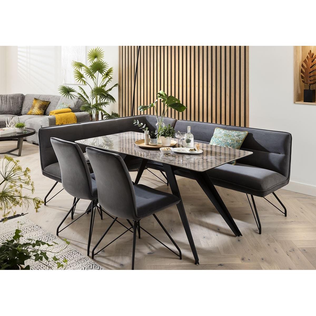 The Detroit Right-Hand Corner Dining Set is the perfect addition to your dining area for a comfortable and stylish seating experience. This spacious corner dining set seats 7-8 people for gathering with loved ones & memorable meals. For added comfort, the corner dining bench set is covered in a premium grey velvet. Designed with your comfort in mind, our Corner Dining Bench is upholstered in a luxurious premium grey fabric. Not only does it add a touch of elegance to your space, but it also provides a cosy seating surface that invites you to relax and enjoy your meals. The soft cushioning ensures a comfortable dining experience, allowing you to linger at the table long after the last bite. The table features glossy grey ceramic finish with beautiful marble-effect grains that compliments a modern base design. The whole construction is placed on black powder coated metal legs that reinforce the contemporary look of the product. Boasting a rectangular silhouette, the 160cm x 80cm table top provides ample space to entertain your friends and relatives. This set includes 2 dining chairs, a perfect blend of elegance and comfort. Crafted with plush grey velvet upholstery, the chair exudes luxury and sophistication. The clean design, accentuated by simple tufting details, adds a touch of refined style to any dining space. W230cm D210cm H76cm Seat Height 49cm, Seat Depth 47cm Corner Bench Dining Set with Ceramic Marble Table including 2 chairs