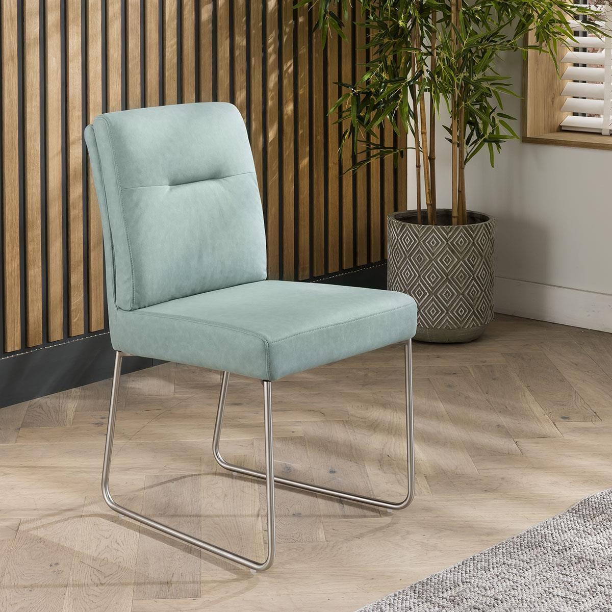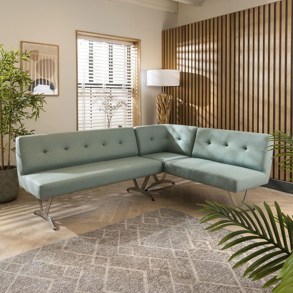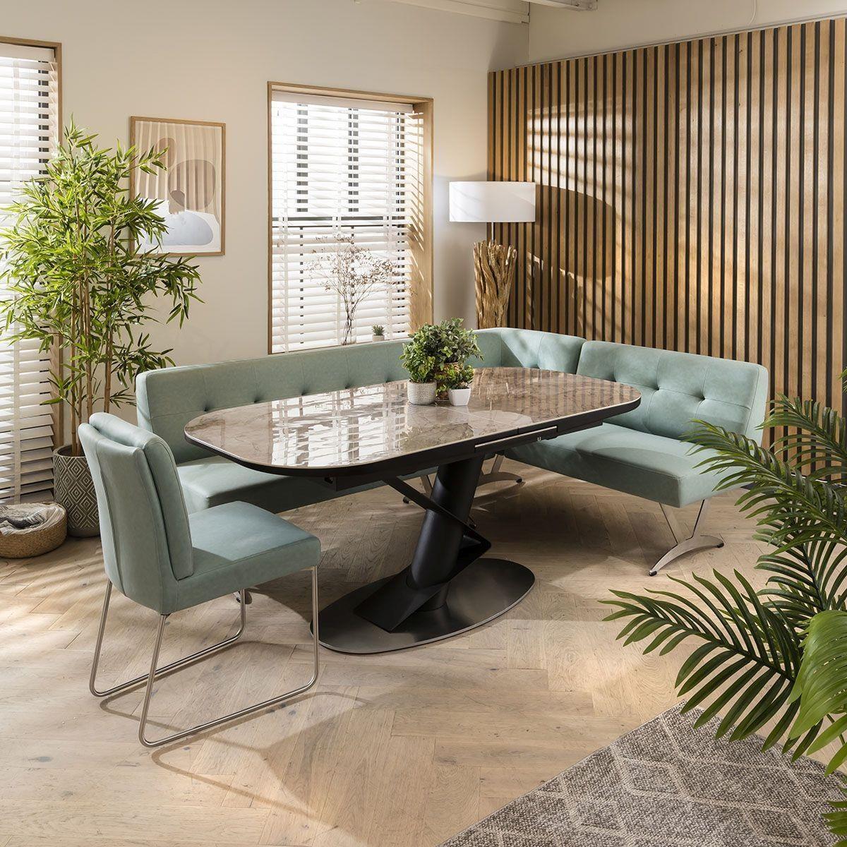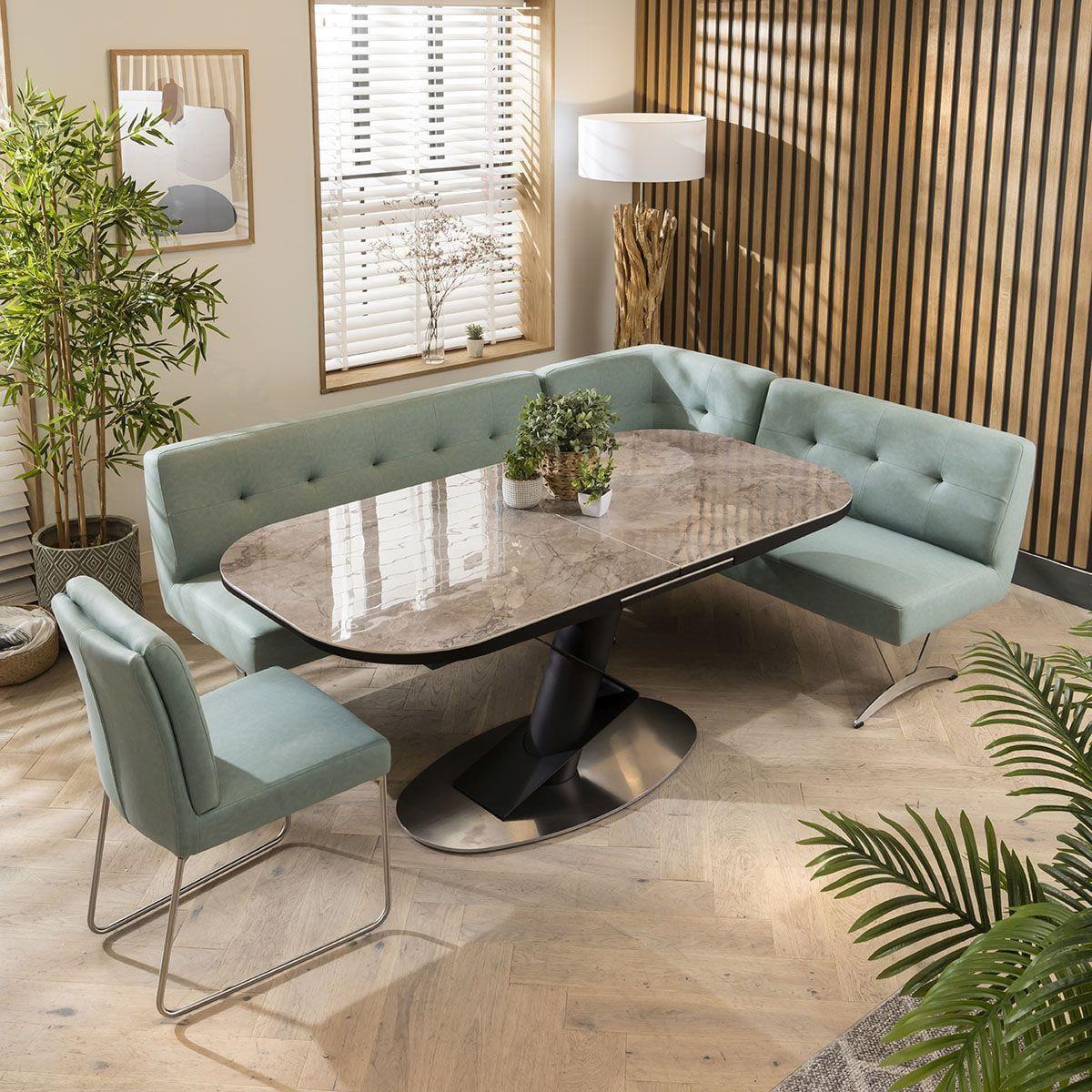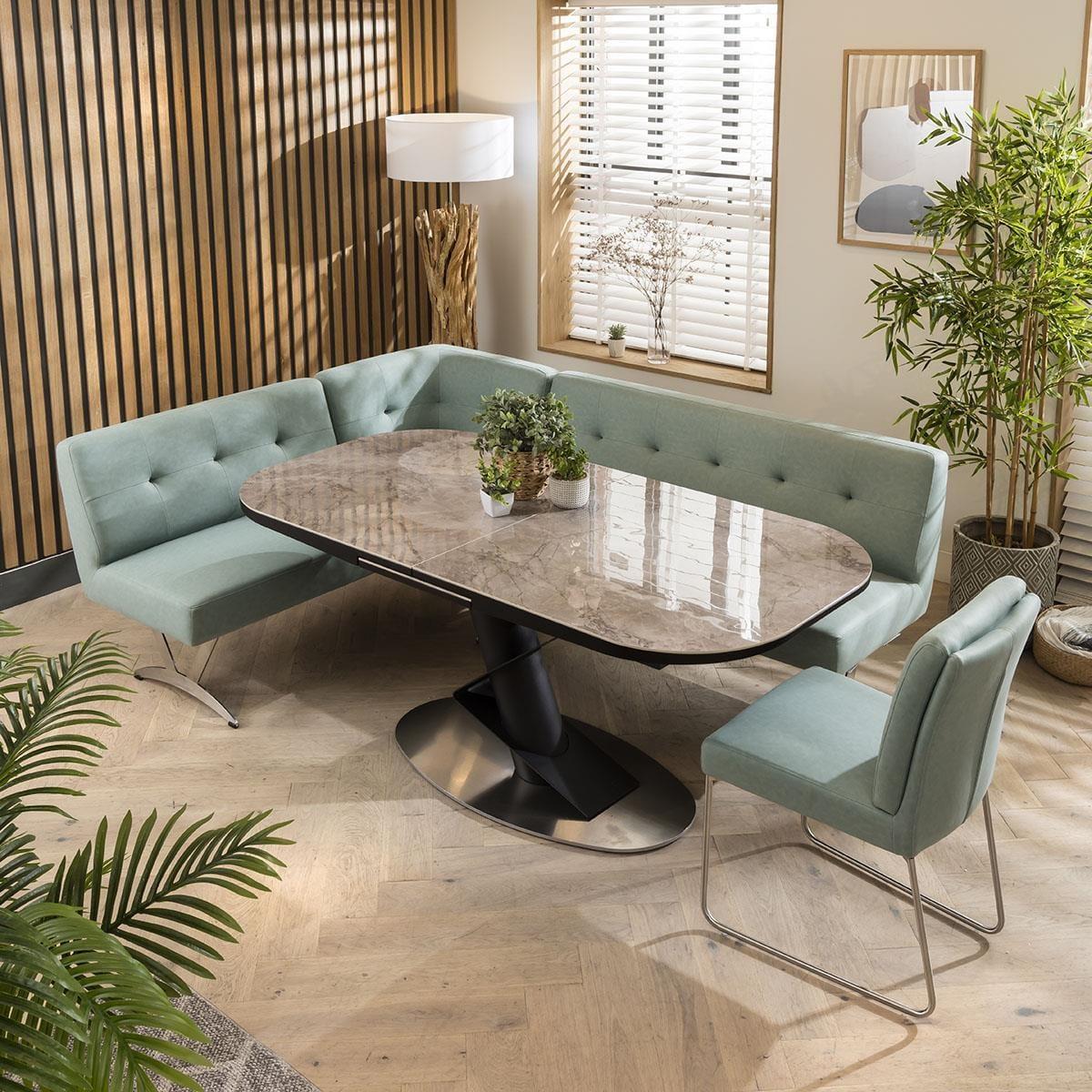 The Taylor Corner Dining Set is a sleek and versatile dining bench and table set, designed to enhance your dining space with style. Seating up to 6 people, this bench dining set is perfect for social gatherings. Its comfortable cushioning and soft upholstery in mint green suede fabric will leave your guests impressed. Not only does this corner dining bench offer exceptional style, but it also offers versatility. You can easily configure it to fit your space by choosing between left or right-hand placement. This adaptability allows you to optimise your dining area, no matter the size or layout of your room. The innovative dining table with an auto-lift feature, designed for modern homes. With a simple pull, the table effortlessly extends from 180cm to 220cm, thanks to its pop-up extension mechanism. The premium grey ceramic top, boasting a glossy marble-effect finish, not only adds a touch of elegance but also provides exceptional durability with scratch, heat, and stain resistance. Completing the contemporary look is the sleek black powder coated pedestal base, ensuring stability and style. This set includes 1 modern dining chair, perfect for adding a touch of sophistication to your dining space. Crafted with premium PU leather in a refreshing mint green shade, the chair exudes contemporary charm and elevates your decor. The clean design with subtle tufting detail enhances the overall aesthetic, creating a harmonious blend of simplicity and elegance. W180-220cm D90cm H76cm Seat Height 49cm, Seat Depth 47cm Left or Right Hand Corner Dining Bench in Green