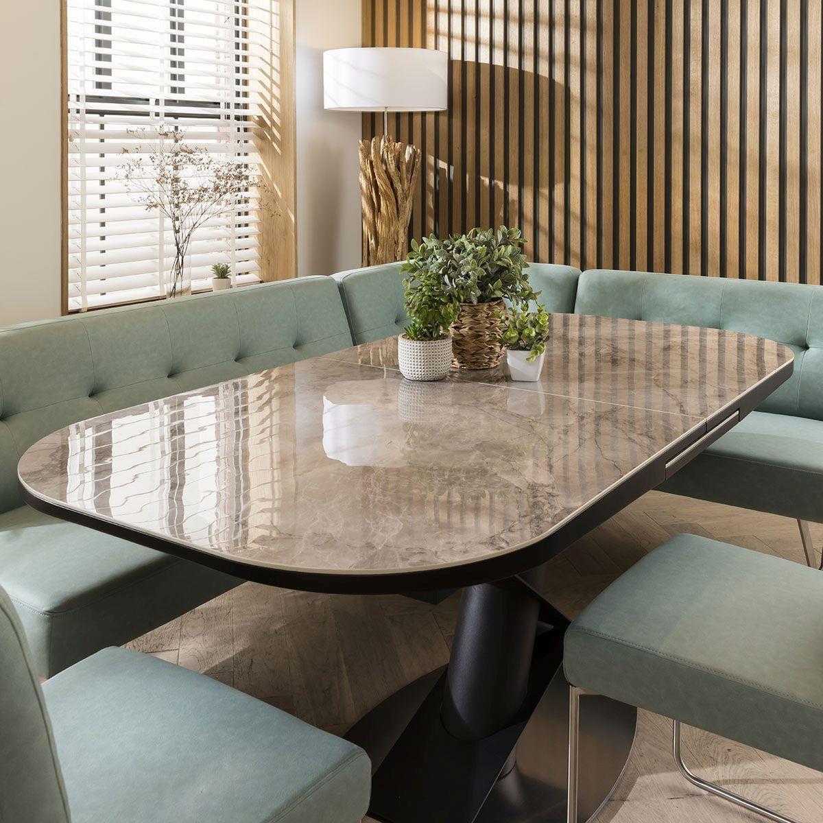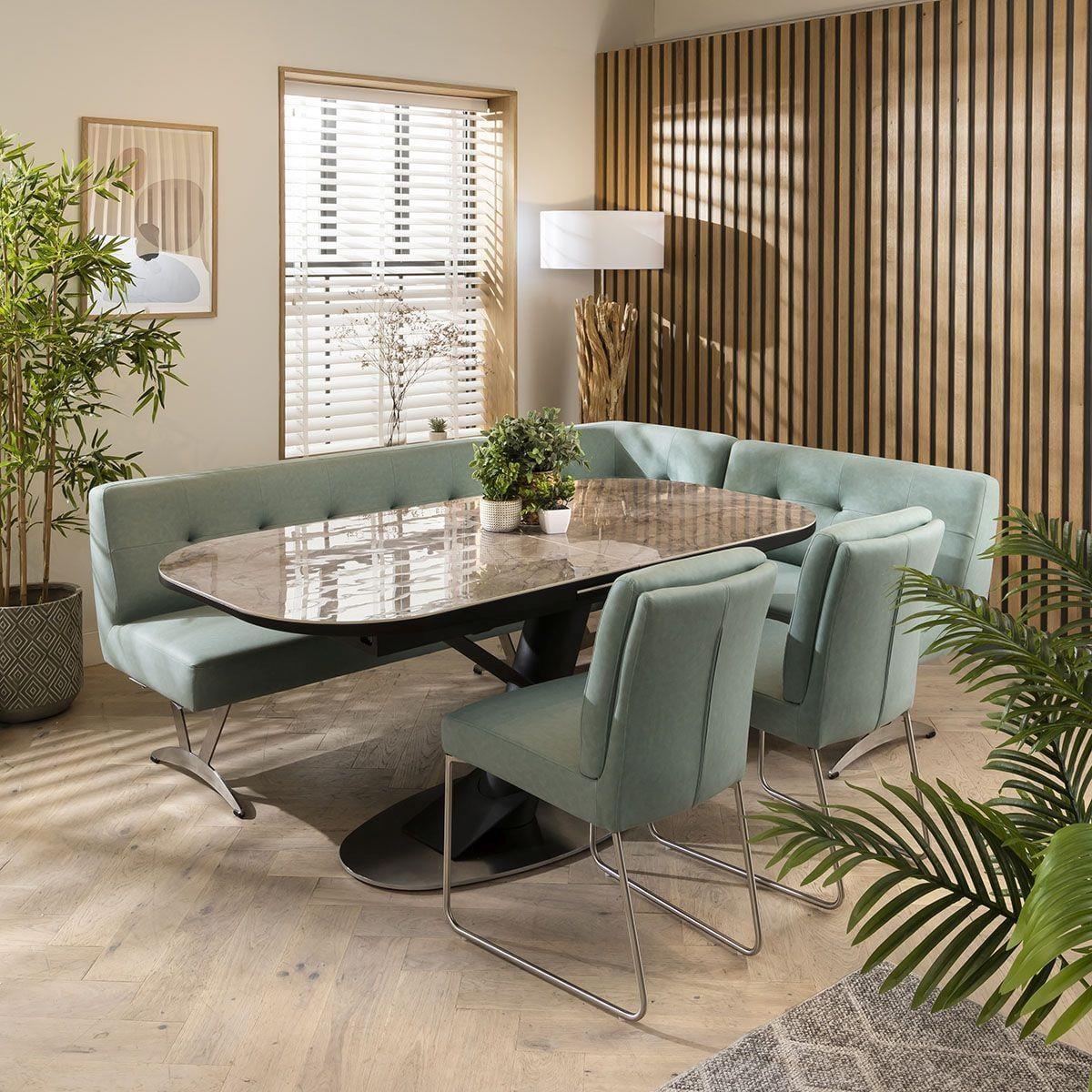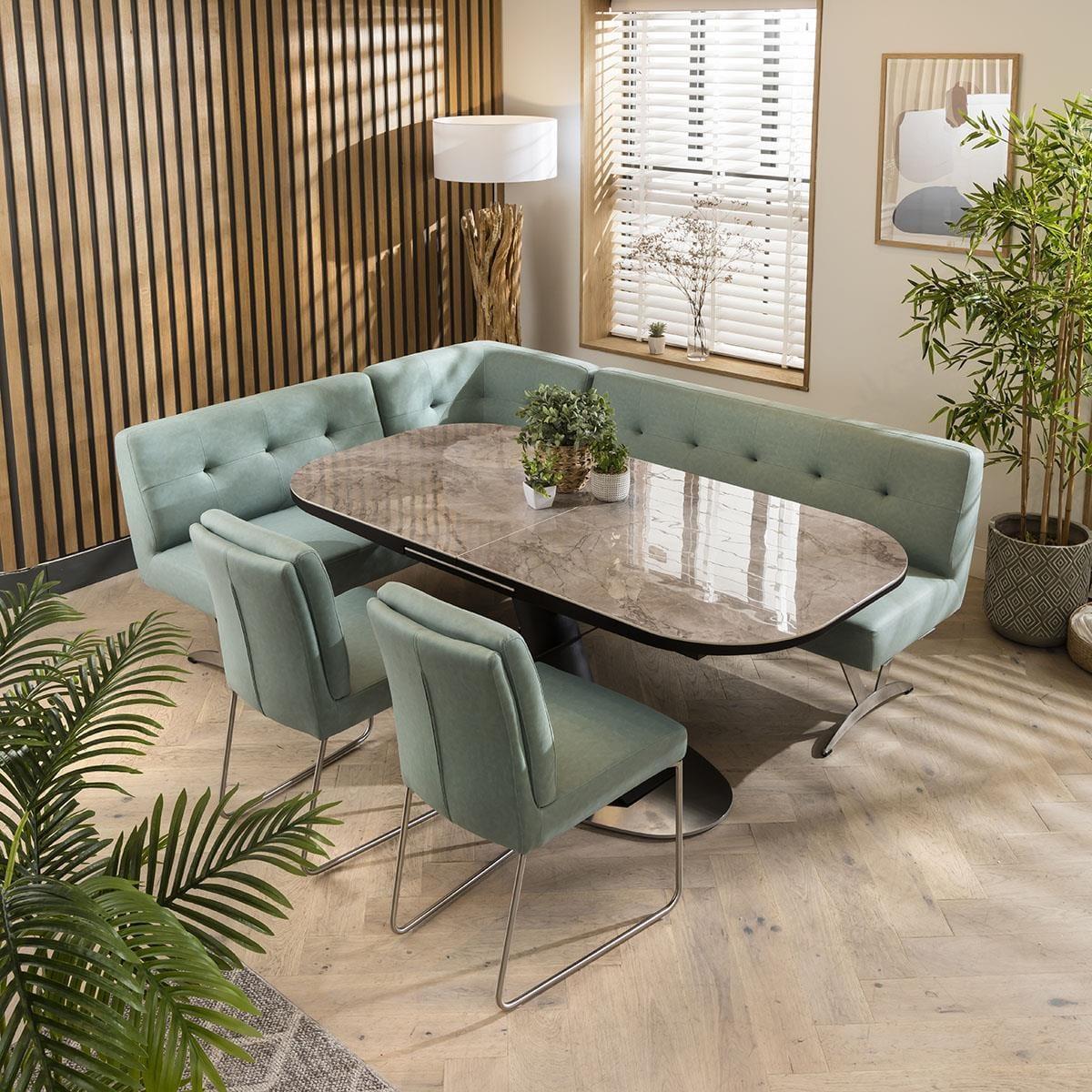 The Taylor Corner Dining Set is a sleek and versatile dining bench and table set, designed to enhance your dining space with style. Seating 7-8 people, this bench dining set is perfect for social gatherings. Its comfortable cushioning and soft upholstery in mint green suede fabric will leave your guests impressed. Not only does this corner dining bench offer exceptional style, but it also offers versatility. You can easily configure it to fit your space by choosing between left or right-hand placement. This adaptability allows you to optimise your dining area, no matter the size or layout of your room. The innovative dining table with an auto-lift feature, designed for modern homes. With a simple pull, the table effortlessly extends from 180cm to 220cm, thanks to its pop-up extension mechanism. The premium grey ceramic top, boasting a glossy marble-effect finish, not only adds a touch of elegance but also provides exceptional durability with scratch, heat, and stain resistance. Completing the contemporary look is the sleek black powder coated pedestal base, ensuring stability and style. This set includes 2 modern dining chairs, perfect for adding a touch of sophistication to your dining space. Crafted with premium PU leather in a refreshing mint green shade, these chairs exude contemporary charm and elevate your decor. The clean design with subtle tufting detail enhances the overall aesthetic, creating a harmonious blend of simplicity and elegance. W180-220cm D90cm H76cm Seat Height 49cm, Seat Depth 47cm Left or Right Hand Corner Dining Bench in Green