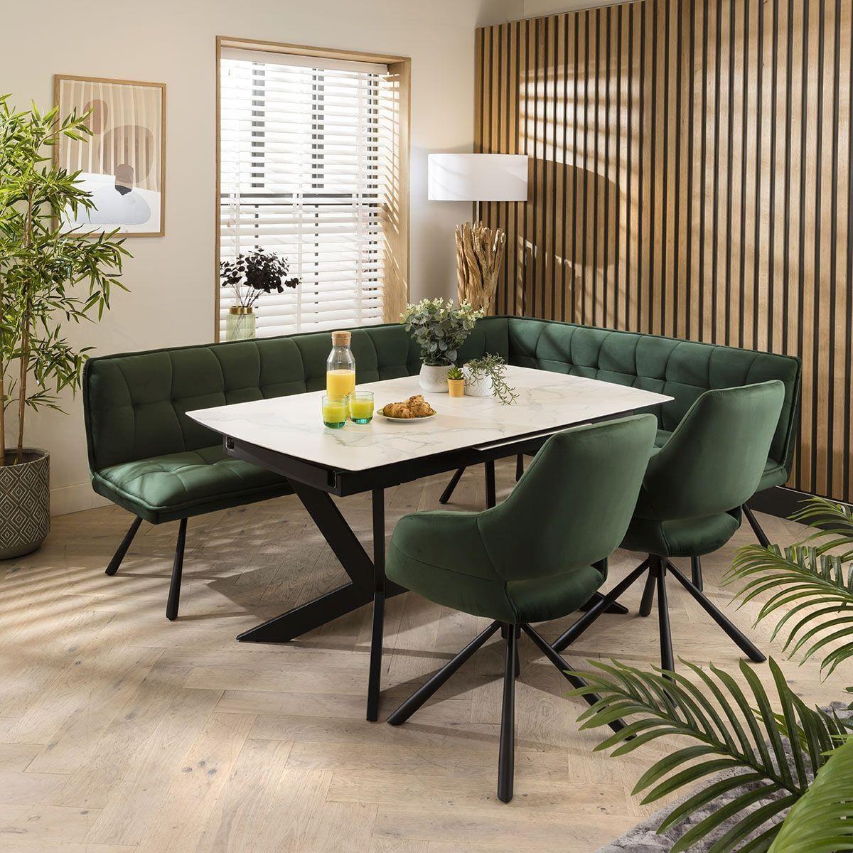 The exquisite Davina left-hand corner dining bench set, a perfect blend of style and functionality. Designed to comfortably seat up to 7-8 people, this versatile corner dining set creates a cosy gathering spot for family and friends. For added comfort, the corner dining bench set is covered in a premium green velvet. The dining bench is upholstered in a premium emerald green fabric, offering a touch of sophistication to any dining space. The luxurious material not only adds elegance but also ensures durability, allowing for long-lasting enjoyment. The 150-200cm extending dining table with its auto-lift feature, extending this table has never been easier. Just pull one side, and watch as the extension effortlessly pops into place, providing you with additional space for those special gatherings. Crafted with a premium white ceramic top featuring a sophisticated matte marble-effect finish, this table not only exudes elegance but also boasts exceptional durability. The scratch, heat, and stain-resistant ceramic surface ensures long-lasting beauty, while the black powder coated metal legs add a touch of modern edginess This corner dining bench set includes 2 carver dining chairs. Crafted with meticulous attention to detail, these chairs are designed to elevate your dining experience. With their luxurious cushioning and captivating emerald green velvet upholstery, these chairs offer a touch of opulence to any space. W226cm D169cm H84cm Seat Height 49cm, Seat Depth 45cm Corner Bench Dining Set with Ceramic Marble Table including 2 chairs