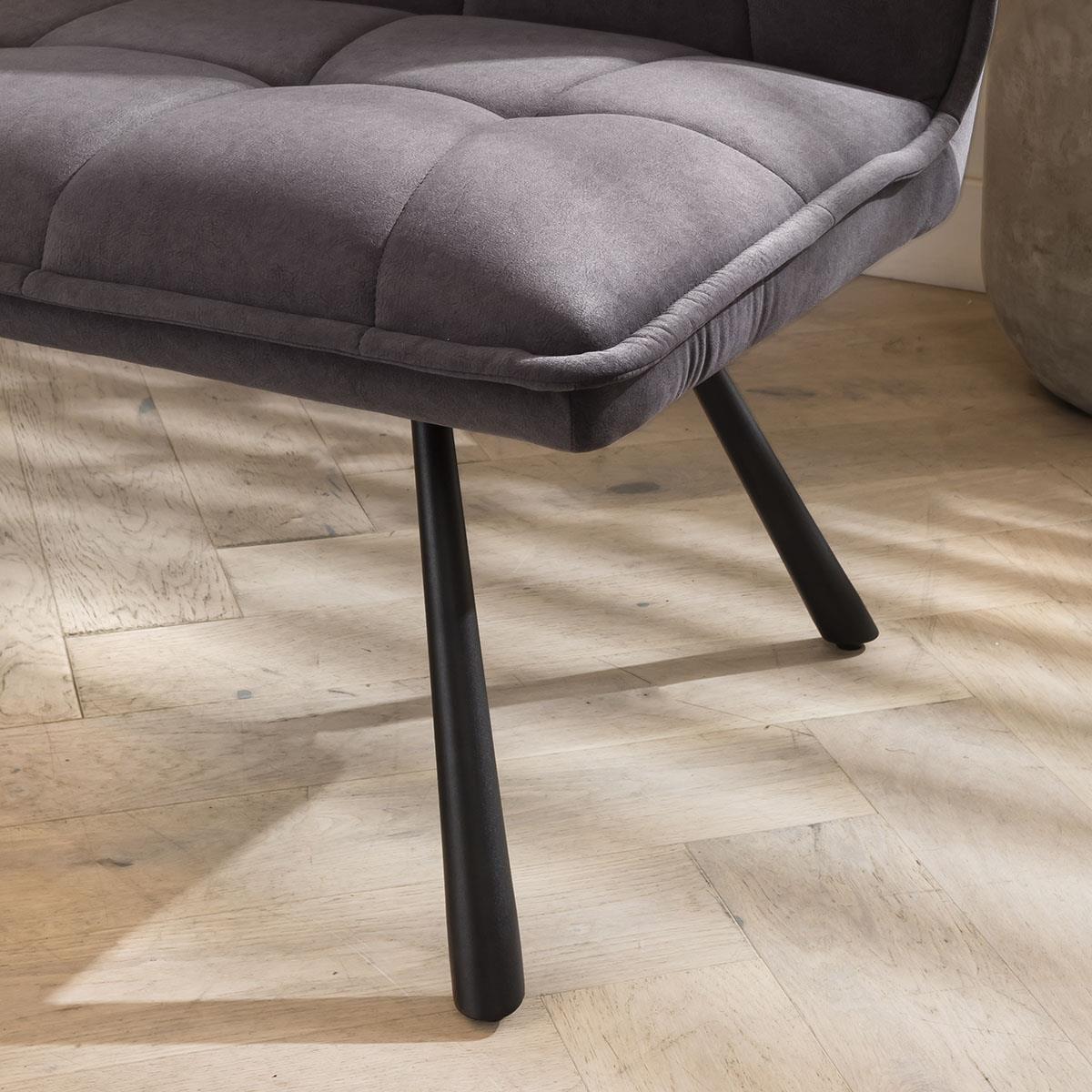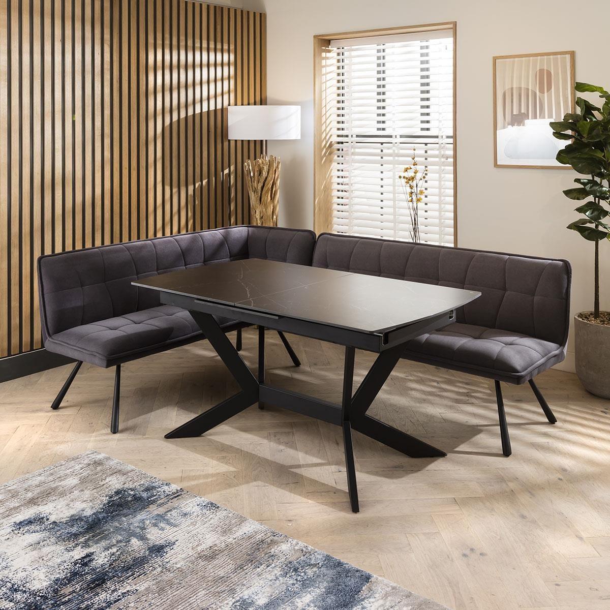 The exquisite Davina right-hand corner dining bench set, a perfect blend of style and functionality. Designed to comfortably seat up to five people, this versatile corner dining set creates a cosy gathering spot for family and friends. For added comfort, this corner dining bench set is covered in a premium grey velvet. The dining bench is upholstered in a premium dark grey fabric, offering a touch of sophistication to any dining space. The luxurious material not only adds elegance but also ensures durability, allowing for long-lasting enjoyment. The 150-200cm extending dining table with its auto-lift feature, extending this table has never been easier. Just pull one side, and watch as the extension effortlessly pops into place, providing you with additional space for those special gatherings. Crafted with a premium black ceramic top featuring a sophisticated matte marble-effect finish, this table not only exudes elegance but also boasts exceptional durability. The scratch, heat, and stain-resistant ceramic surface ensures long-lasting beauty, while the black powder coated metal legs add a touch of modern edginess. This corner dining bench set includes the dining bench & table. Matching chairs are also available with the same luxurious cushioning and matching premium upholstery, the matching set will add touch of opulence to any space. W226cm D169cm H84cm Seat Height 49cm, Seat Depth 45cm Corner Dining Bench with Ceramic Marble Extending Dining Table