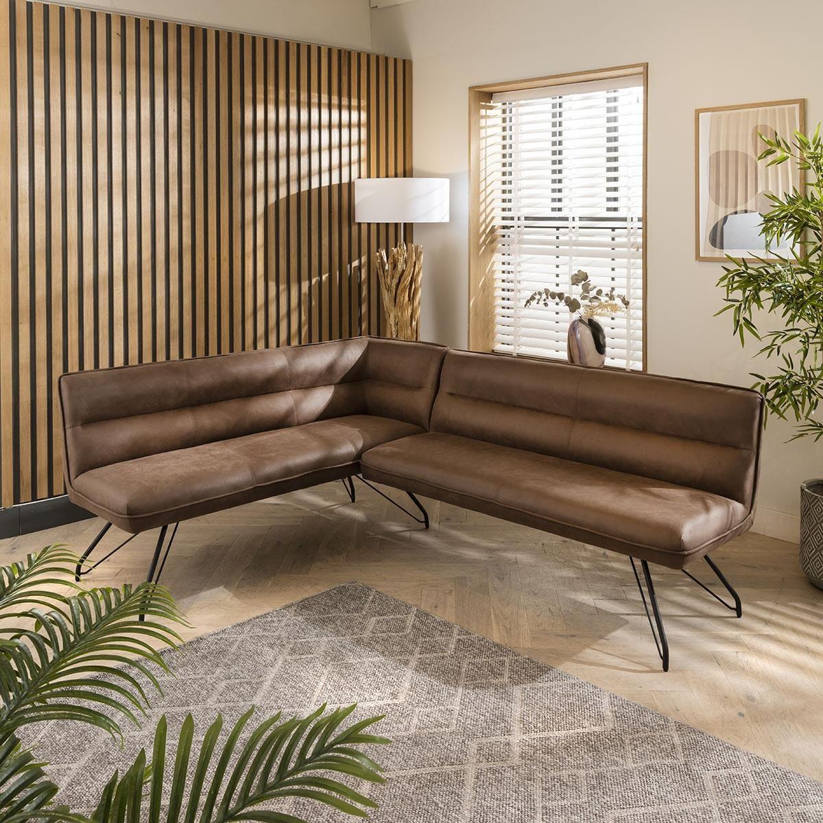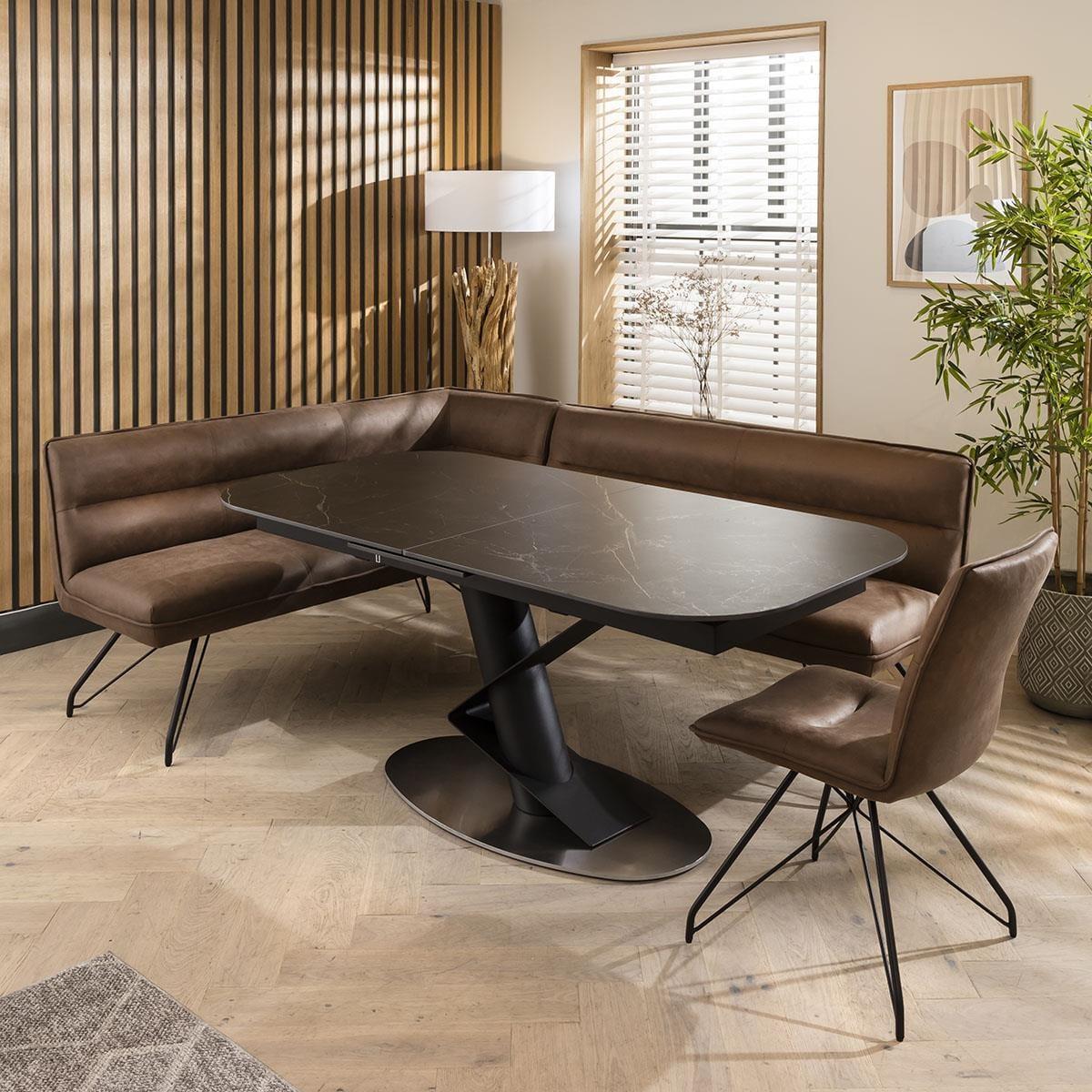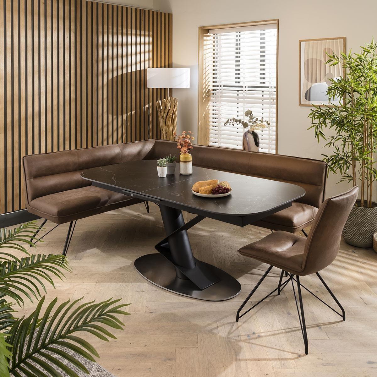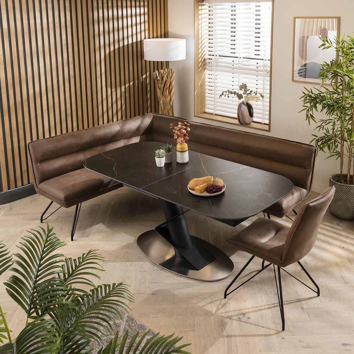 The Detroit Right-Hand Corner Dining Set is the perfect addition to your dining area for a comfortable and stylish seating experience. This spacious corner dining set seats up to 6 people for sociable dining eperience with loved ones. The corner dining bench set is covered in a hardwearing brown leather-look fabric. Designed with your comfort in mind, our Corner Dining Bench is upholstered in a luxurious premium bronze brown leather-look fabric. Not only does it add a touch of industrial-chic to your space, but it also provides a cosy seating surface that invites you to relax and enjoy your meals. The soft cushioning ensures a comfortable dining experience, allowing you to linger at the table long after the last bite. The dining table is the perfect centerpiece for any stylish home. With its auto-lift feature, extending the table is a breeze - simply pull one side and watch as the extension effortlessly pops into place. Crafted with a premium black ceramic, the matte marble-effect top exudes sophistication while providing scratch, heat, and stain resistance. Supported by a sleek black powder-coated pedestal base, this table extends from 180cm to 220cm, ensuring ample space for all your dining needs. This set includes 1 dining chair, a perfect blend of elegance and comfort. Crafted with hardwearing brown leather-look upholstery, the chair exudes luxury and sophistication. The clean design, accentuated by simple tufting details, adds a touch of refined style to any dining space. W166cm D212cm H85cm Seat Height 49cm, Seat Depth 47cm Corner Bench Dining Set with Ceramic Marble Table including 1 chair