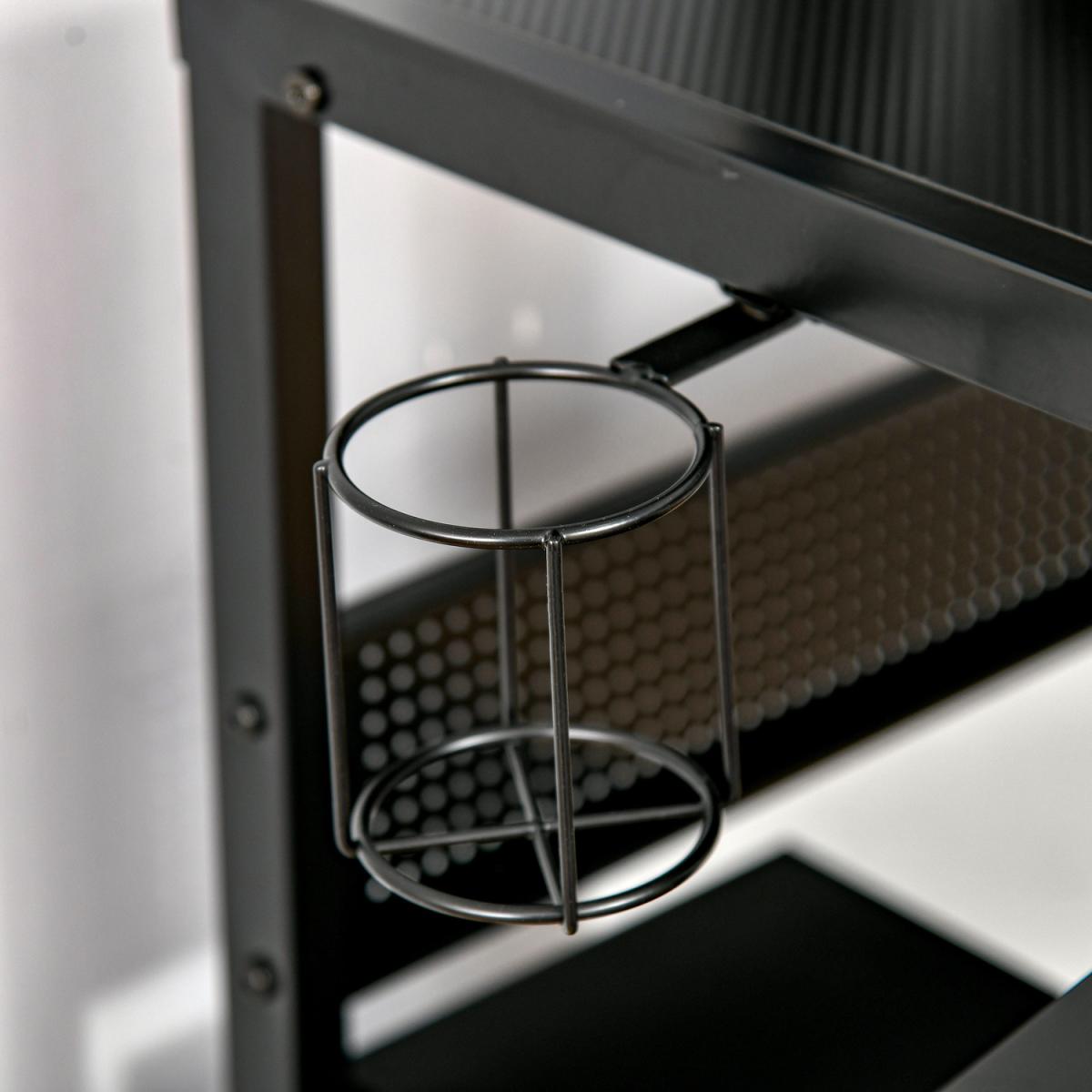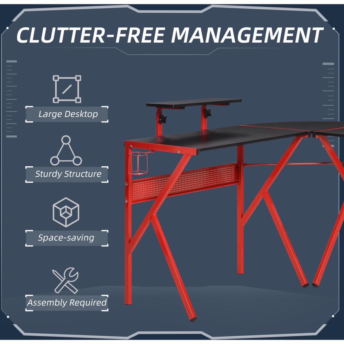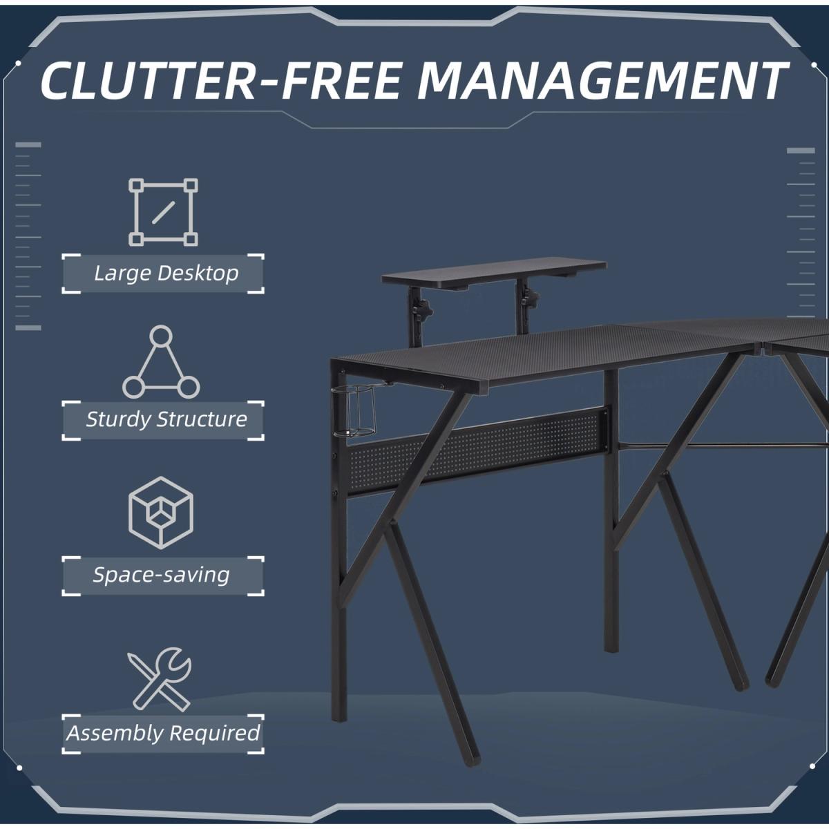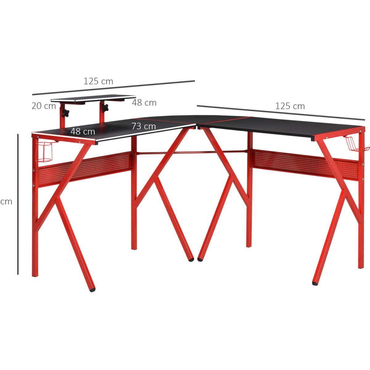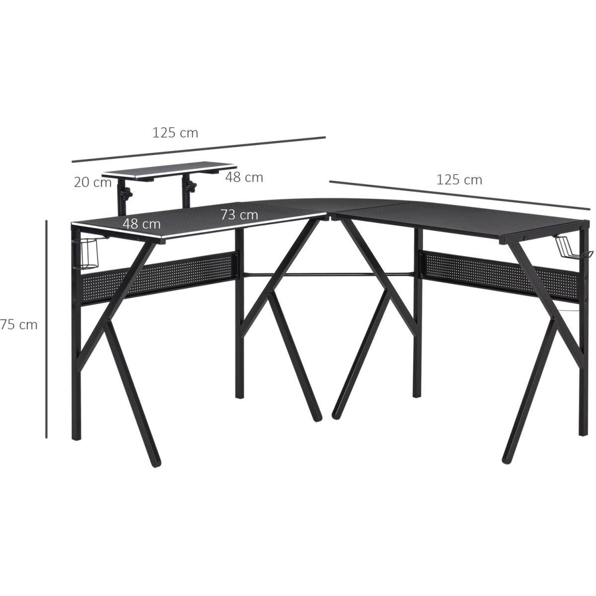 Attention to detail wins games, and trust that this ergonomic gaming desk is built to win. Our HOMCOM computer desk features a large desktop to place your electronic devices or other necessities, keeping you engaged in the game. This office desk features built-in support for all your gaming hardware, providing solutions for your headphones, monitors and drinks. L-shaped design makes it suitable for corner use. This gamer desk can seamlessly take you from a workstation to a battle station.