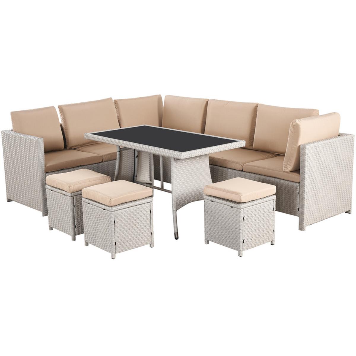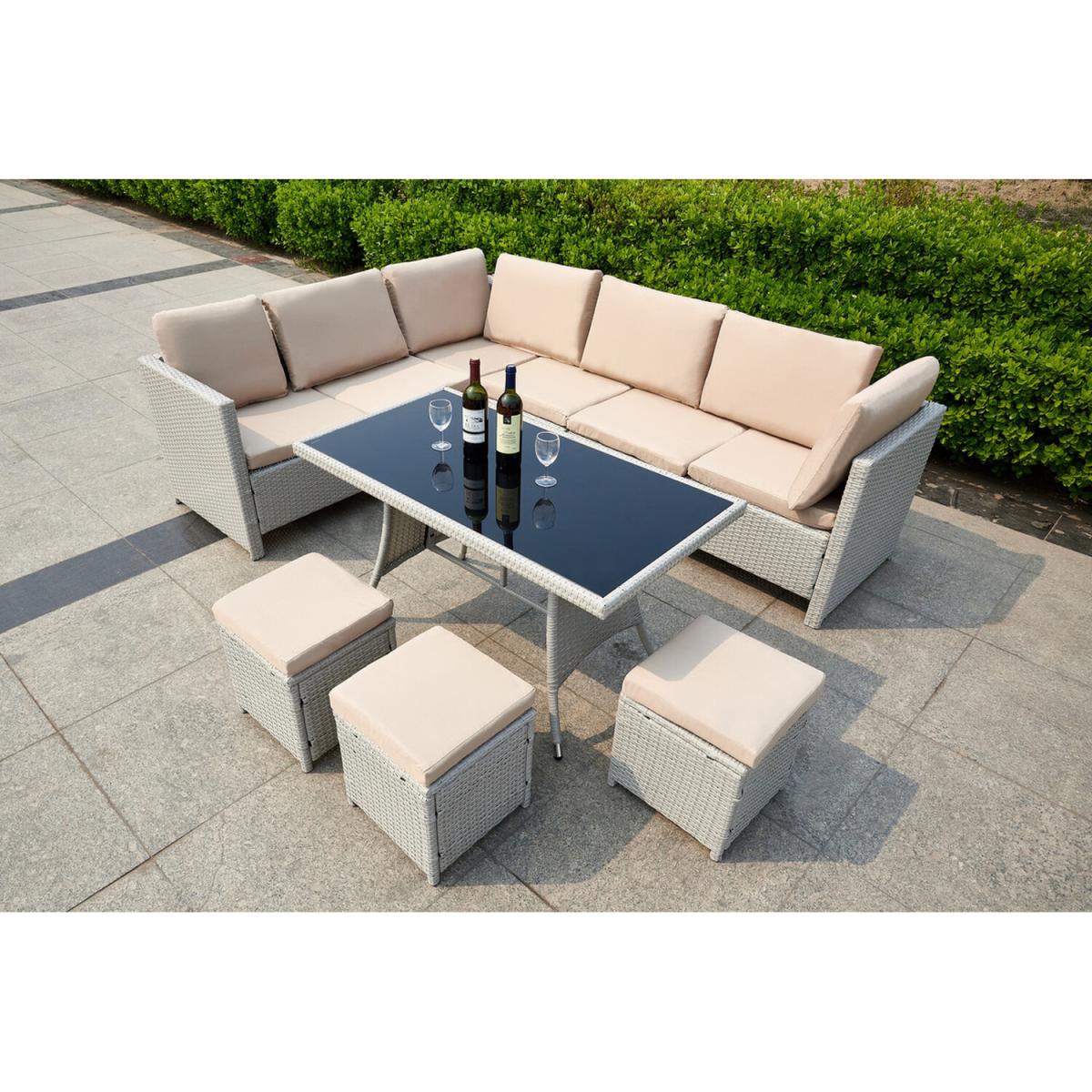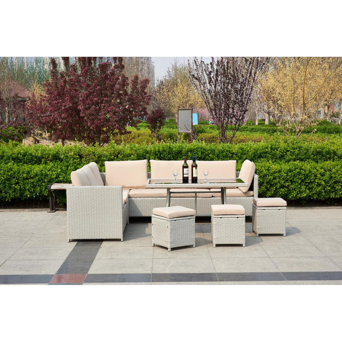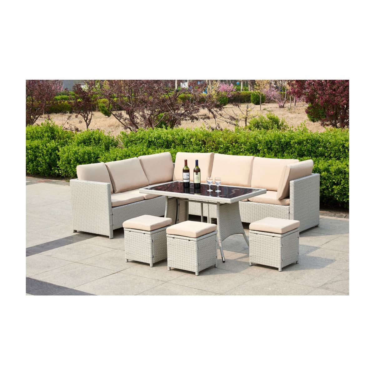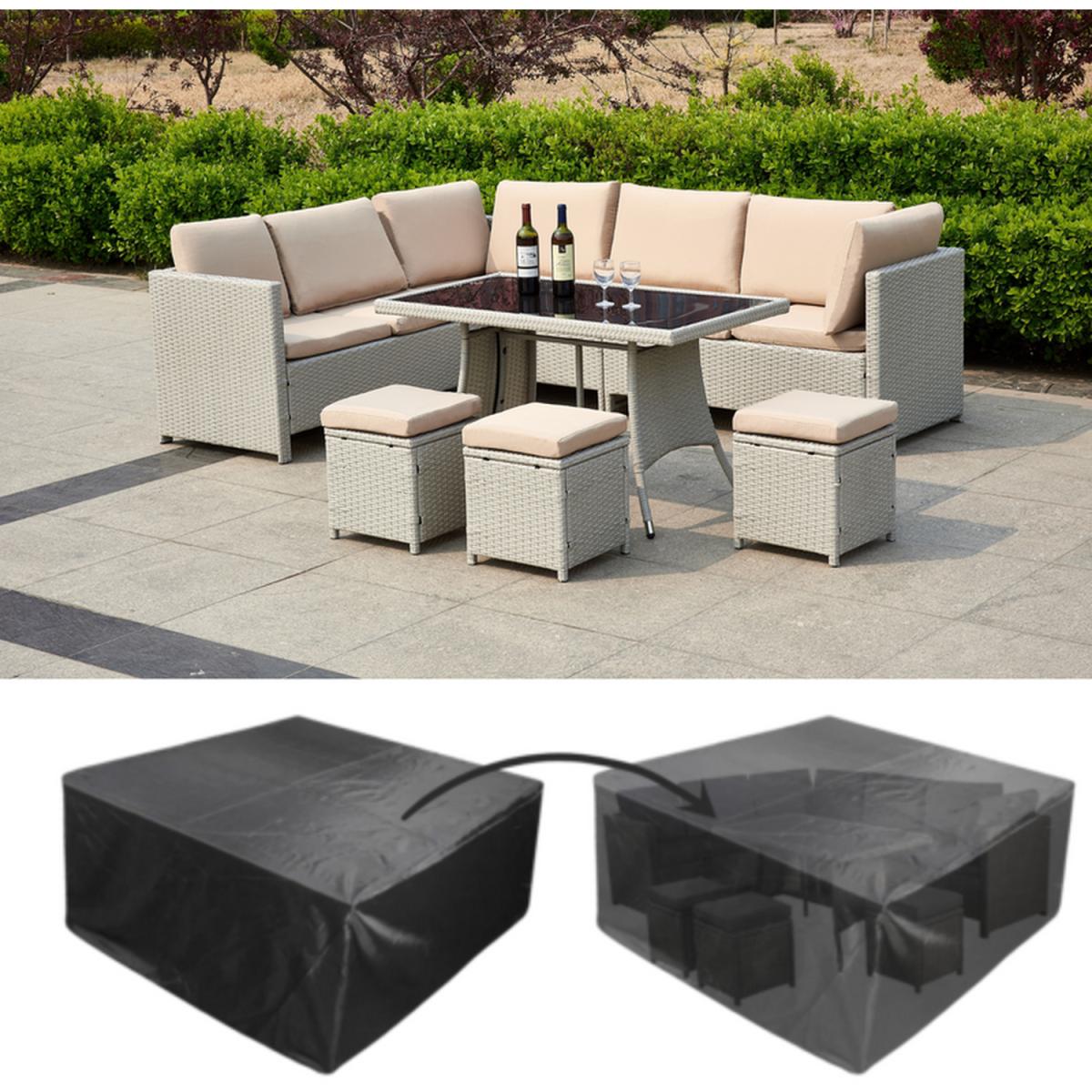 Give your garden space that premium feel with the Outdoor furniture set with the protective cover. This 7-piece outdoor rattan garden furniture set is sure to bring that WOW factor to your garden space. Inspired by natural elements a concoction of woven textures, warm colors, and delicate fabrics. Tightly woven flat strips of polyester compliment every design aesthetic from traditional to minimalist. Our high-quality weatherproof synthetic wicker fiber has been specially formulated with its high UV tolerance and moisture resistance. The material will not rust, fade or crack. Generously filled foam waterproof cushions with removable machine-washable cushion covers. A dining table with a 5mm smoked tempered safety glass that meets UK safety requirements. Comes with the Durable and lightweight 210. D Oxford fabric with waterproof PP coating that protects your furniture from rain, snow, and other precipitation. Protect your furniture well from scratching, getting wet, dust, fading, fire-retardant, mildew proof, cold-proof, anti-corrosion, anti-aging, anti-ultraviolet, and easy to clean. It won't crack on snow days as well protect your furniture well. Make your furniture more long-life and durable. The furniture set cover is designed with a drawstring running through the entire furniture cover at the hem. The tightness can be adjusted according to the needs. Your valuable corner sofa will stay beautiful longer with this protective cover and will also last longer!