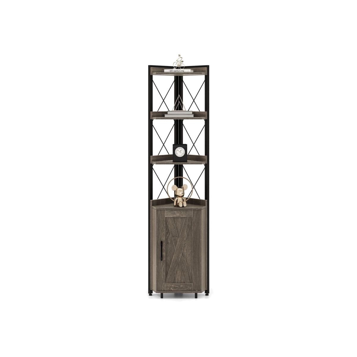 Make full use of the corner space with our 6-tier corner shelf with cabinet! The sturdy metal frame as well as 6 solid legs contributes to a stable performance. With 4 open storage shelves and 1 enclosed storage cabinet, items are stowed in order. Moreover, the shelf behind the door is removable and adjustable, fitting items of different heights. You do not need to worry about objects falling since there are raised edge protection and anti-falling x-shaped braces. The anti-tipping fittings allow the tall corner bookshelf to stand stably.