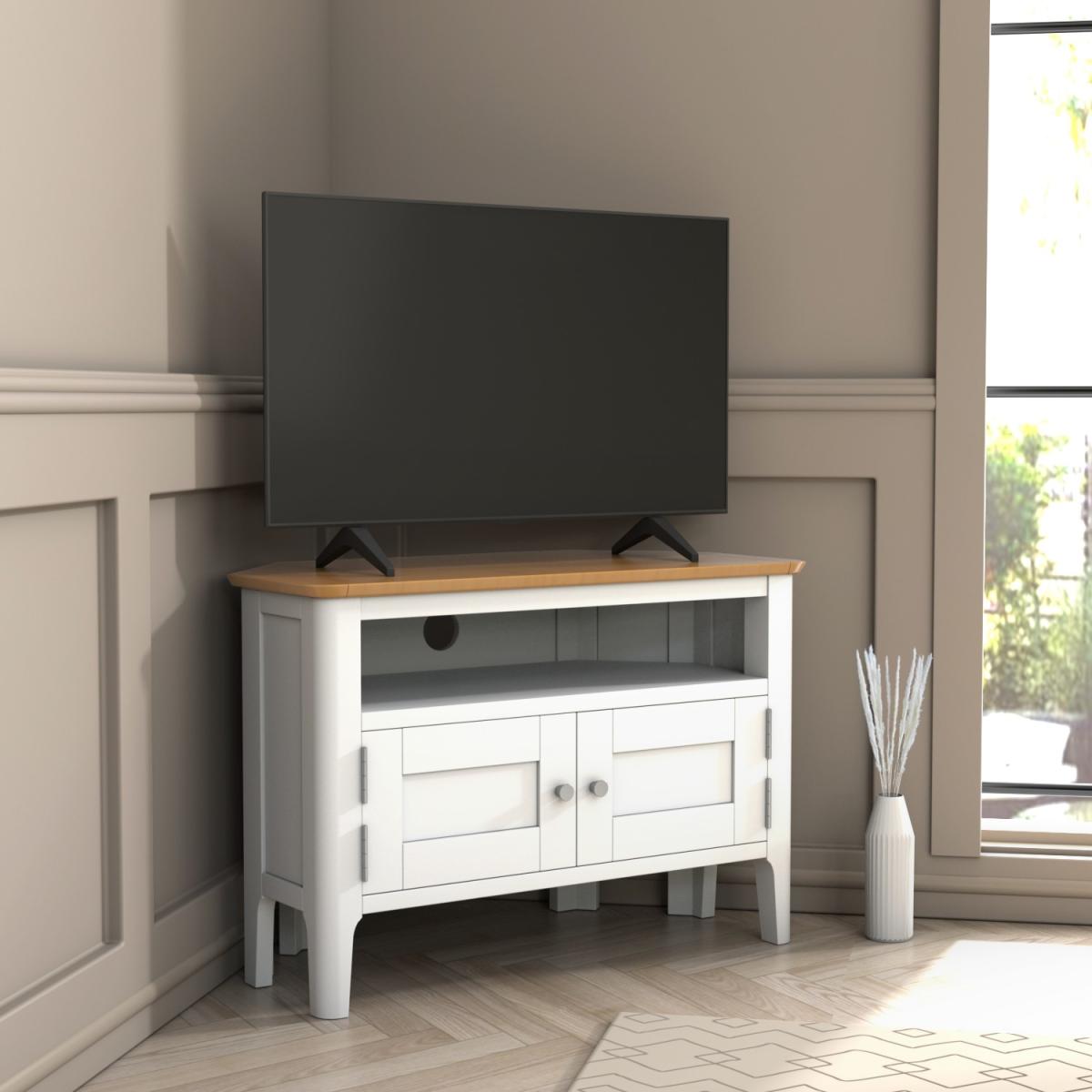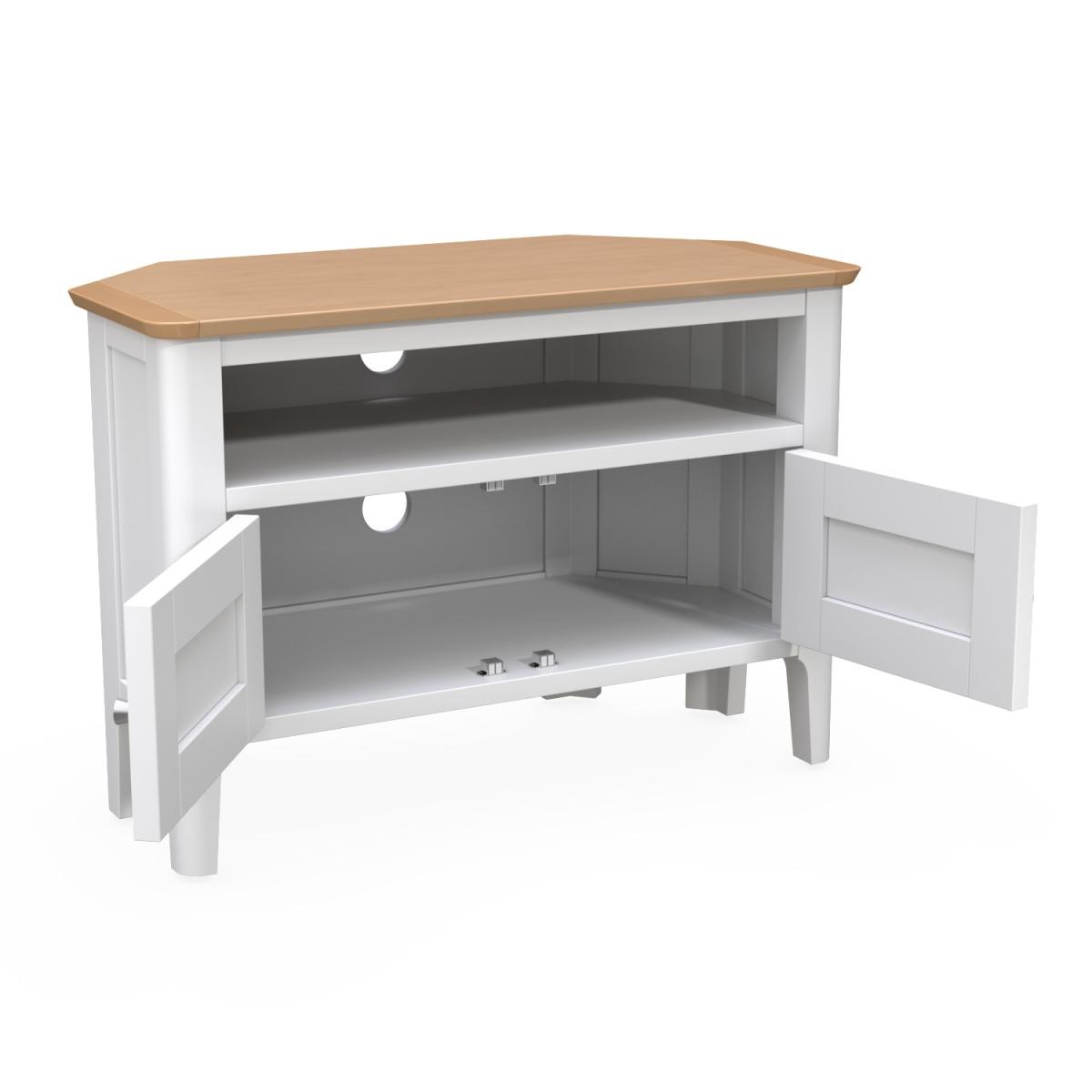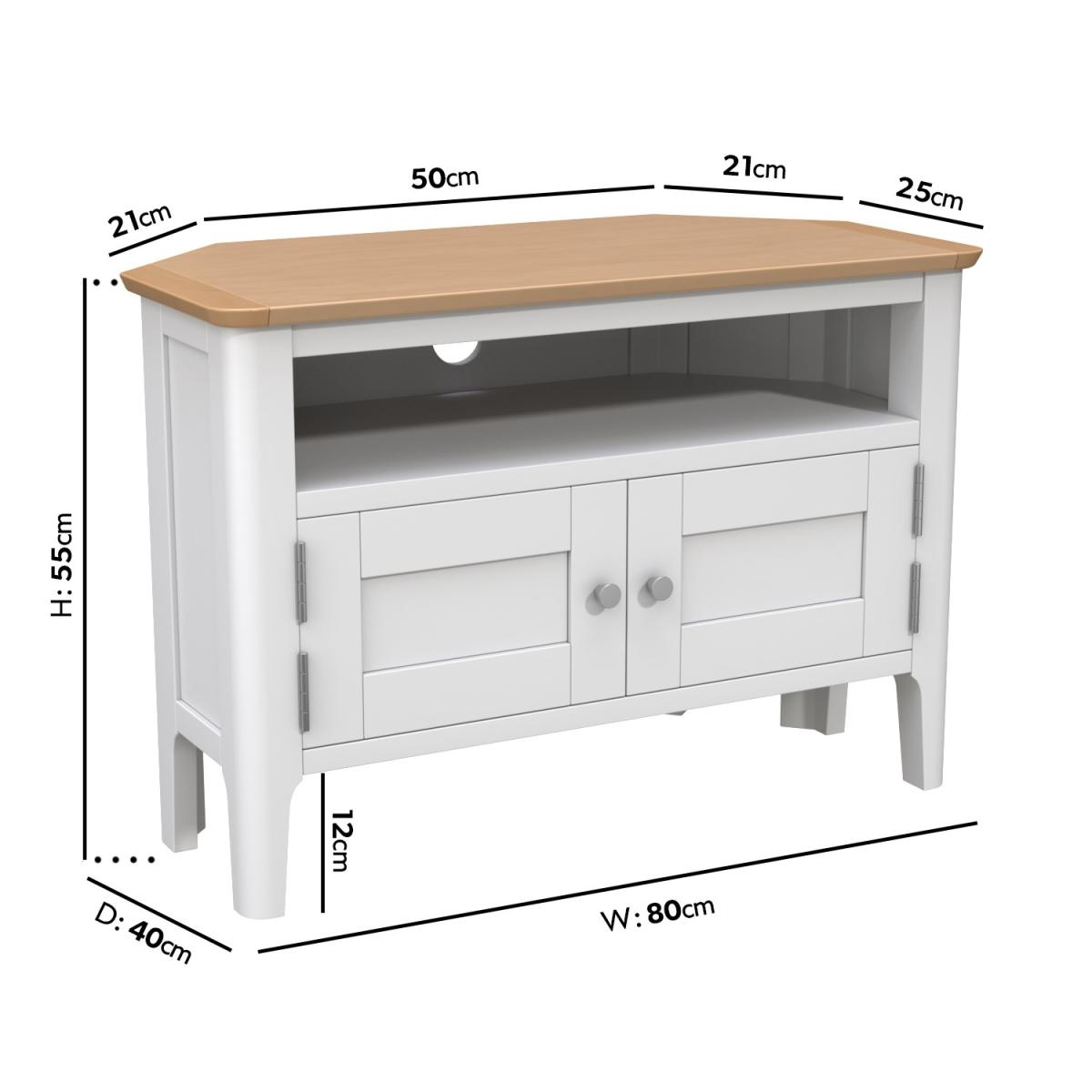Dimensions H55 x W80 x D40cm. Enhance your living room with a stunning corner focal point. This traditional-style white painted TV unit incorporates stunning chrome handles for a modern twist. Features. Beautifully crafted from high-quality pine and oak. A modern twist on a classic design with sleek round chrome handles. Open storage space with a wire feed hole to keep your entertainment devices. Handy closed storage space to tidy away any clutter. Beautifully painted white oak. No assembly required..