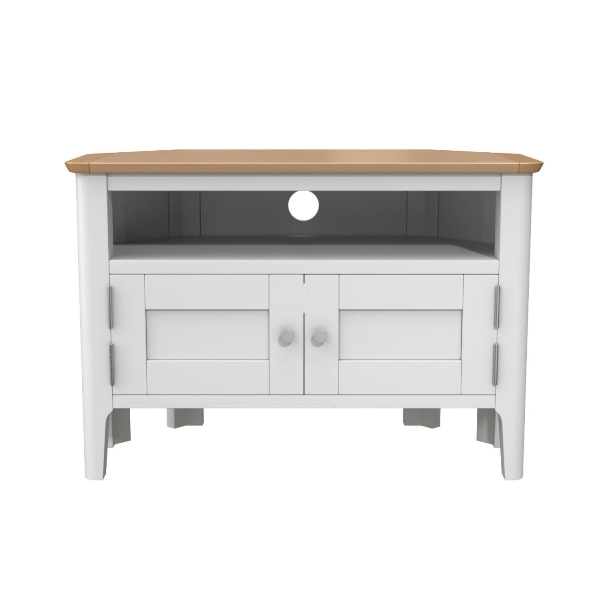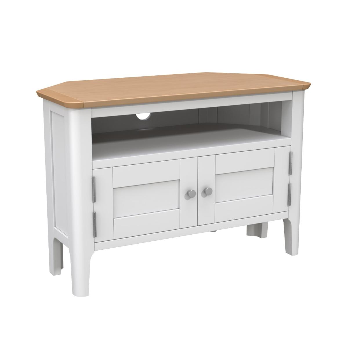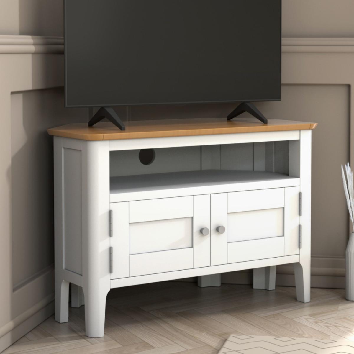 Dimensions H55 x W80 x D40cm. Enhance your living room with a stunning corner focal point. This traditional-style white painted TV unit incorporates stunning chrome handles for a modern twist. Features. Beautifully crafted from high-quality pine and oak. A modern twist on a classic design with sleek round chrome handles. Open storage space with a wire feed hole to keep your entertainment devices. Handy closed storage space to tidy away any clutter. Beautifully painted white oak. No assembly required..