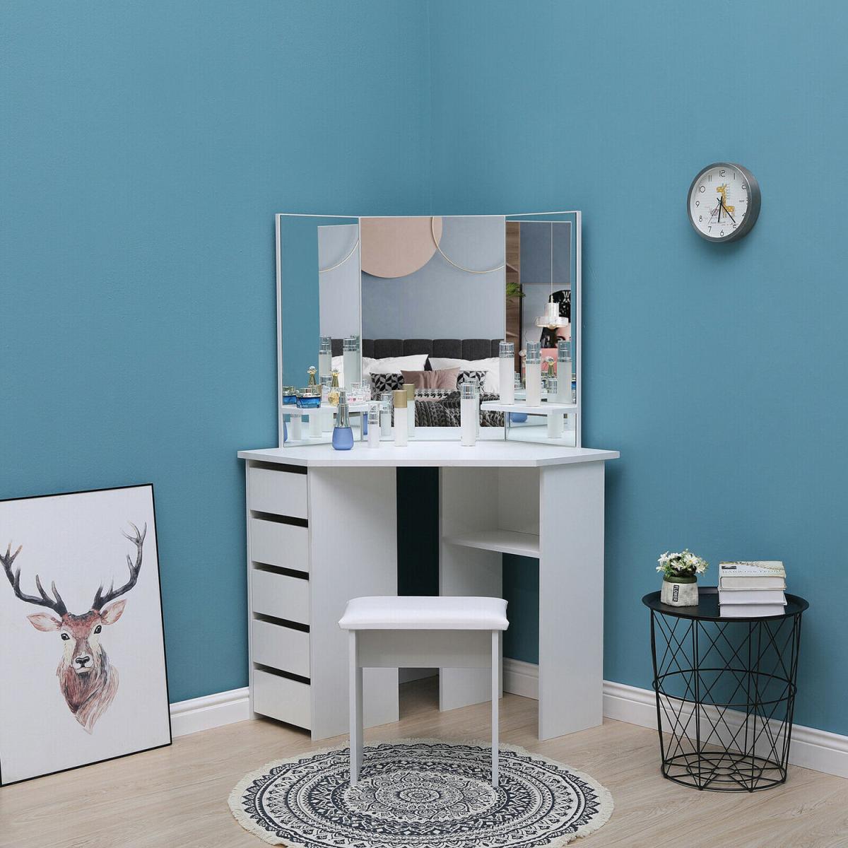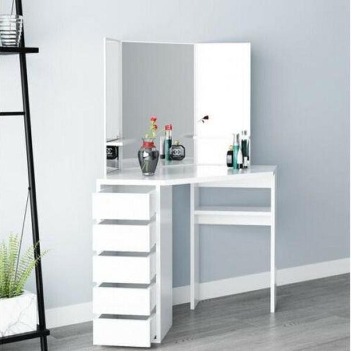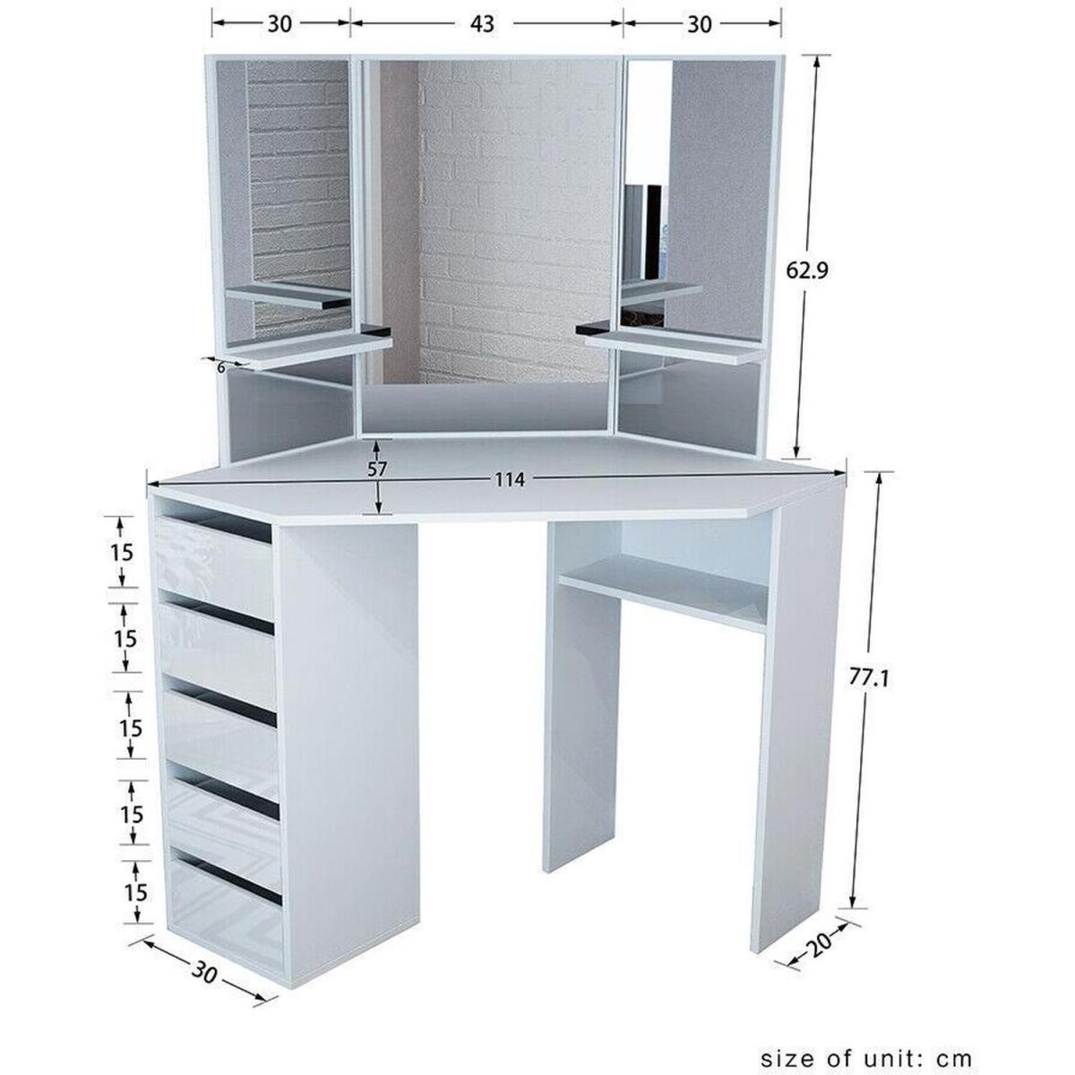 This corner dressing table has a graceful design with a large tabletop which offers a fantastic storage capacity for all your jewellery, treasures and makeup. Featuring 3 mirrors to provide you with a panoramic angle to appreciate your beauty. And the 5 drawers on the left side provide additional storage space to store your precious jewellery and cosmetics. Additionally, the matching stool finishes this dressing table off. Made from MDF, its strong and solid construction will provide an excellent experience for your home. The beautifully crafted dressing table is sure to make a big impression on your bedroom.