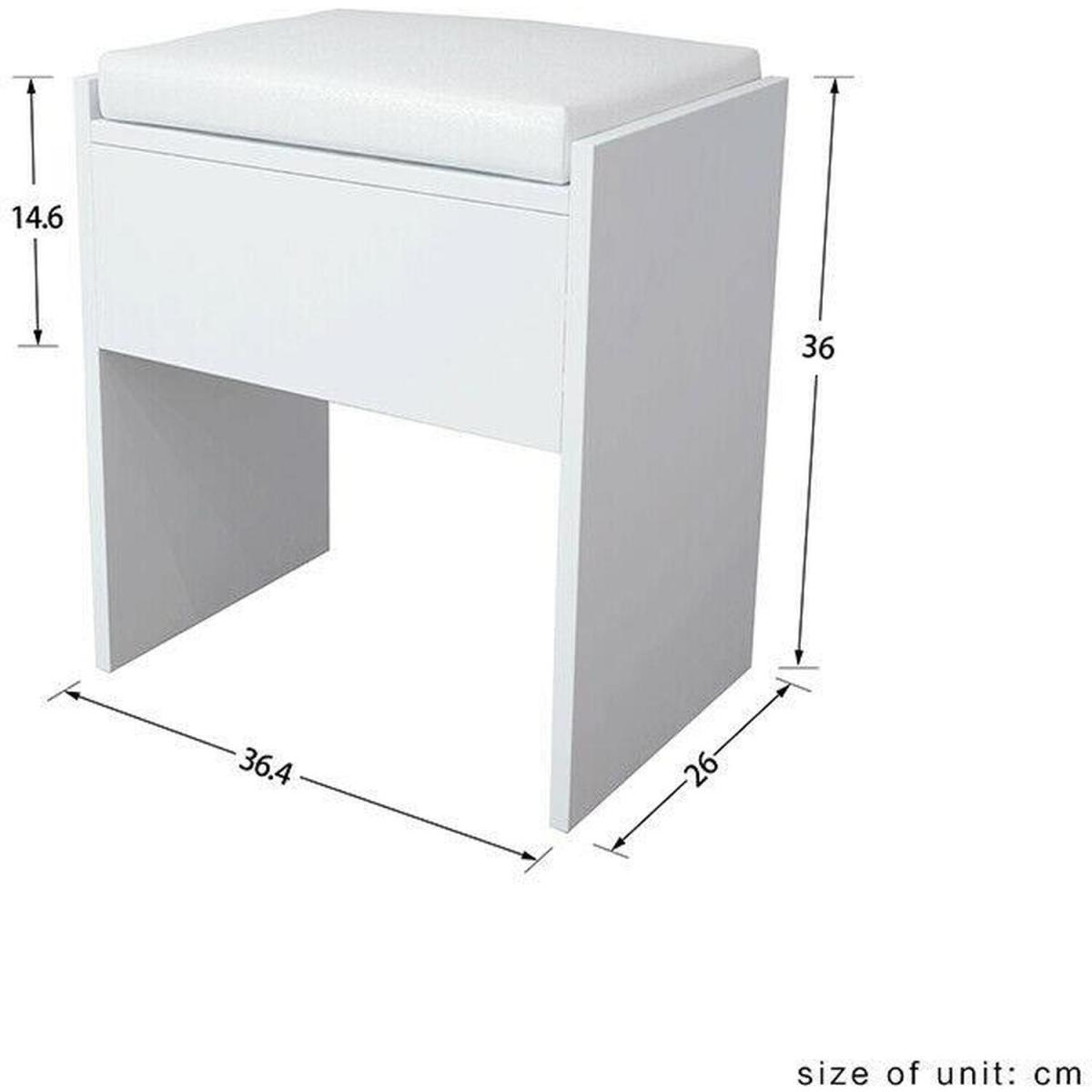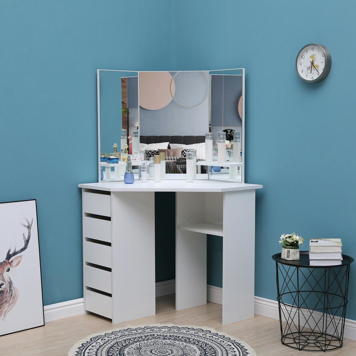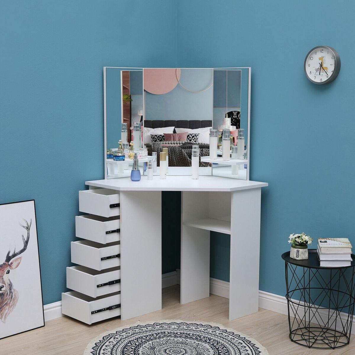 This corner dressing table has a graceful design with a large tabletop which offers a fantastic storage capacity for all your jewellery, treasures and makeup. Featuring 3 mirrors to provide you with a panoramic angle to appreciate your beauty. And the 5 drawers on the left side provide additional storage space to store your precious jewellery and cosmetics. Additionally, the matching stool finishes this dressing table off. Made from MDF, its strong and solid construction will provide an excellent experience for your home. The beautifully crafted dressing table is sure to make a big impression on your bedroom.