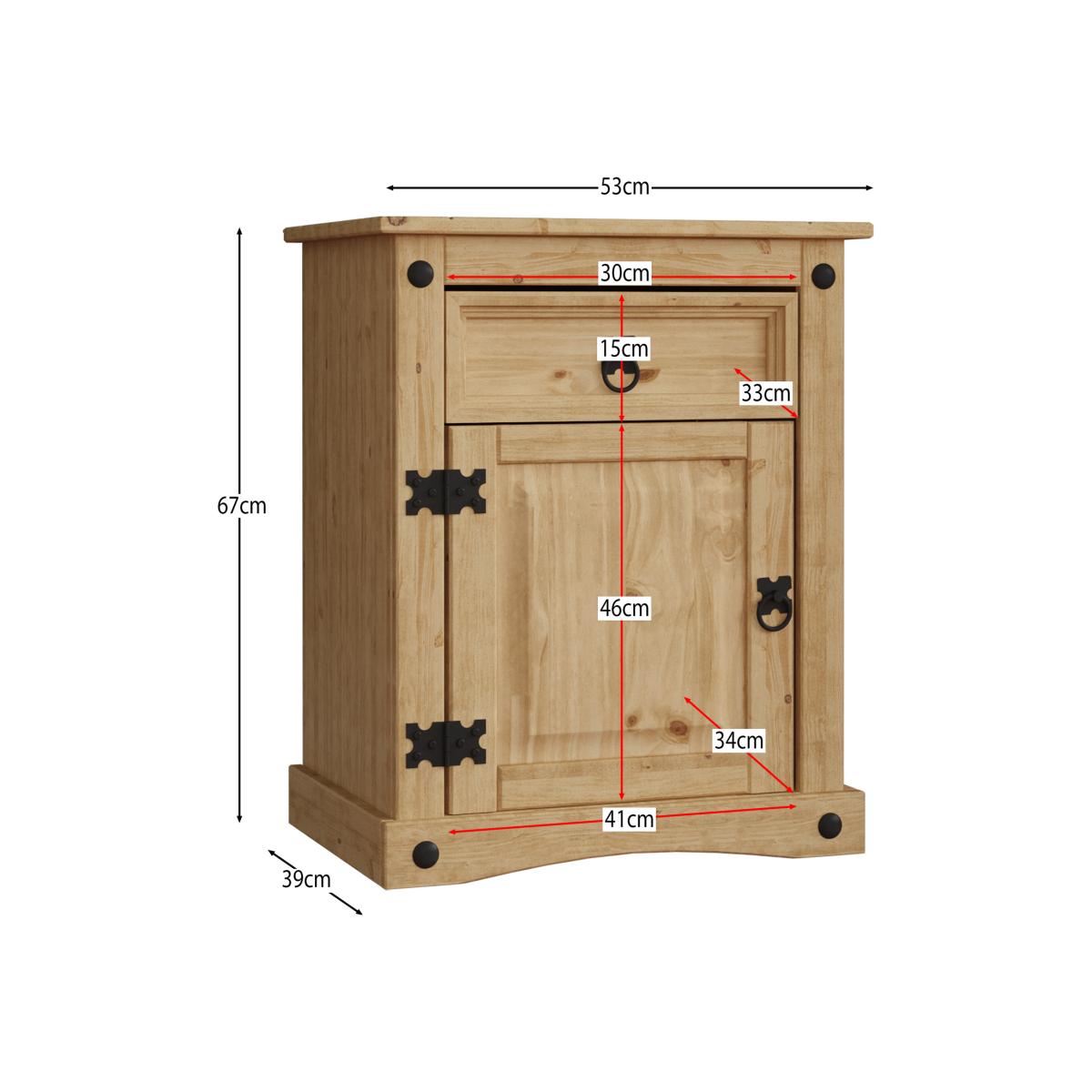 The Corona 1 Drawer 1 Door Bedside Cabinet with a modern Mexican style features black metal fittings with decorative studs and a waxed finish that lifts the grain of the wood creating a distressed rustic look. It has one drawer for all your smaller items that you like to keep close at hand and a cupboard below which comes in ideal for storing books or magazines. The top of the cabinet is big enough to hold a bedside lamp, alarm clock or anything else you might need by your bed. The cabinet frame and drawer are solid pine with sturdy plywood.