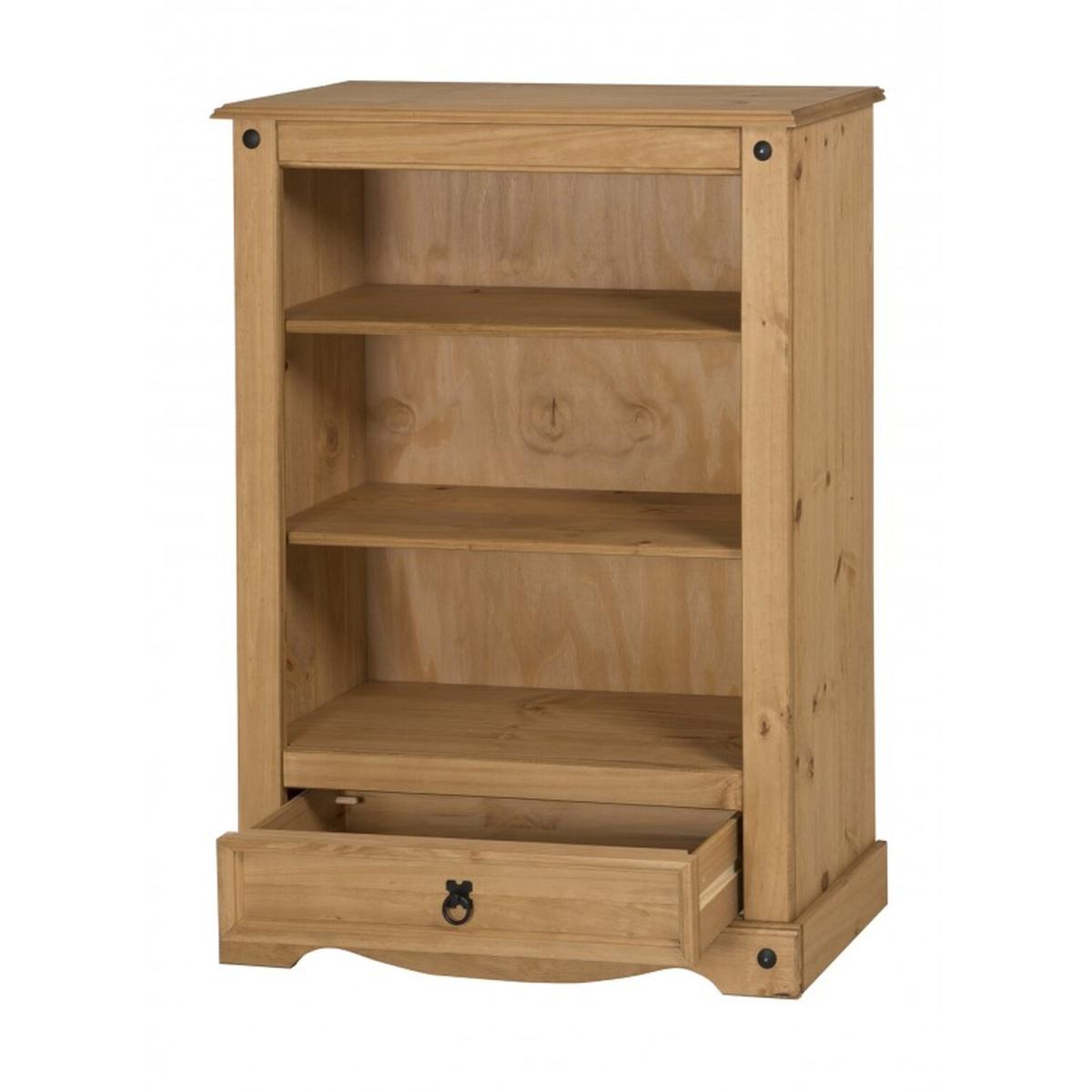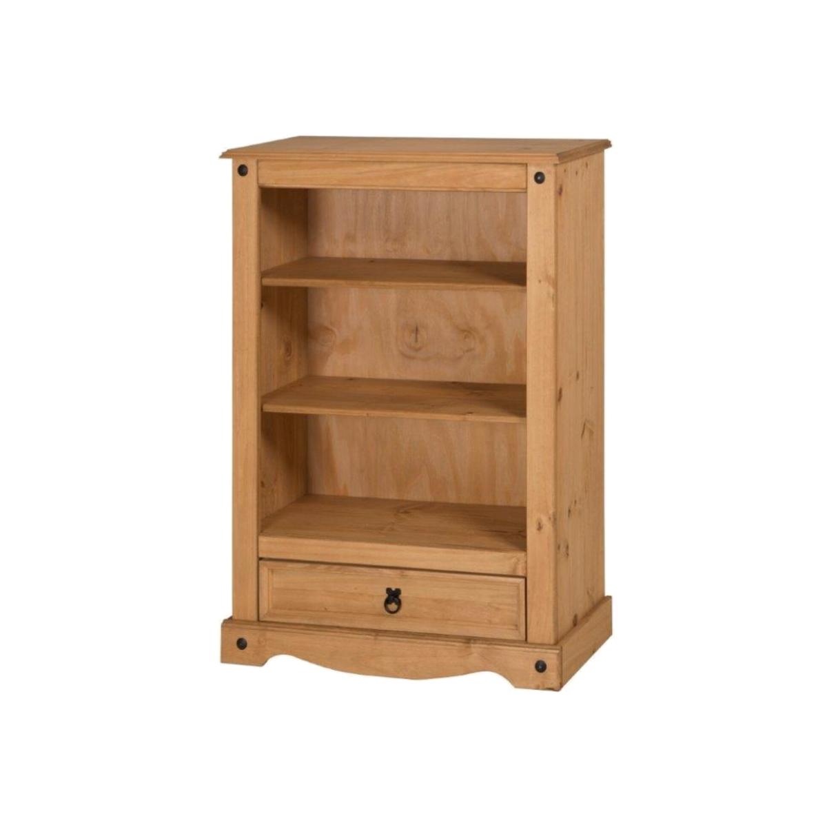 Mercers Furniture is happy to offer this Corona 1 Drawer Bookcase, expertly crafted from solid pine and hand waxed to preserve as well as enhance the grain. It offers outstanding value for money that would be a welcome addition to any home. The item is finished off with black metal fittings which give a distinctive Mexican styling and offers that warm rustic country charm. The item has hardboard backs and drawer bases, its delivered flat packed for easy home assembly with step-by-step instructions. Height - 110cm. Width - 81cm. Depth - 30cm