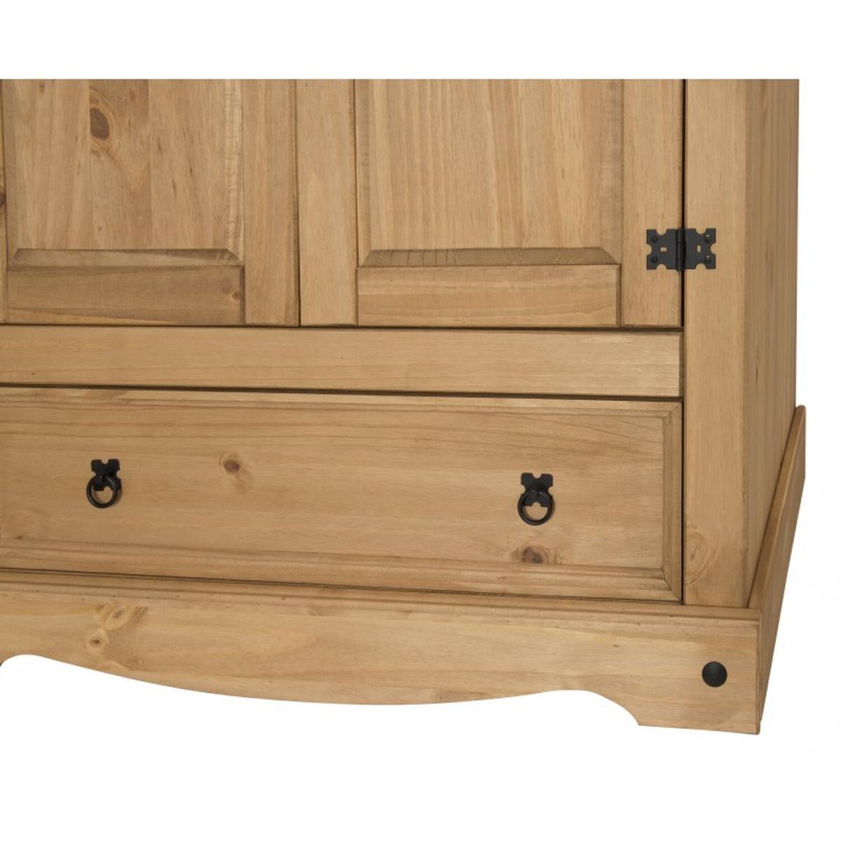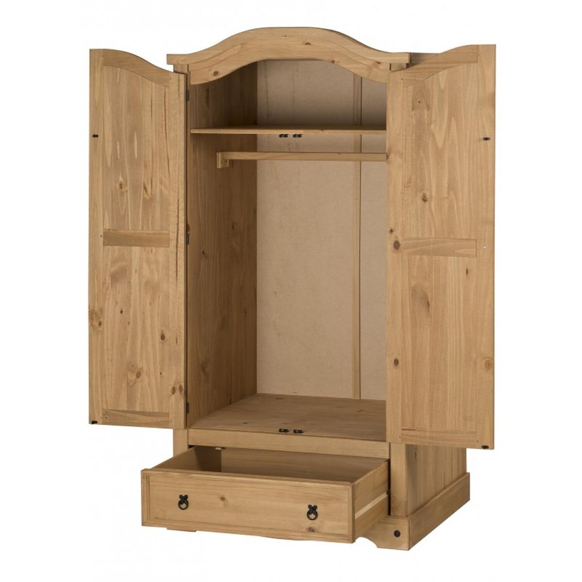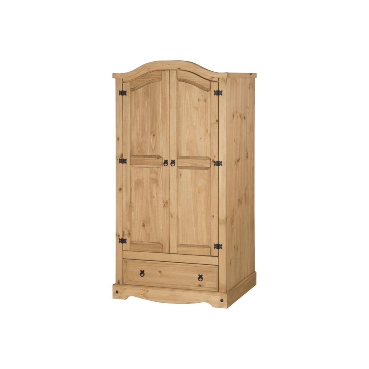 Mercers Furniture is happy to offer this Corona 2 Door 1 Drawer Arch Top Robe, the wardrobe is expertly crafted from solid pine and hand waxed to preserve as well as enhance the grain. It offers outstanding value for money with 2 doors and 1 drawer that would be a welcome addition to any bedroom. It is finished off with black metal fittings which give the item its distinctive Mexican styling and offers that warm rustic country charm. The item has hardboard backs and drawer base, its delivered flat packed for easy home assembly with step-by-step instructions.