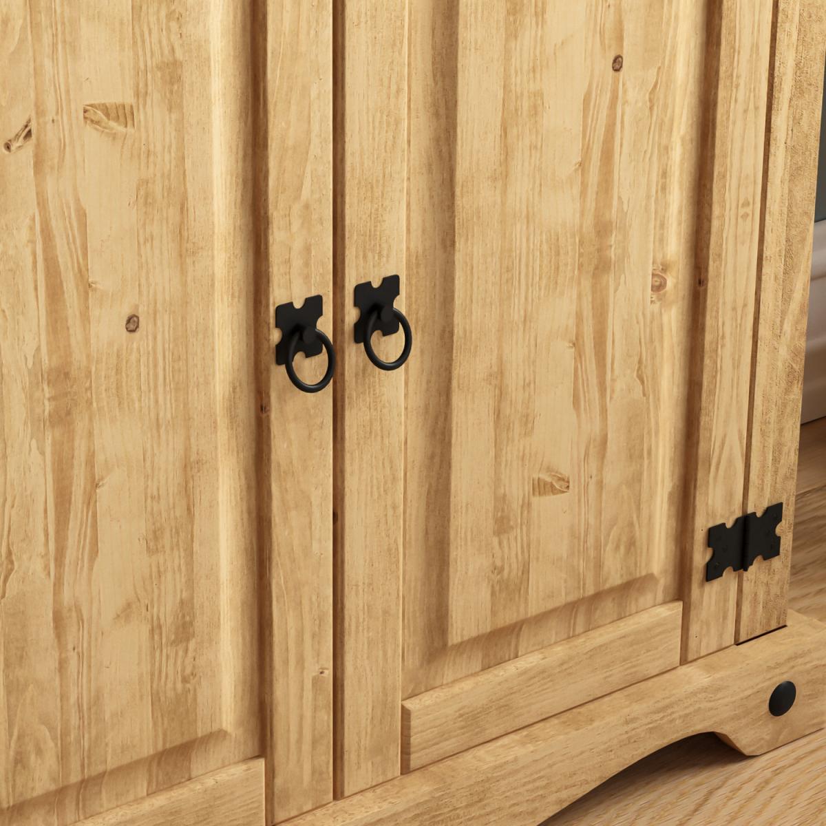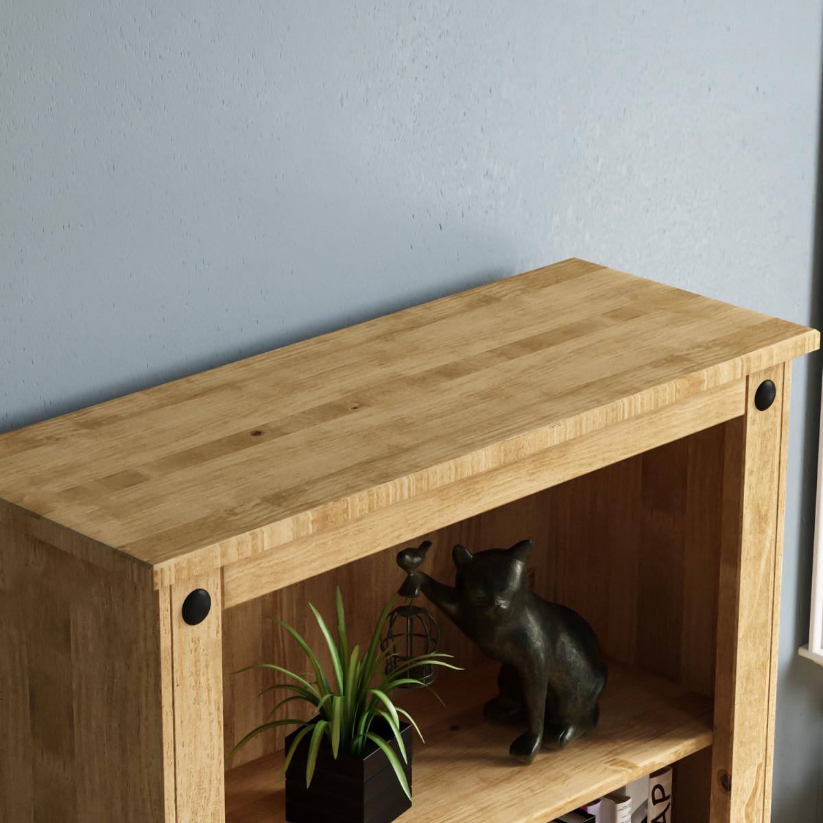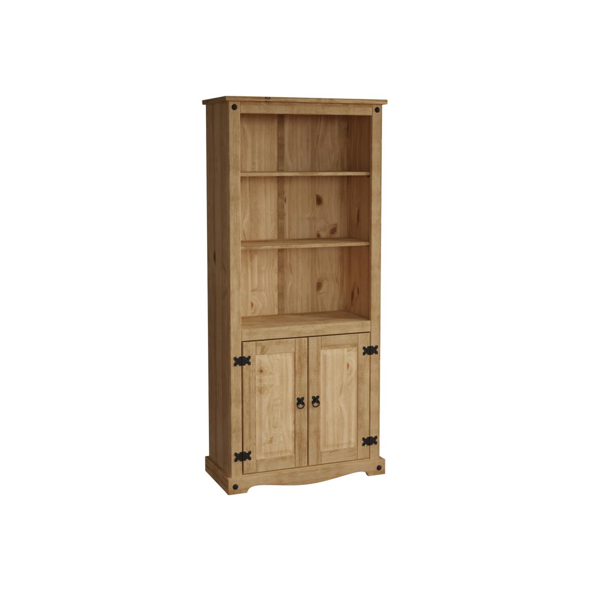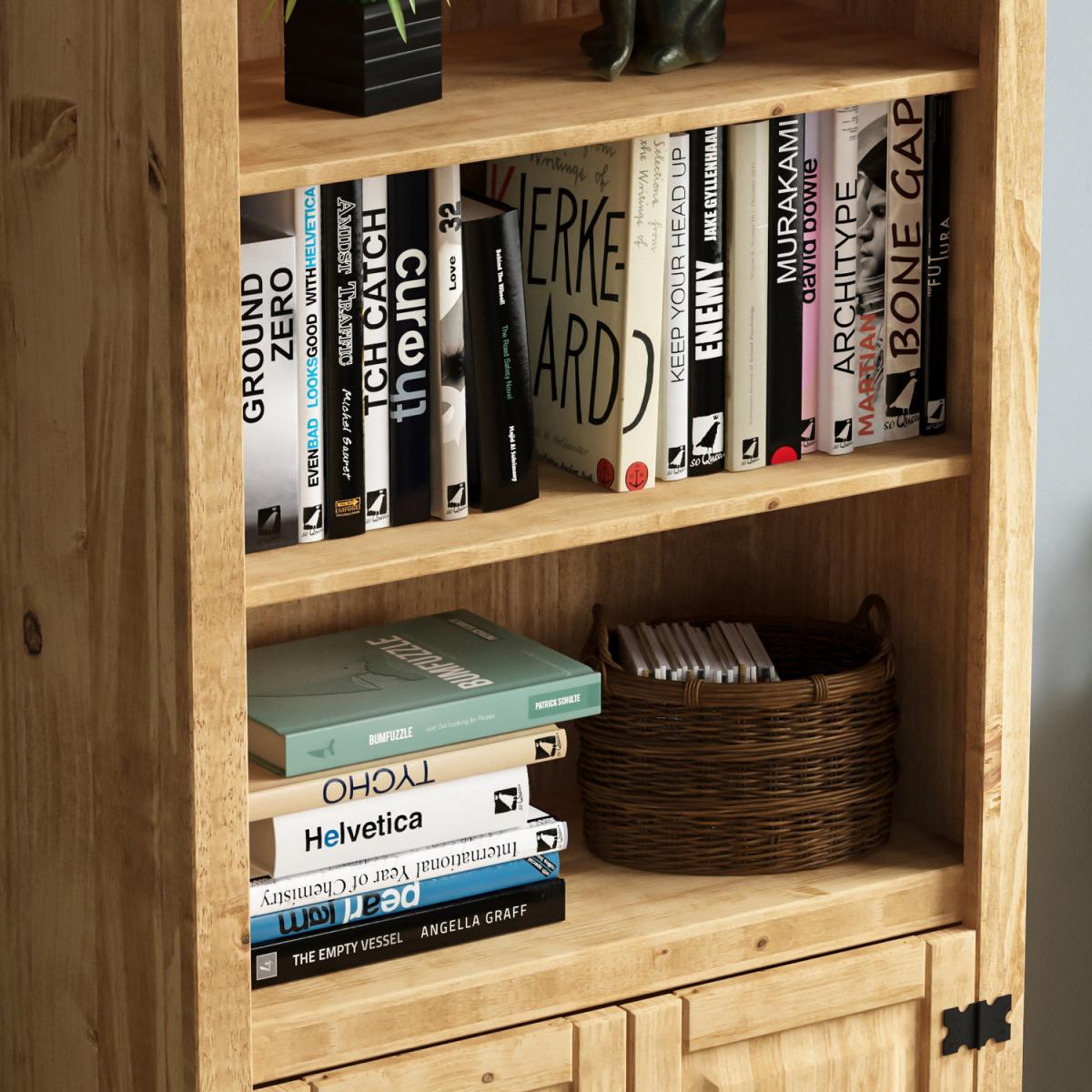 Corona 2 Door Bookcase features three tiers along with a cupboard, offering plenty of space for storage and display. Bookcase boasts a vintage rustic style that is complemented with decorative black metal studs, drop ring handles and an attractive curved base plinth. The clear wax finish protects and preserves the timbers as well as shows off the beauty of the wooden grain.