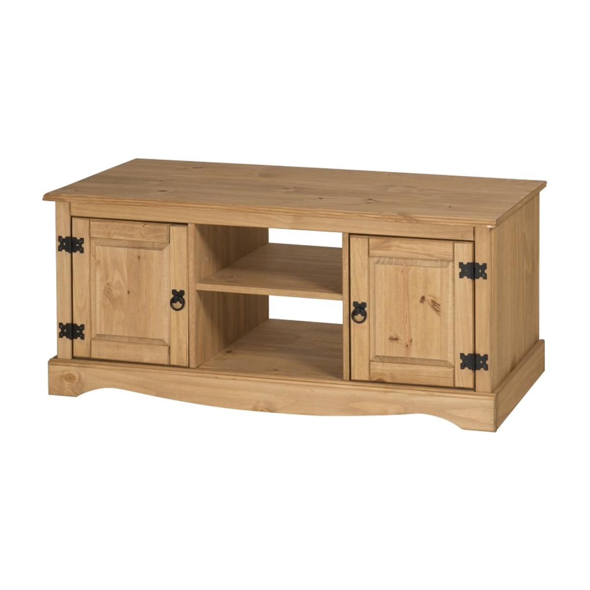 Mercers Furniture is happy to offer this Corona 2 Door Flat Screen Media TV Unit, expertly crafted from solid pine and hand waxed to preserve as well as enhance the grain. With an open shelves and 2 doors it offers outstanding value for money that would be a welcome addition to any home. The item is finished off with black metal fittings which give a distinctive Mexican styling and offers that warm rustic country charm. The item has hardboard backs and is delivered flat packed for easy home assembly with step-by-step instructions. Height - 52cm. Width - 115cm. Depth - 40cm