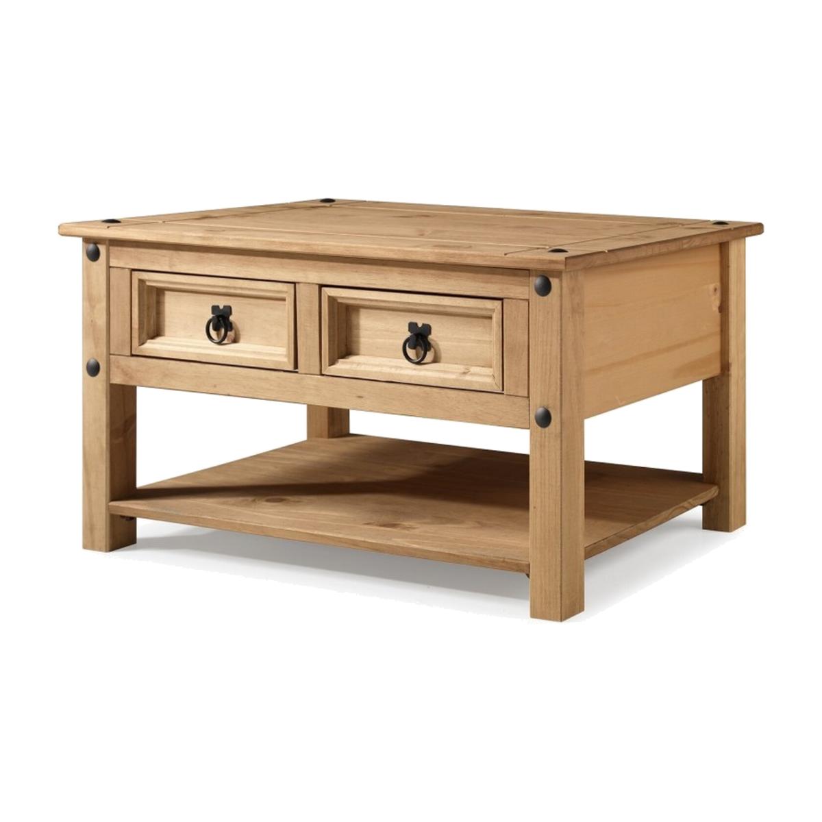 Mercers Furniture is happy to offer this Corona 2 Drawer Coffee Table, expertly crafted from solid pine and hand waxed to preserve as well as enhance the grain. It offers outstanding value for money that would be a welcome addition to any home. Includes 2 drawers for extra storage the item is finished off with black metal fittings which give a distinctive Mexican styling and offers that warm rustic country charm. The item has hardboard drawer bases, its delivered flat packed for easy home assembly with step-by-step instructions.