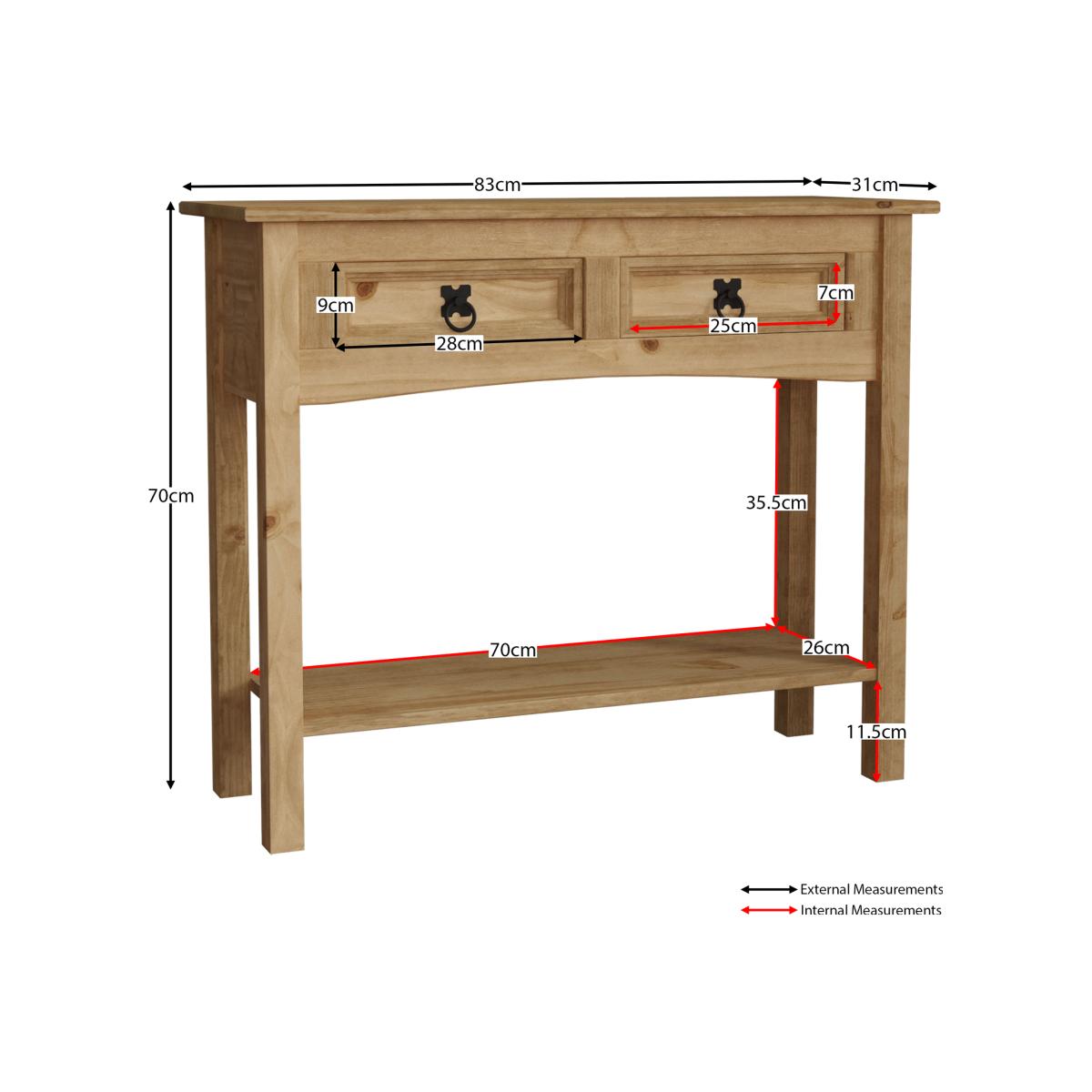 This stunning new product, the Corona 2 Drawer Waxed Pine Console Table With Shelf, is constructed from pine, which will make you feel confident that this hardy console table won't look or feel cheap, despite the incredibly affordable price. It fills a larger space with this 2 drawer console table which has a handy shelf that adds extra storage. Furthermore, this table has a clear wax finish that not only protect and preserves the wood but it also gives it a distressed appearance which add to its unique design.