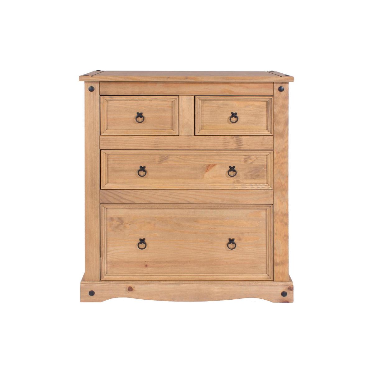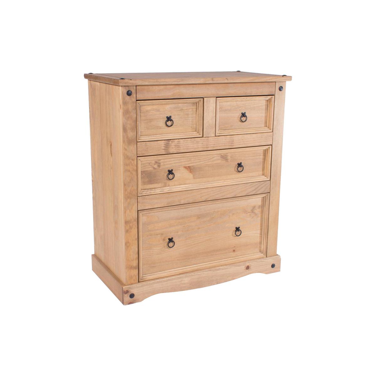 A beautifully finished chest of four spacious drawers with a rustic solid oak build. The Corona 2 Over 2 Chest of Drawers provides four practical drawers of varying sizes to store your clothes and accessories neatly. This chest of drawers is built from solid pine with sturdy dovetail joints and pine faced plywood drawer bases to offer durability and style. The design is traditionally rustic for a warm and homely feel. Installation Note: This product should be fixed to a wall using a wall fastener. Please note, unfortunately we cannot deliver this item to the Channel Islands.