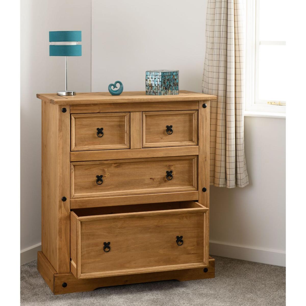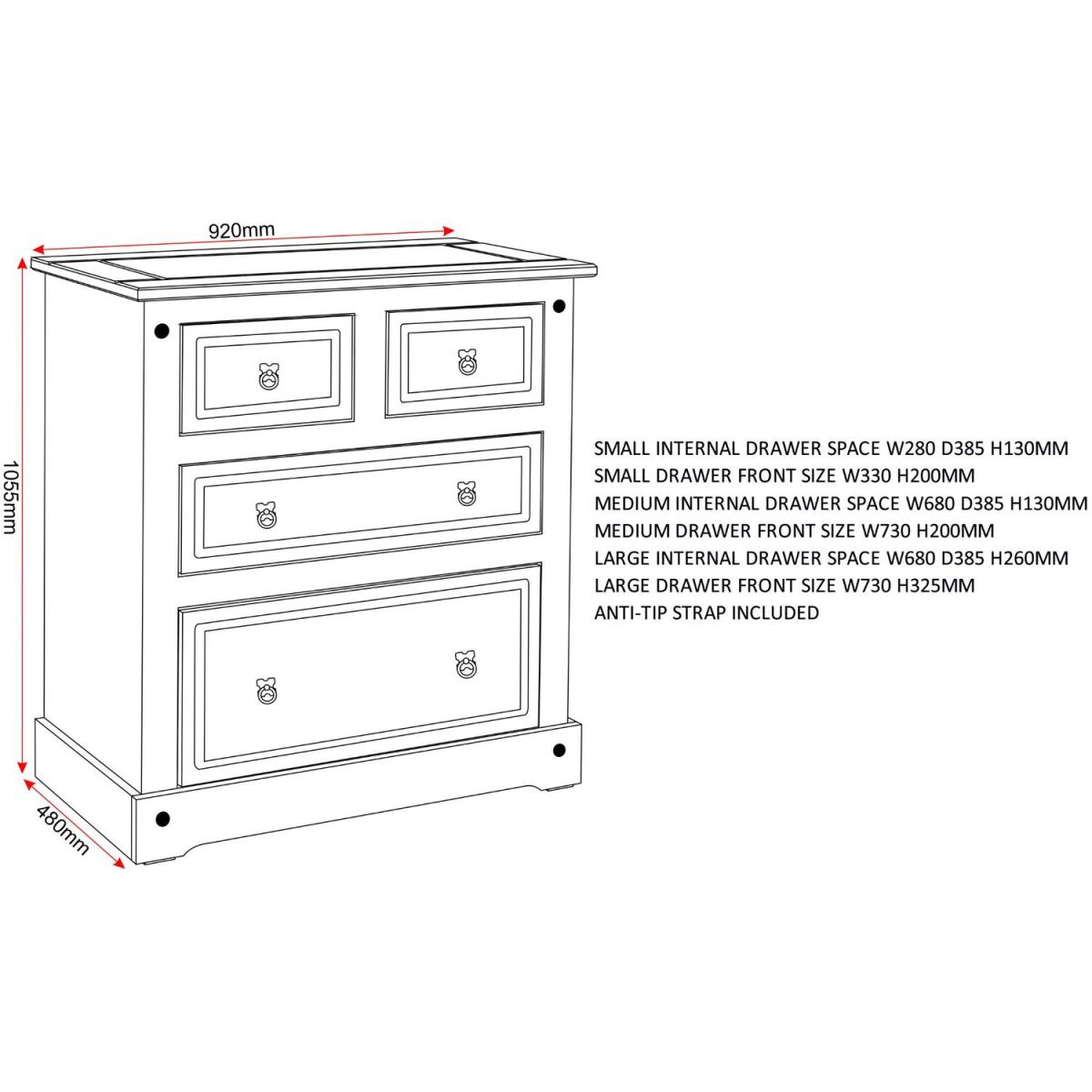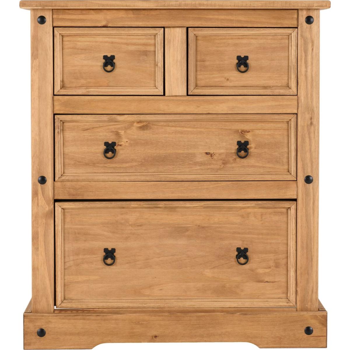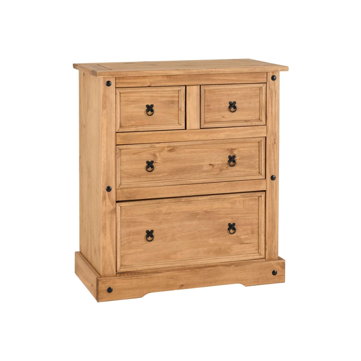 A beautifully finished chest of four spacious drawers with a rustic solid oak build. The Corona 2 Over 2 Chest of Drawers provides four practical drawers of varying sizes to store your clothes and accessories neatly. This chest of drawers is built from solid pine with sturdy dovetail joints and pine faced plywood drawer bases to offer durability and style. The design is traditionally rustic for a warm and homely feel. UK Mainland delivery only, between 9am - 9pm (weekdays) the courier will contact you on the day of delivery to offer a time slot. This takes place within 10 working days (Ground floor only). Please also ensure that we have a note of your up-to-date address and contact information, including daytime phone number and email address to be passed to the couriers.