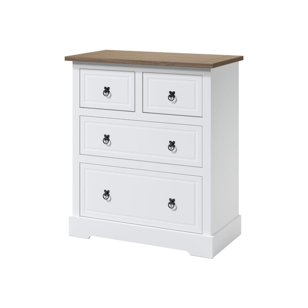 This Corona chest of 4 drawers is an ideal addition to your bedroom or living area, with 2 compact drawers and 2 larger ones below those, you have an ample amount of space to keep all your belongings neat. Constructed using MDF and a solid 25mm pine wood waxed top, it features contrasting metal handles and detailing. The furniture also has a UV Lacquer for added protection and ease of cleaning.