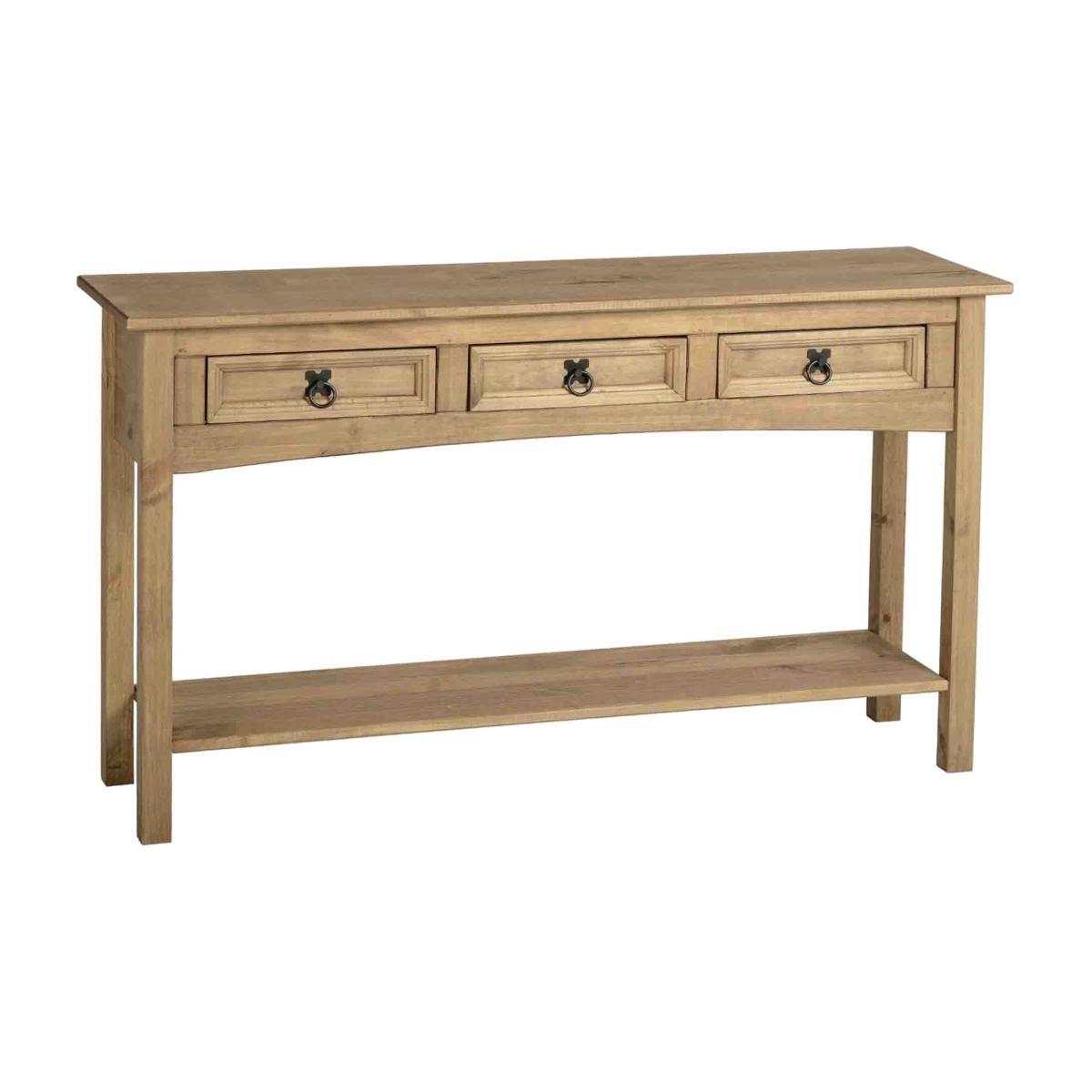 The Seconique Corona 3 Drawer Console Table with Shelf boasts a beautiful distressed waxed pine finish that will bring a whole new look to your home. The attractive design with metal drop handles and the rich colour of the wood make it a superb piece of furniture to look at that is also highly functional. With three spacious drawers, there’s plenty of room to store your belongings. Please note, unfortunately we cannot deliver this item to the Channel Islands.