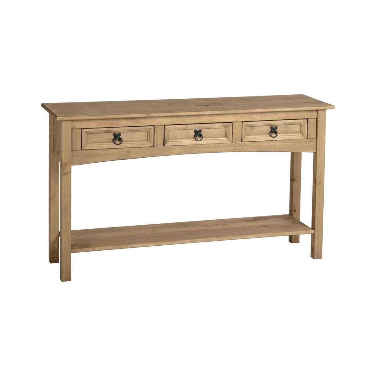 The Seconique Corona 3 Drawer Console Table with Shelf boasts a beautiful distressed waxed pine finish that will bring a whole new look to your home. The attractive design with metal drop handles and the rich colour of the wood make it a superb piece of furniture to look at that is also highly functional. With three spacious drawers, there’s plenty of room to store your belongings. Please note, unfortunately we cannot deliver this item to the Channel Islands.