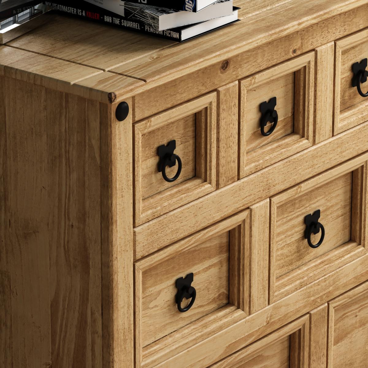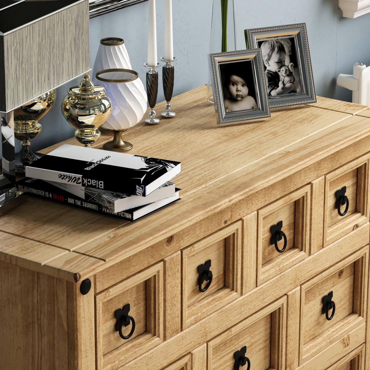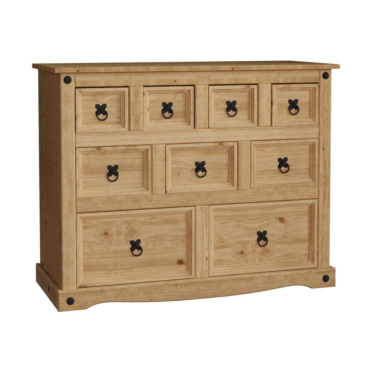 This expertly crafted Corona Merchant Chest would look perfect in any bedroom or living room or even placed near your workstation. This chest is constructed from solid pine and waxed finish gives it a vintage rustic look. It features four smaller drawers at the top, three medium sized drawers in the middle and two wide drawers at the bottom. Merchant chest is suitable to house all kind of items.