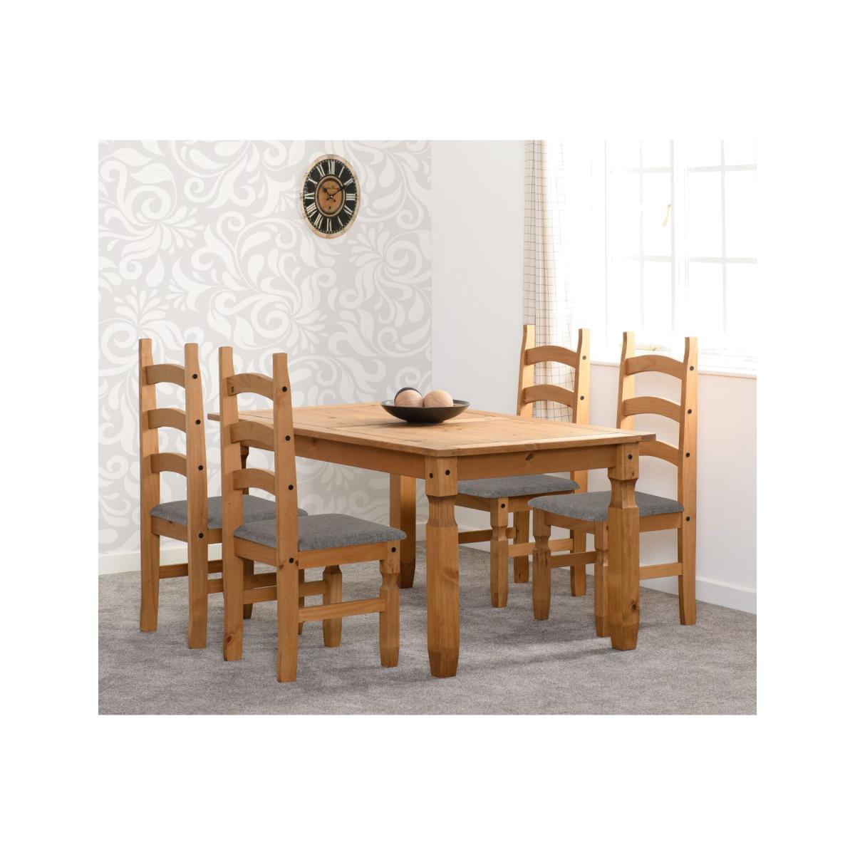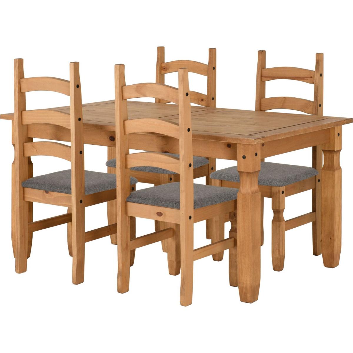 This expertly crafted Mexican style dining set boasts a waxed wood finish and ornate black detailing to go with it. This traditional pine dining set would be a welcome addition to your home and features a table and 4 matching chairs with grey fabric seat pads for your family and friends. The thick sturdy legs of the chairs are hard wearing and carved in such way to compliment the integral ethnic charm of the furniture. UK Mainland delivery only, between 9am - 9pm (weekdays) the courier will contact you on the day of delivery to offer a time slot. This takes place within 10 working days (Ground floor only). Please also ensure that we have a note of your up-to-date address and contact information, including daytime phone number and email address to be passed to the couriers.