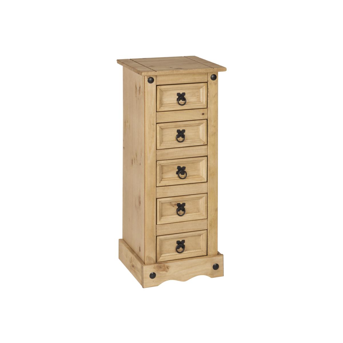 With trademark Corona Pine features, the Corona 5 Drawer Tall Chest gives ample storage for your bedroom. The waxed pine top gives a practical surface to rest your lamp, book or drink on. The 5 drawers are large enough to stow away sentimental items or other bits and bobs you might like to have to hand. The ornate black handles and studs give the bedside a rustic country look. The bedside cabinet is designed similar to other items in the Corona range, so why not match this Corona 5 Drawer Tall Chest with the Corona 2+2 Chest of Drawers to create a beautiful country style room.