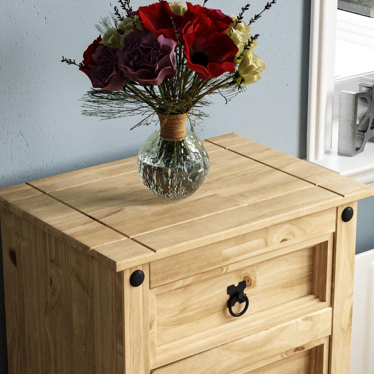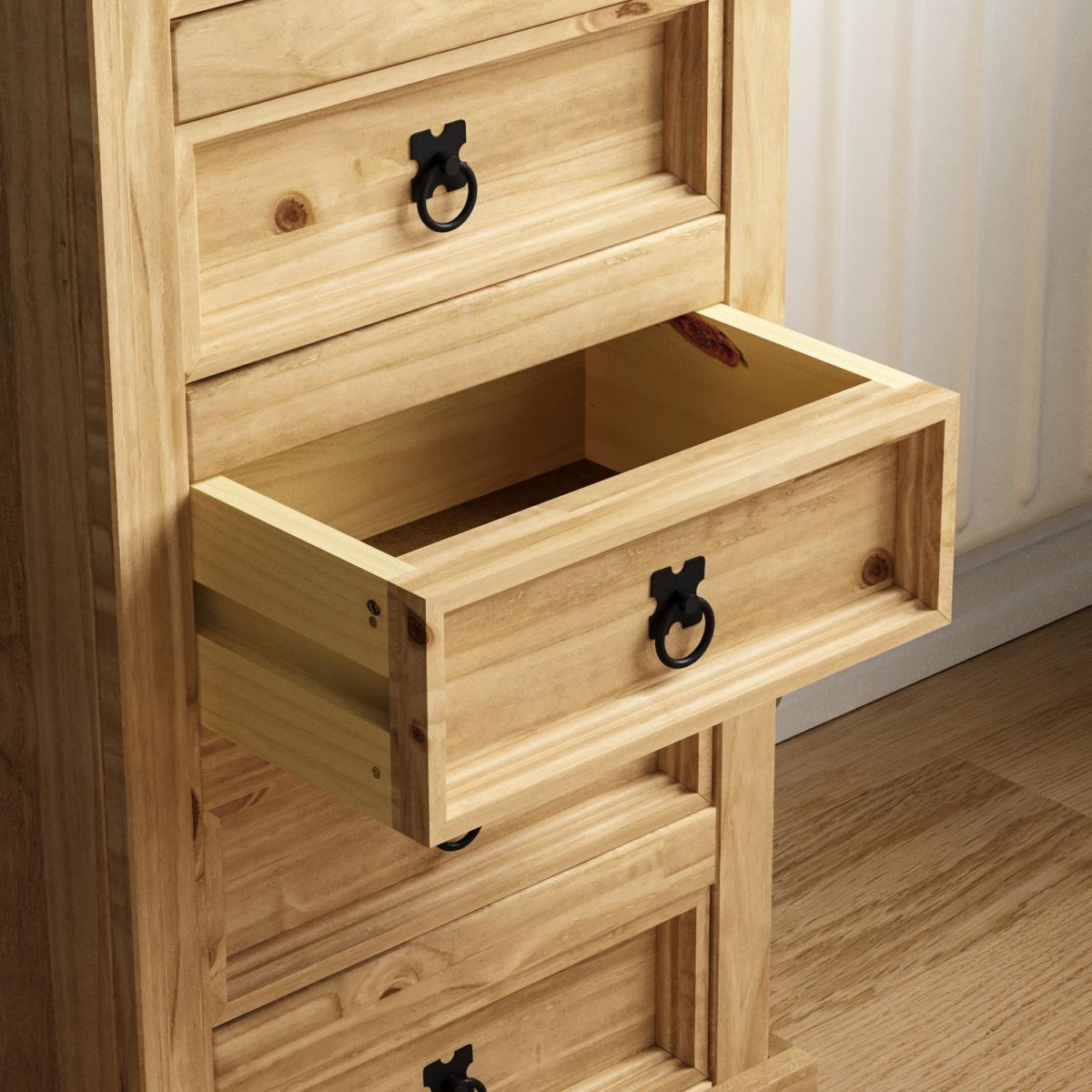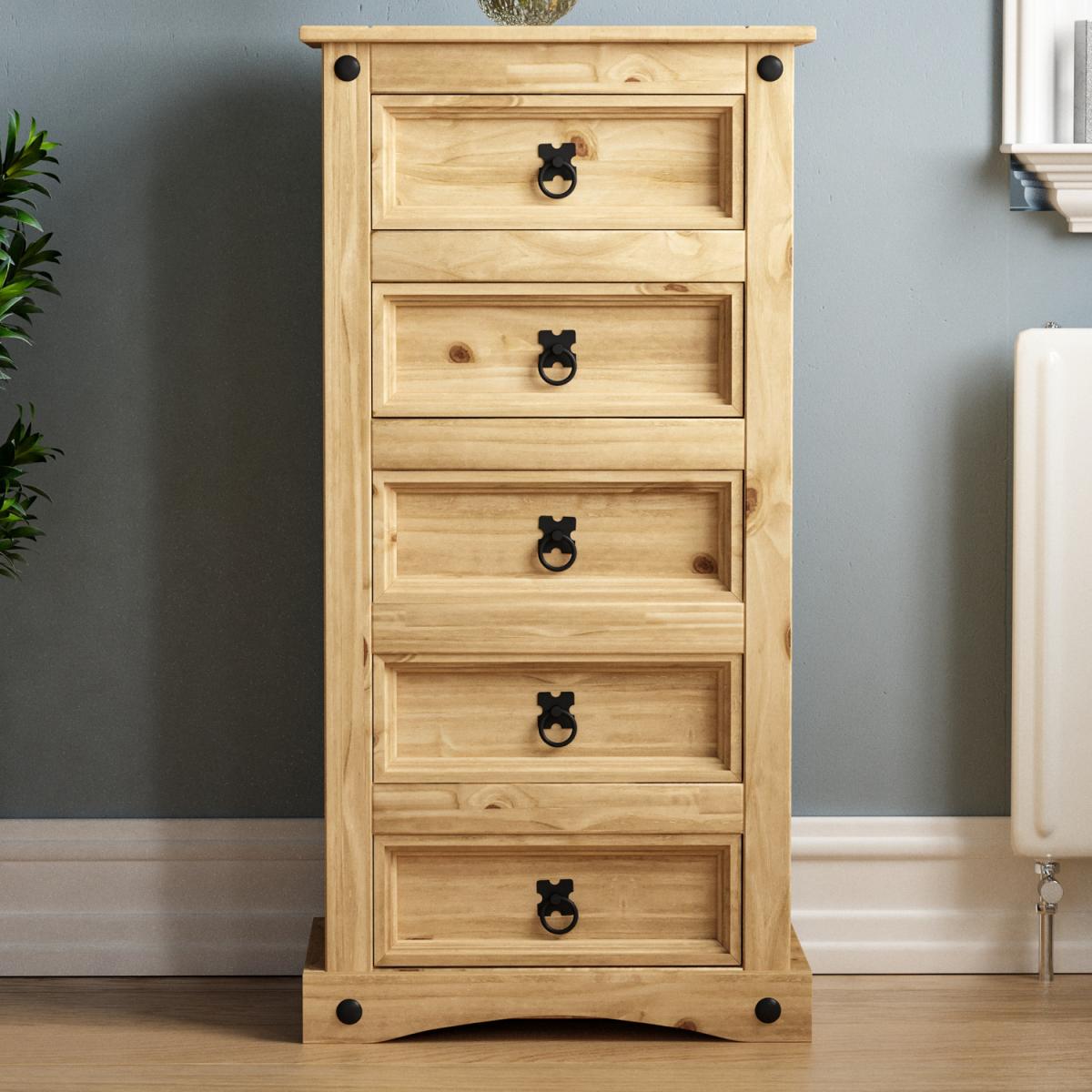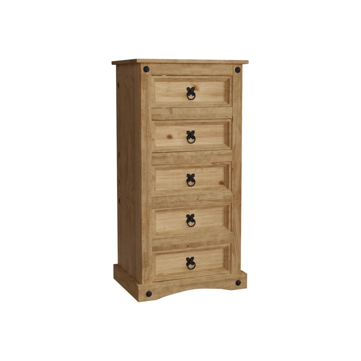 This Corona 5 Drawer Narrow Chest is tall and slender but still offers plenty of storage capacity without taking up too much room. This chest of drawers is notable for its distressed waxed pine finish that helps to show off the wooden grain and enhance rustic vibe. Furthermore, it has 5 beautifully carved metal drop ring handles.