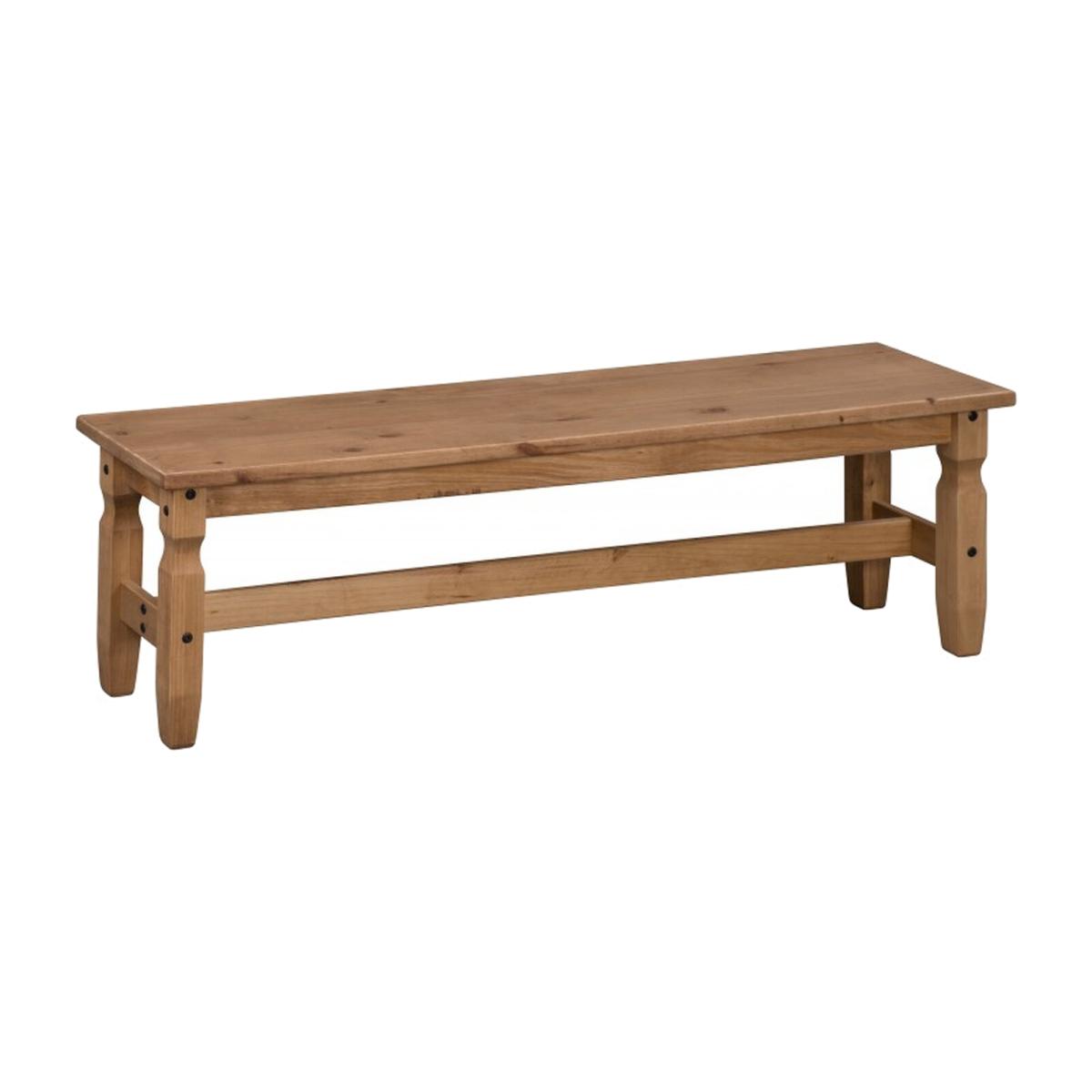 Mercers Furniture is happy to offer this Corona 5'0" Bench, expertly crafted from solid pine and hand waxed to preserve as well as enhance the grain. It offers outstanding value for money that would be a welcome addition to any home. The bench is finished off with black metal fittings which give the dining set its distinctive Mexican styling and offers that warm rustic country charm. The item is supplied flat packed for easy home assembly with step-by-step instructions. Height - 45cm. Width - 153cm. Depth - 38cm