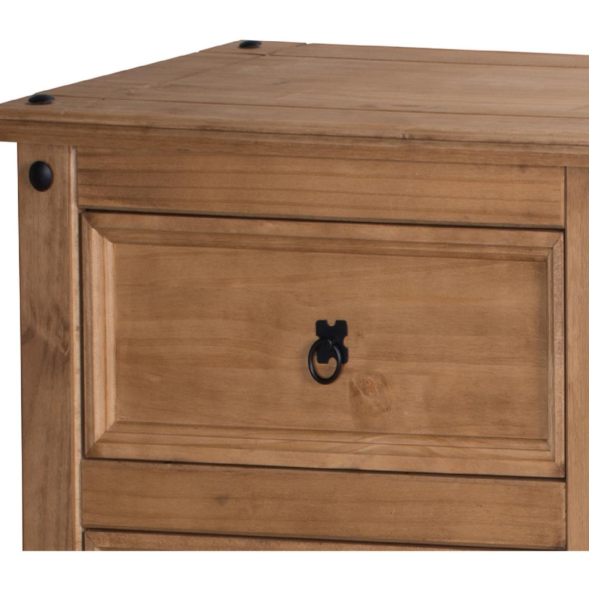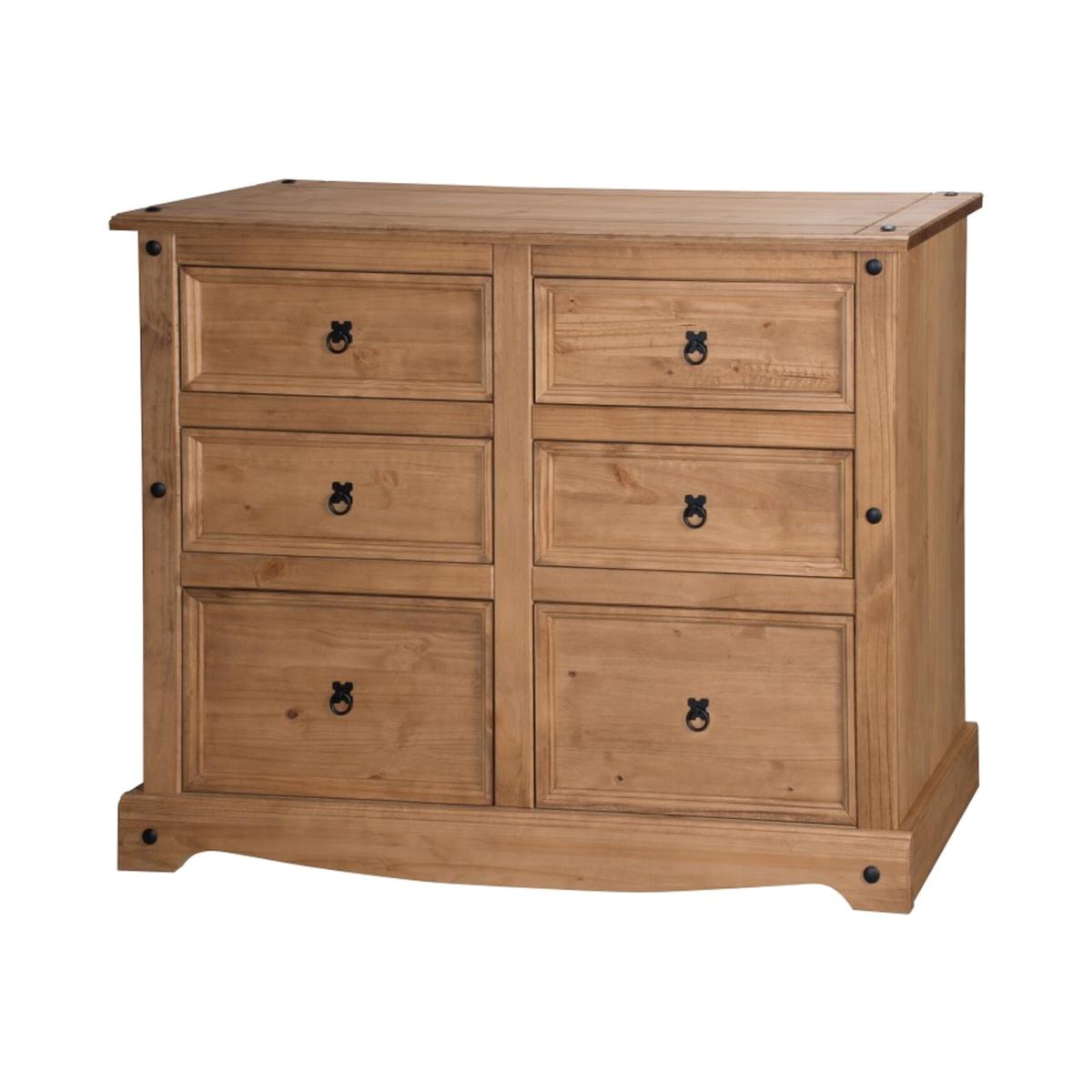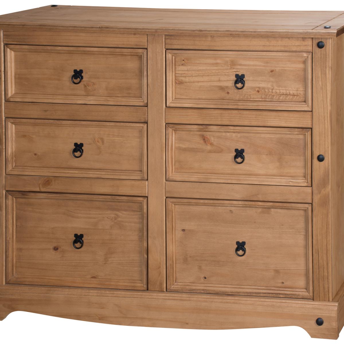 Mercers Furniture is happy to offer this Corona 6 Drawer Wide Chest, the item is expertly crafted from solid pine and hand waxed to preserve as well as enhance the grain. It offers outstanding value for money with 6 drawers that would be a welcome addition to any room. It is finished off with black metal fittings which give the item its distinctive Mexican styling and offers that warm rustic country charm. The item has hardboard backs and drawer bases, its delivered flat packed for easy home assembly with step-by-step instructions. Height - 103cm. Width - 133cm. Depth - 48cm