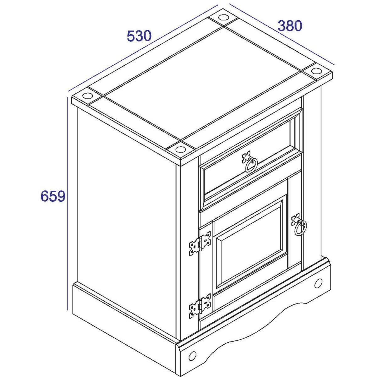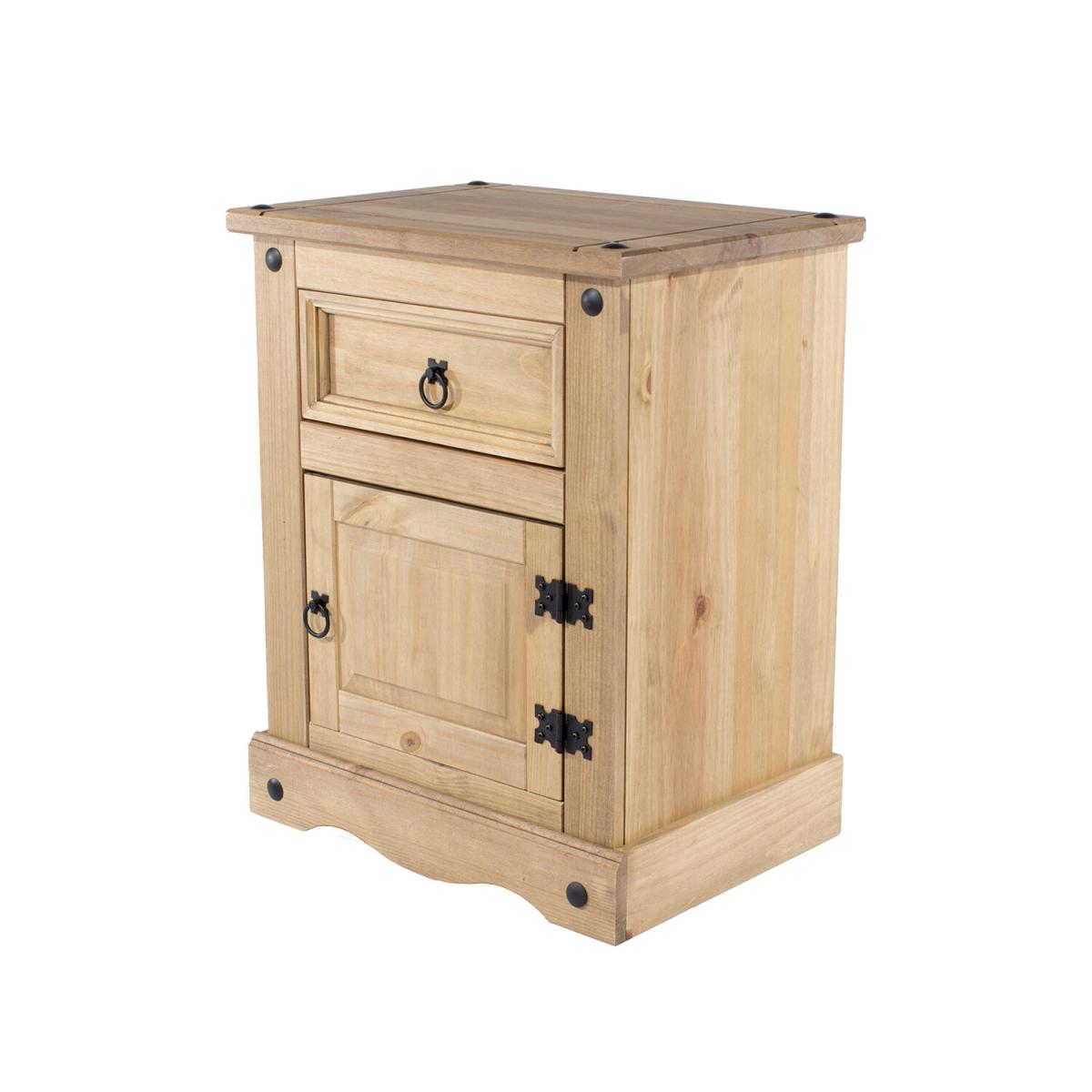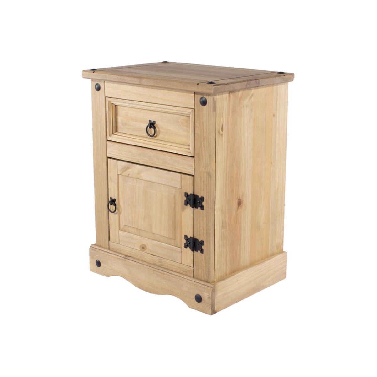 Constructed from pine with a beautiful antique wax finish and decorated with exposed black metal studs, hinges, and handles, the Corona Bedside Cabinet is an attractive unit that will lend itself to most bedroom styles. Part of a matching furniture collection with other fully -coordinating pieces available for your home. This bedside unit provides plenty of space to store your belongings within its one drawer and one cupboard design and will look great positioned either side of your bed. The door can be hung on either the left or right hand side of the unit for maximum flexibility.