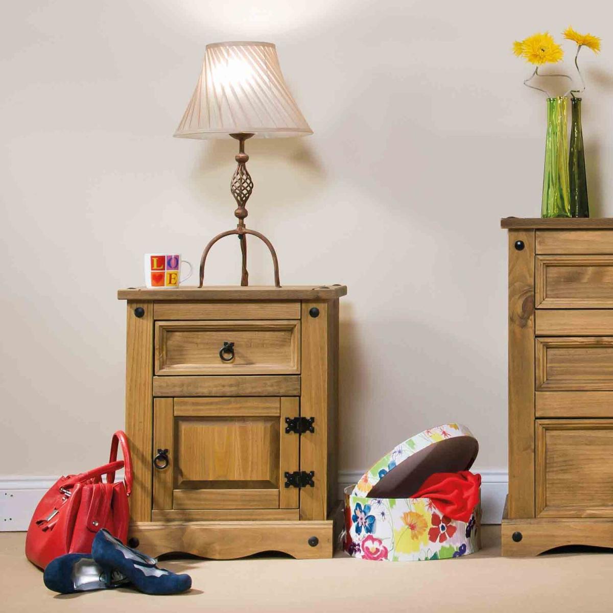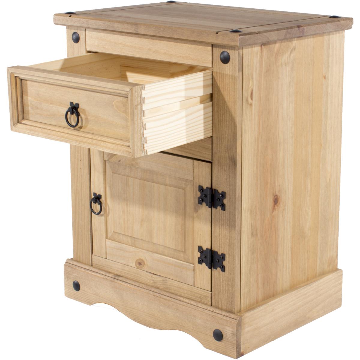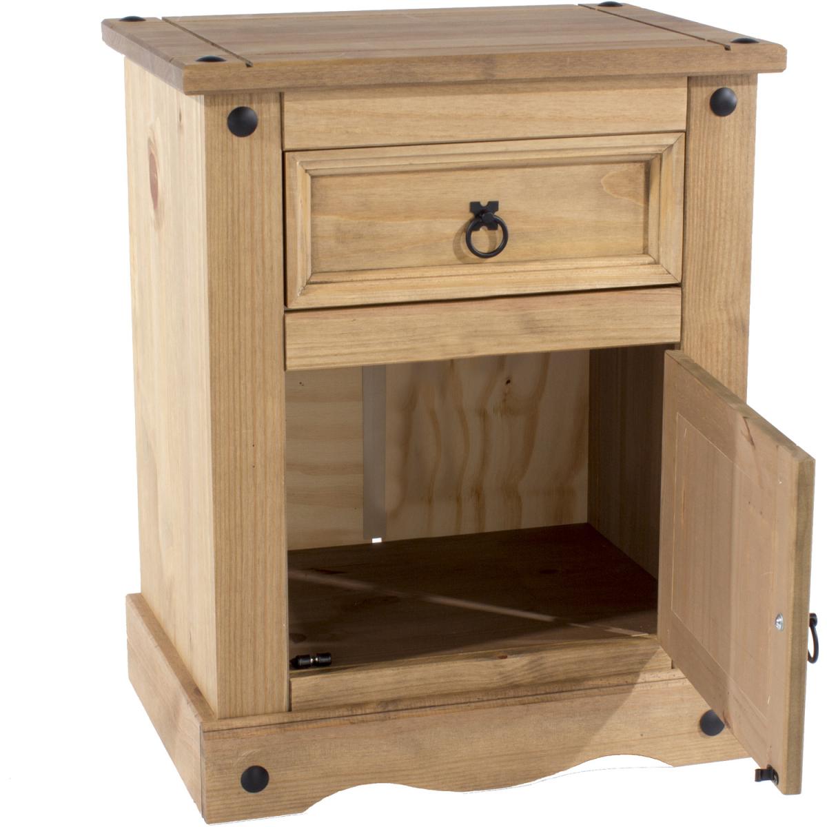 Constructed from pine with a beautiful antique wax finish and decorated with exposed black metal studs, hinges, and handles, the Corona Bedside Cabinet is an attractive unit that will lend itself to most bedroom styles. Part of a matching furniture collection with other fully -coordinating pieces available for your home. This bedside unit provides plenty of space to store your belongings within its one drawer and one cupboard design and will look great positioned either side of your bed. The door can be hung on either the left or right hand side of the unit for maximum flexibility.