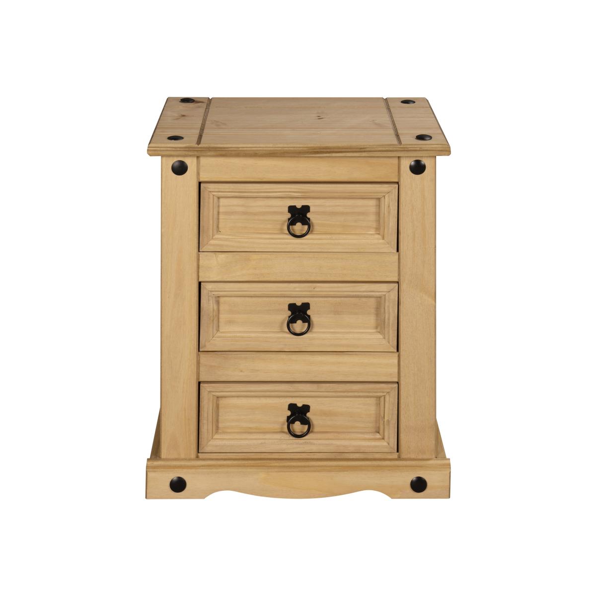 The Corona bedside table 3 Drawers in waxed pine finish is a practical and stylish addition to any bedroom. Crafted from high-quality pine wood, this bedside cabinet is durable and built to last. Featuring three spacious drawers, this bedside table provides ample storage space for all your bedside essentials, from books and magazines to your phone and charging cables.